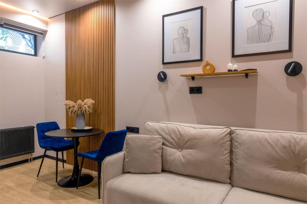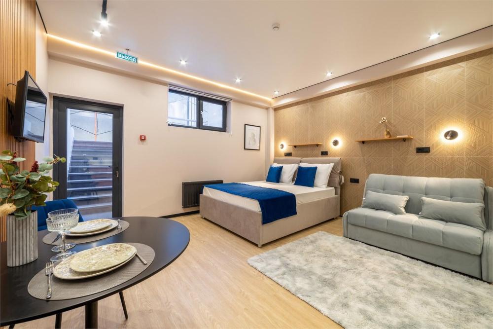 Уютный однокомнатный номер с двуспальным диваном и кухонной зоной, расположенный на цокольном этаже отеля.