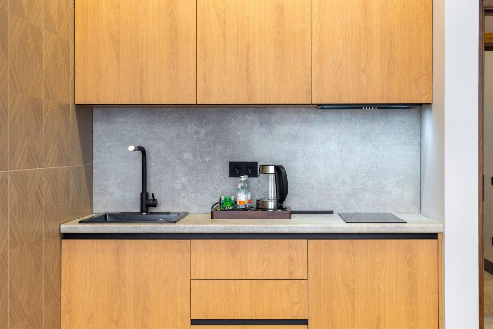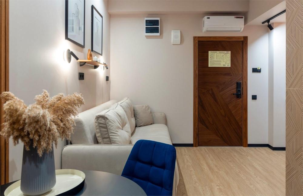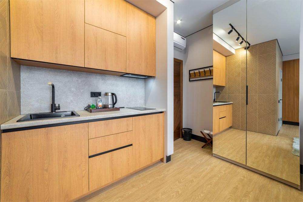 Комфортный однокомнатный номер с раскладным диваном и кухонной зоной.