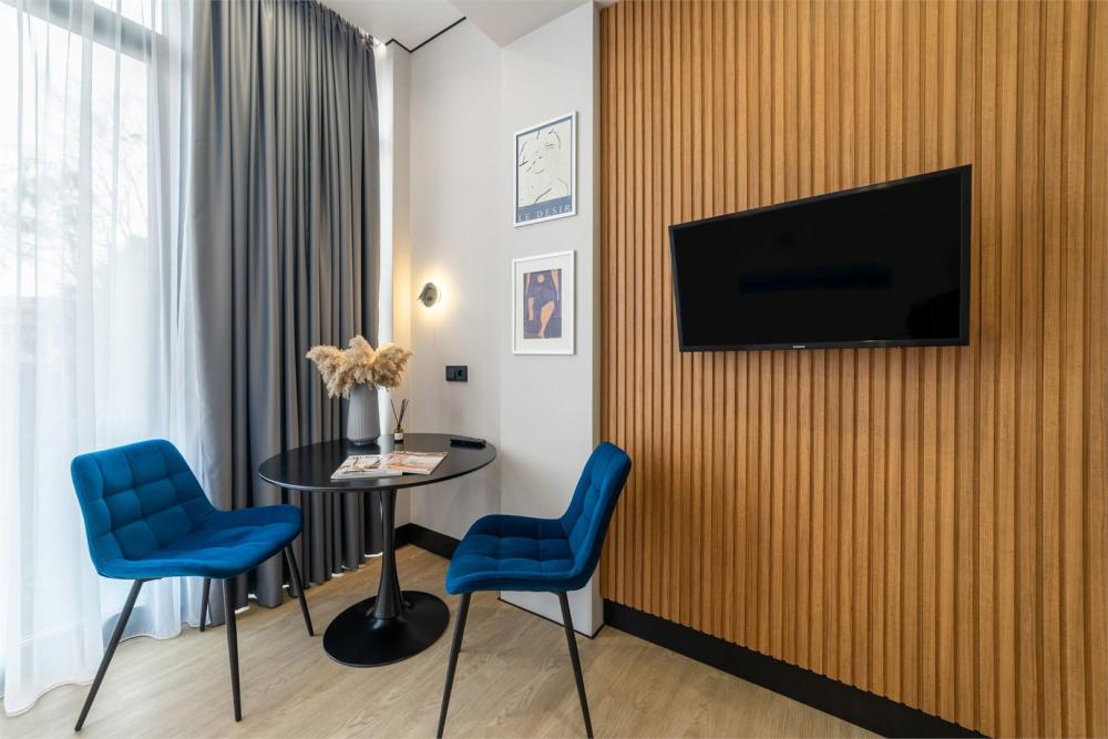 Единственный в отеле номер-студия располагает комфортабельной кроватью, диваном и оборудованной кухонной зоной, ванная комната оснащена душевой кабиной и стиральной машиной. Апартамент имеет современный и лаконичный дизайн, выполненный в спокойных оттенках. Также в номере есть все необходимое техническое оборудование. Включенный сервис: круглосуточная стойка регистрации и охрана, ежедневный вынос мусора, полная уборка с заменой полотенец и постельного белья каждый 4-й день проживания. Приветственный набор предоставляется однократно при заселении: шампунь, гель, зубной набор, туалетная бумага, тапочки, бутылка воды, чай, кофе, сахар. Еженедельное пополнение жидкого мыла. Также к услугам наших гостей: -бесплатная установка детской кроватки по запросу (для детей до 3х лет) -возможность размещения с животными (предоставляем миску, лежанку по запросу и при наличии свободных) -пользование инфраструктурой санатория "Октябрьский" за дополнительную плату.