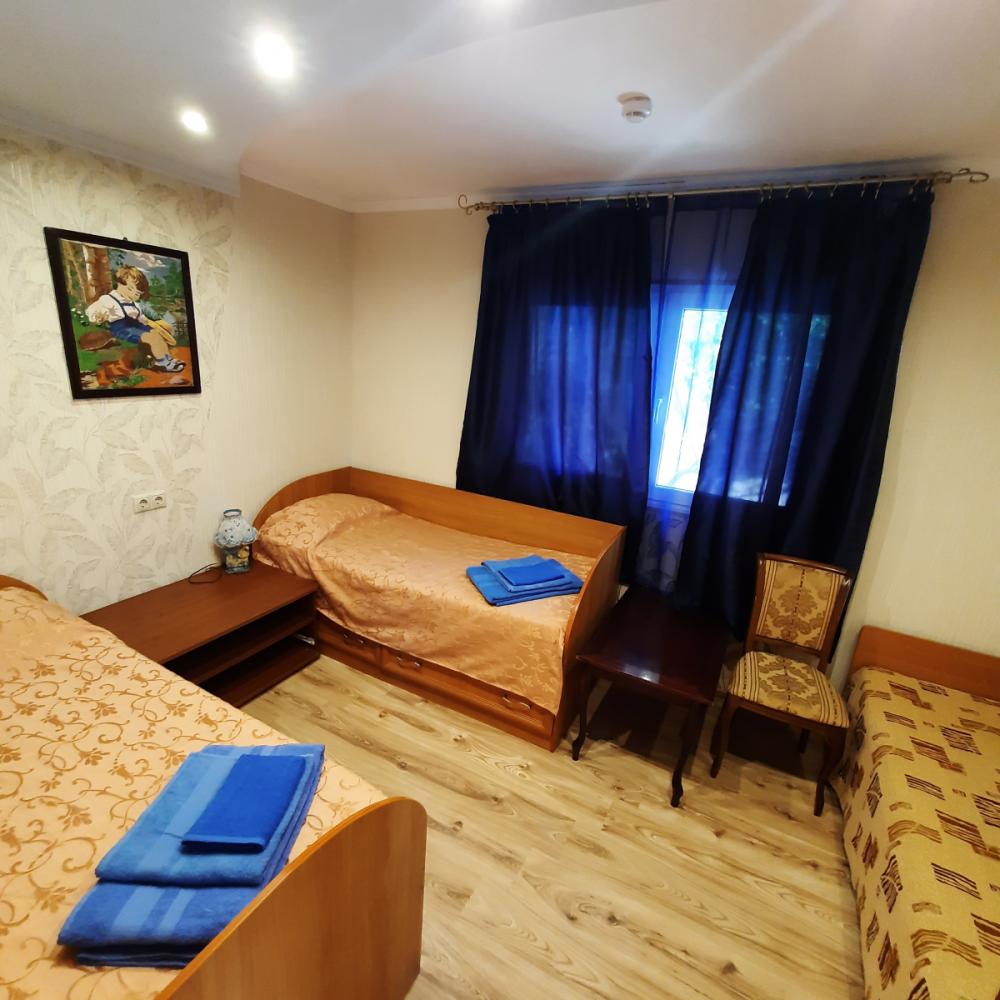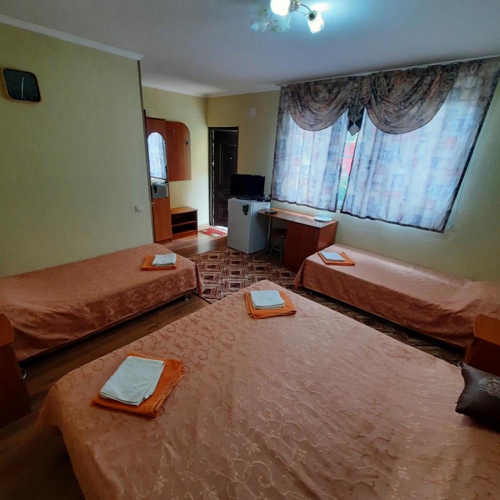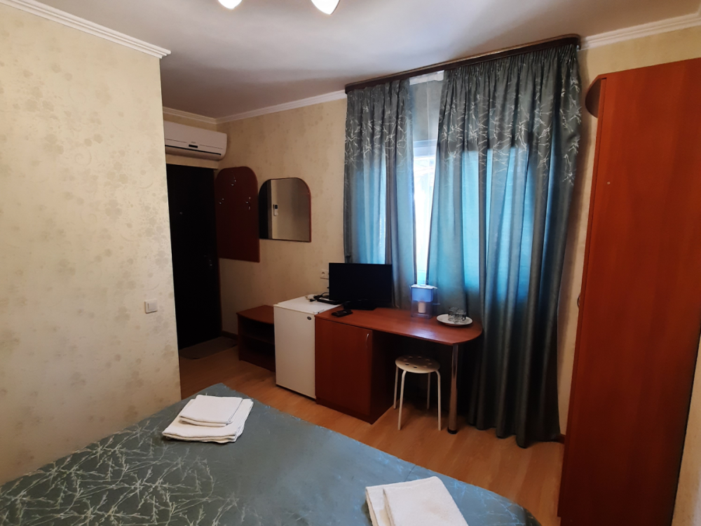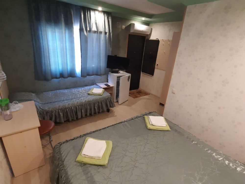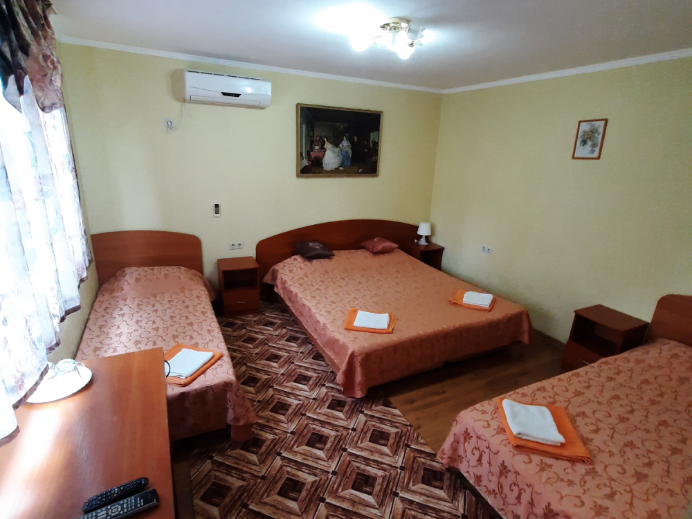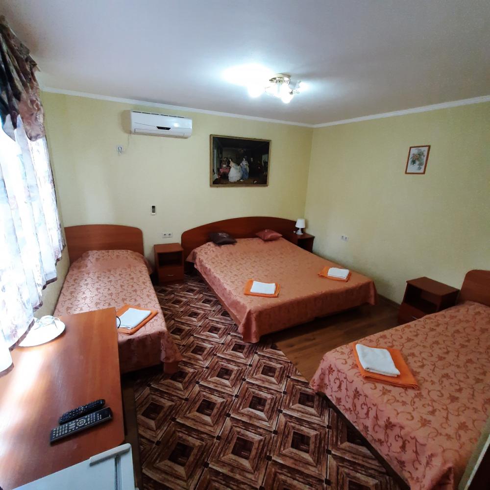 Стандартный трехместный номер площадью 16 м² — идеальный выбор для комфортного размещения семьи или компании друзей. В домике есть 3 односпальные кровати, которые можно расположить как вместе, так и раздельно. Домик оборудован душем, раковиной, туалетом. Есть телевизор и холодильник. Постельное белье, полотенца и гигиенические принадлежности предоставляются. Для пользования доступна общая летняя кухня для самостоятельного приготовления пищи.