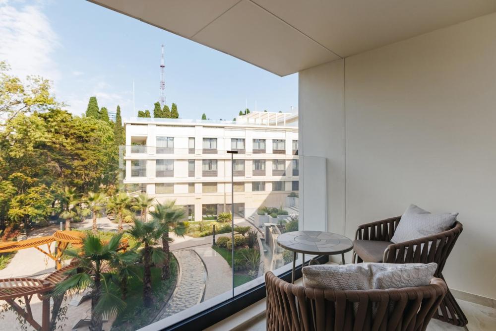 В номерах Джуниор I, выполненных в пастельных тонах можно расслабиться и наслаждаться уютом. Здесь есть полноценная кухня с холодильником и премиальной бытовой техникой. В гостиной есть диван, который может также стать дополнительным спальным местом. В номере могут расположиться 2 взрослых и 1 ребенок до 12 лет включительно. Ребенок до 3 лет может разместиться без дополнительного спального места, а по запросу вам предоставят детскую кроватку. Из комфорта тут есть все - от кабельного телевидения и кровати “King size” до системы климат-контроля. Окна могут выходить как в атриум отеля, так и на город Сочи.