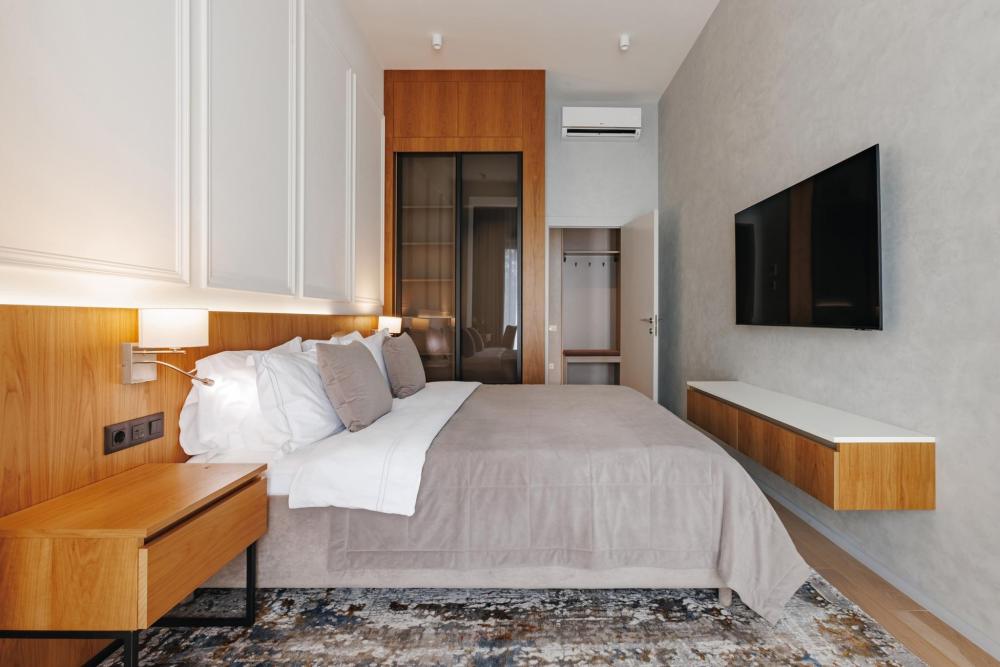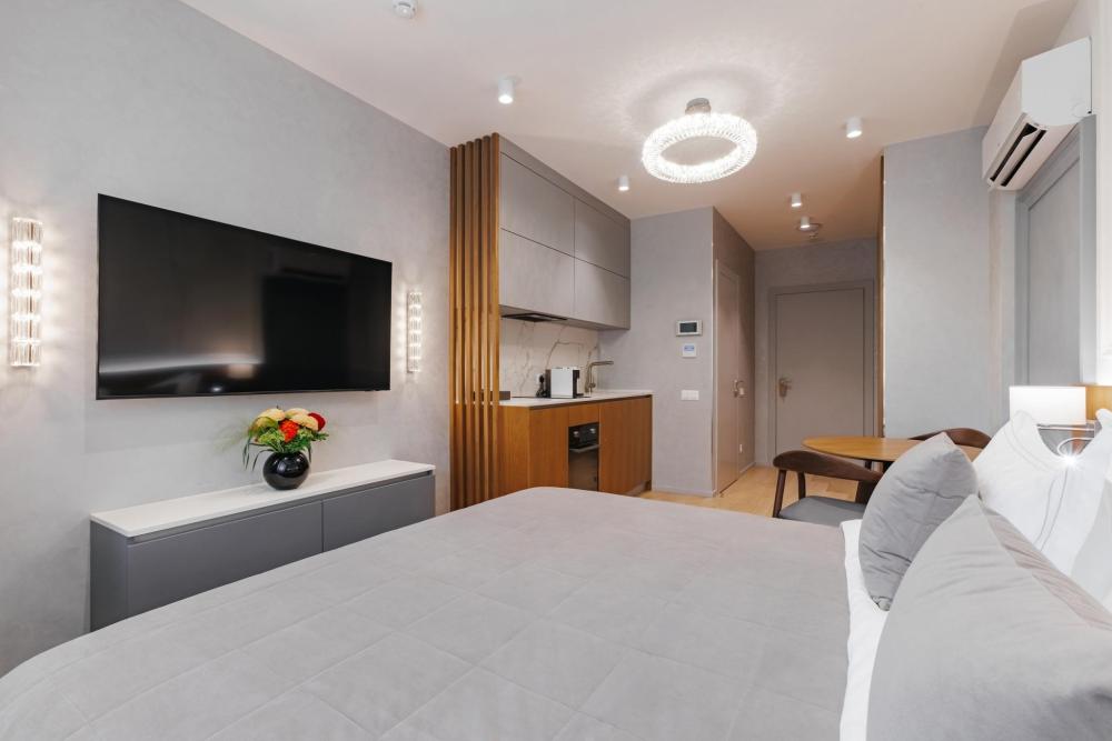 Номера однокомнатный люкс II - самая популярная в отеле категория номеров. Они совмещают в себе комфортный и уютный дизайн. Из окна можно видеть впечатляющие виды на достопримечательности Сочи либо на внутреннюю территорию отеля. В номере в вашем распоряжении полноценная кухня с премиальной техникой. В гостиной располагается диван, который может стать дополнительным спальным местом. В номере 2 телевизора и кровать “King size”. Есть все необходимое для комфортного и длительного проживания. В номере могут расположиться 2 взрослых и 2 детей до 12 лет. Один ребенок до 3 лет может разместиться без спального места, либо же мы предоставим кроватку.