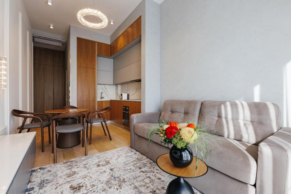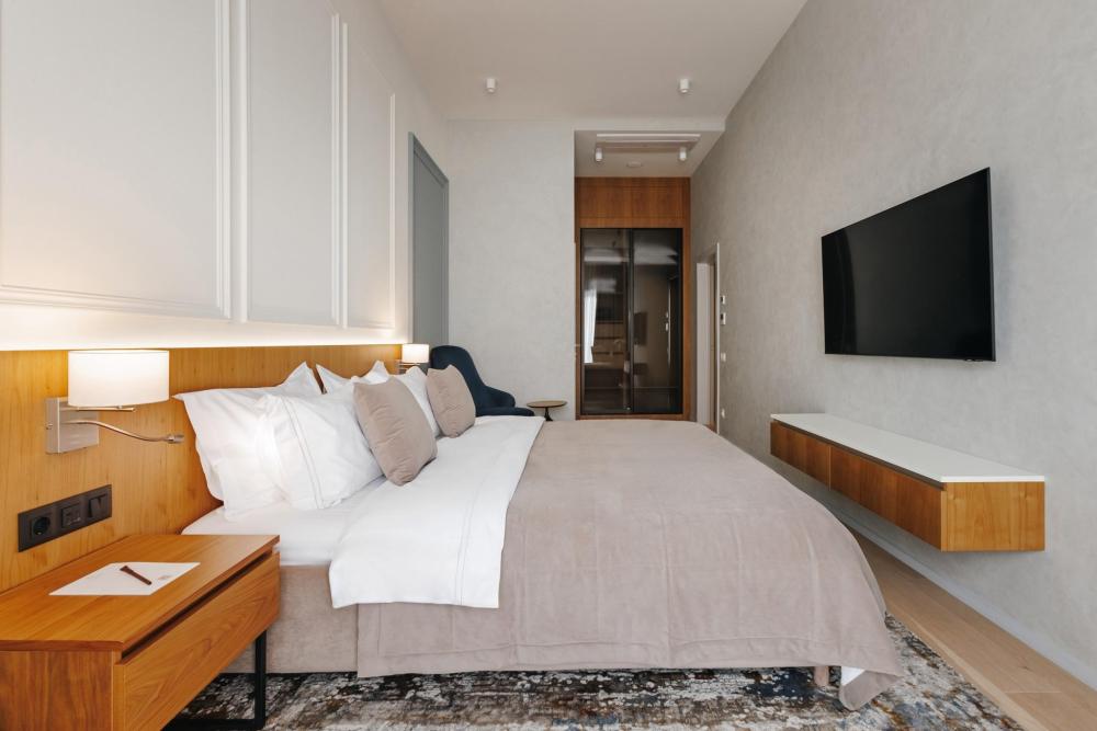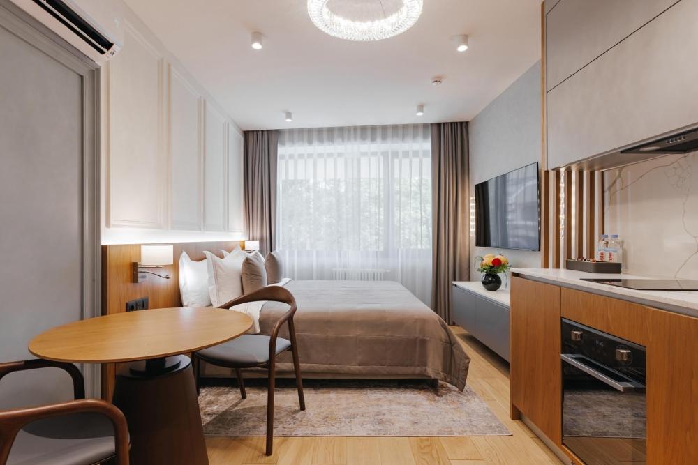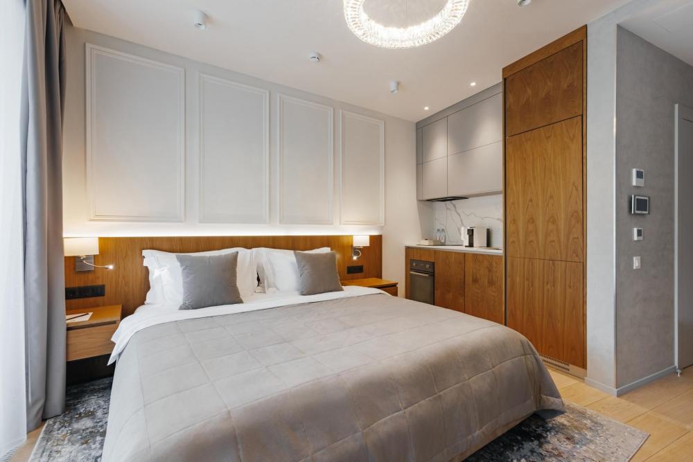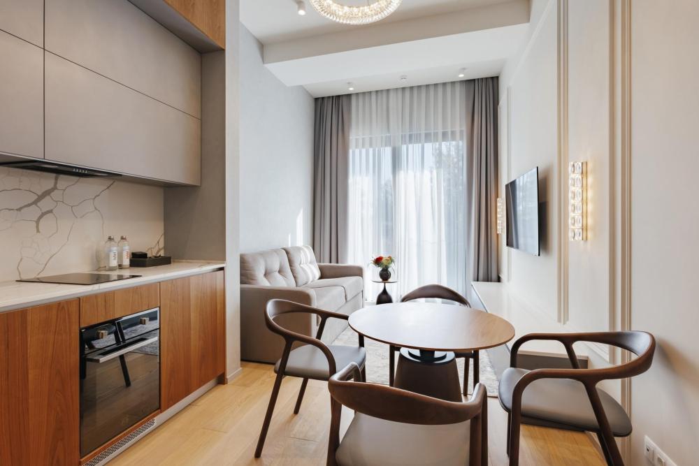Номер Однокомнатный люкс является одним из самых популярных категорий номеров. Ключевое удобство здесь - многообразие видов из окна на главные достопримечательности города. В номере в распоряжении гостей полноценная кухня с холодильником и премиальной бытовой техникой. Есть все для комфортного проживания. В гостиной есть диван, который может стать дополнительным спальным местом. В номере могут расположиться 2 взрослых и 1 ребенок до 12 лет включительно. Ребенок до 3 лет может разместиться без дополнительного спального места, а по запросу вам предоставят детскую кроватку.
