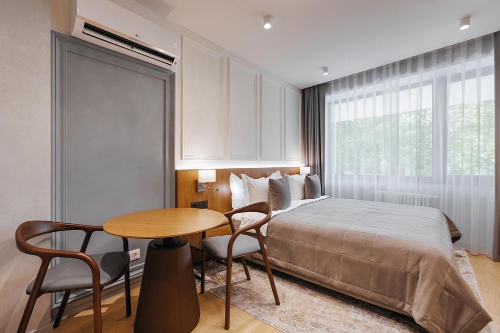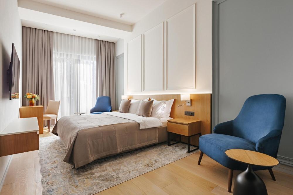В номерах стандарт двухместный кровать “King size” и обеденная зона. Окна выходят на внутренний двор либо на достопримечательности города Сочи. Искусно подобранная мебель и элементы интерьера создают идеальное пространство, в котором приятно находиться. Также на всей территории отеля действует бесплатный Wi-Fi. В номере предусмотрено размещение 2 гостей + один ребенок до 3 лет. По запросу можно предоставить детскую кроватку. Также эргономичность и удобства номера не оставят равнодушными путешественников - здесь есть все, от кабельного телевидения до собственного сейфа.