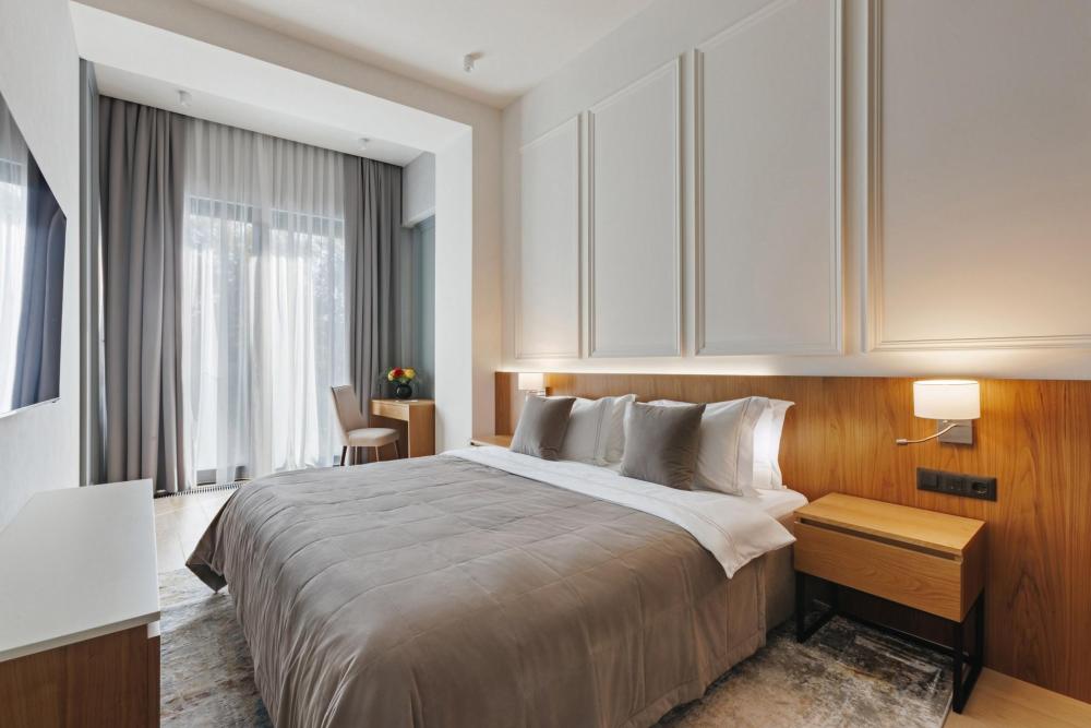 В просторных номерах Джуниор II насладитесь роскошью и комфортом. Уютные и элегантные интерьеры, выполненные в пастельных тонах создают особую атмосферу. В номере увидите собственную кухню с холодильником и премиальной бытовой техникой. В гостиной есть диван, который раскладывается и может послужить дополнительным спальным местом. Номера предусмотрены для проживания 2 взрослых и 2 детей до 12 лет. Один ребенок до 3 лет может расположиться в люльке или без дополнительного спального места. Также в распоряжении кровать “King size” и гостиная зона с диваном и бесплатным Wi-Fi.