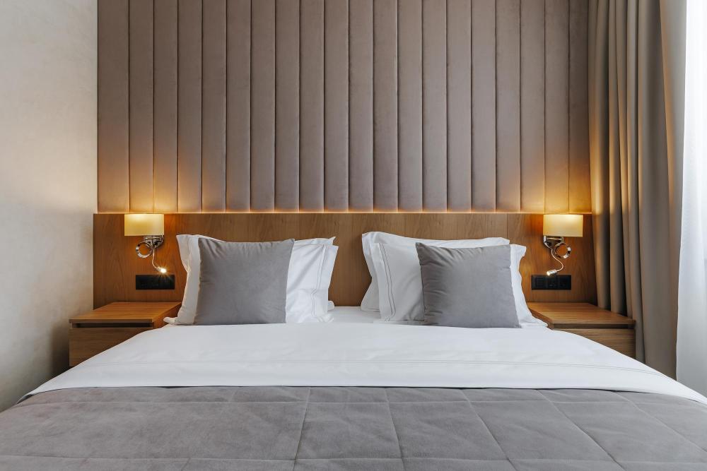 Просторные номера с двумя спальнями и большой кухней-гостиной категории Панорамный представительский люкс выгодно отличаются от других категорий двуспальных номеров своими площадями, высокими потолками и панорамными окнами. Попадая в эти номера, вы наслаждаетесь простором, наслаждаетесь шикарными видами на сквер Стерео и Собор Архангела Михаила. В каждом номере по 2 спальни с большими удобными кроватями, вместительными шкафами и рабочей зоной, по 2 полноценных ванных комнаты, в одной из которых установлена ванная, в другой – душ. В зоне гостиной расположен большой раскладной диван, на котором комфортно могут разместиться два человека. В Панорамном представительском люксе можно разместить до 6 гостей. Один ребёнок до 3 лет — может разместиться без дополнительного спального места. По запросу предоставляется детская кроватка. Каждый из дизайнерских номеров выполнен в индивидуальном стиле и может отличаться от предоставляемых фотографий