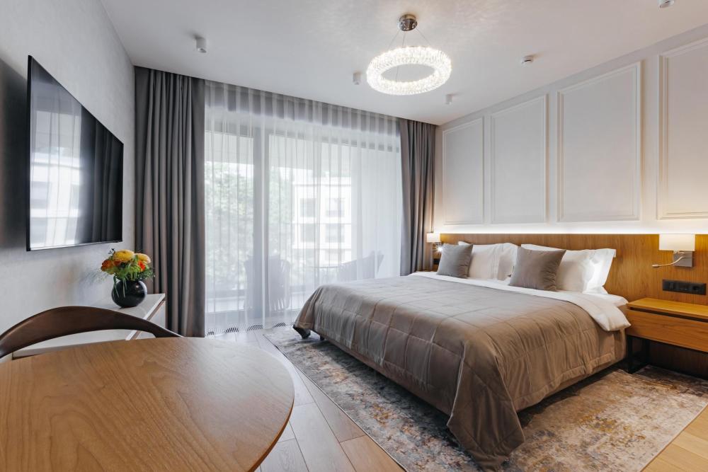 В номерах однокомнатный люкс с балконом кровать “King size”, диван-кровать и собственный балкон, из которого можно любоваться закатами тёплыми летними вечерами. Эта категория номеров, которая совмещает в себе комфортный и уютный дизайн. В зависимости от номера гости могут наслаждаться разными видами: на Курортный проспект, или сквер Стерео, на Собор Архангела Михаила или на внутреннюю территорию отеля. Балконы оснащены мягкой мебелью для комфортных посиделок. В номере полноценная кухня с премиальной техникой. В гостиной диван-кровать. Сам номер предусмотрен для проживания 2 взрослых и 1 ребенка до 12 лет. Один ребенок до 3 лет может разместиться без дополнительного спального места, а по запросу мы предоставим детскую кроватку.