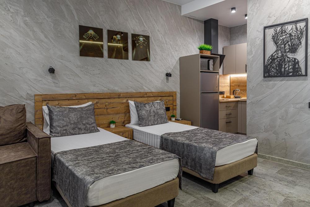 Комфортабельные апартаменты для двоих гостей с 2 раздельными кроватями или одной двуспальной в стиле лофт, находящиеся на самом берегу Черного моря. Для Вашего отдыха есть все необходимое: 2 кровати/двуспальная кровать с постельным бельем высшего качества, кухонная и обеденная зоны, Smart-TV, а также общая терраса с видом на море. Санузел оборудован душевой кабиной, а также есть стиральная машина, фен, утюг/гладильная доска. *В случае необходимости предоставления 2 раздельных кроватей, просим оставить комментарий при бронировании номера.