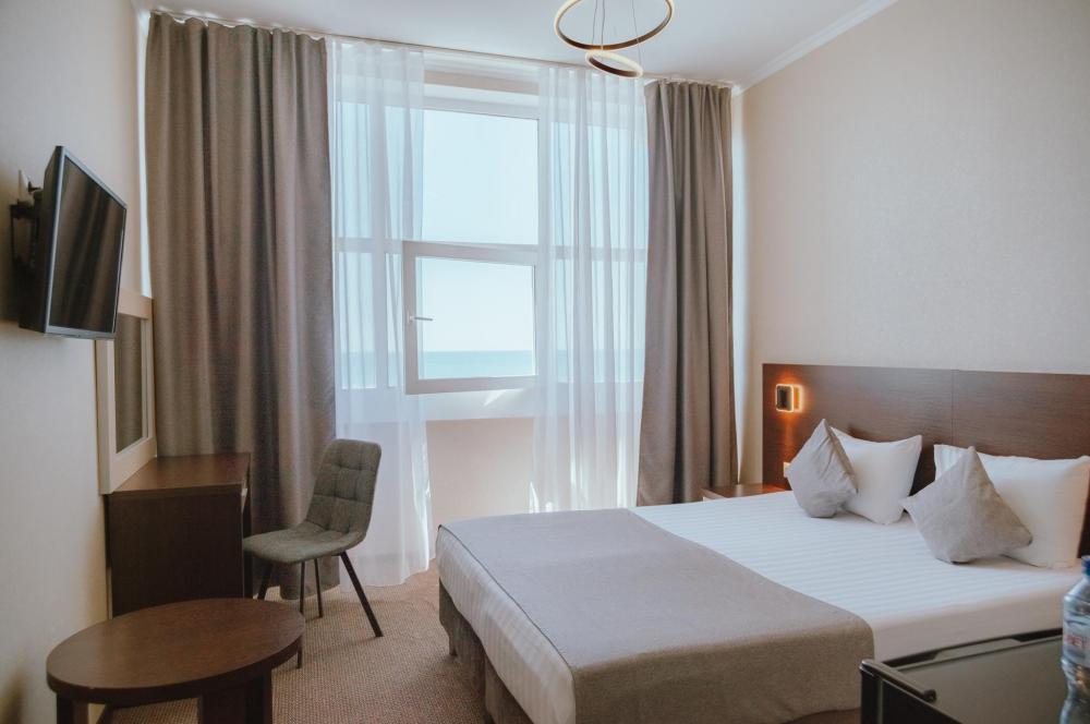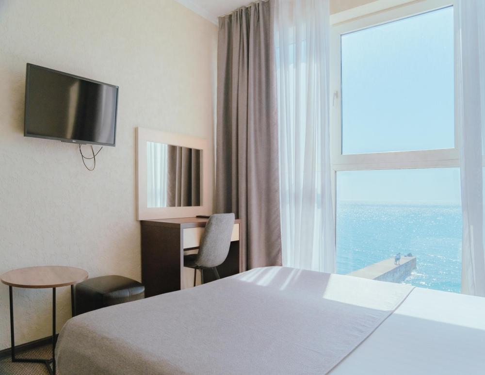 Номер с видом на море. В номере телевизор, холодильник, кондиционер, сан/узел с ванной, кровать, 2 тумбочки, шкаф, туалетный столик.