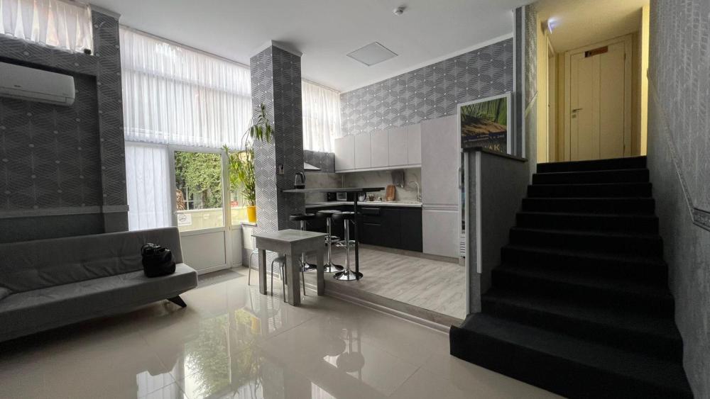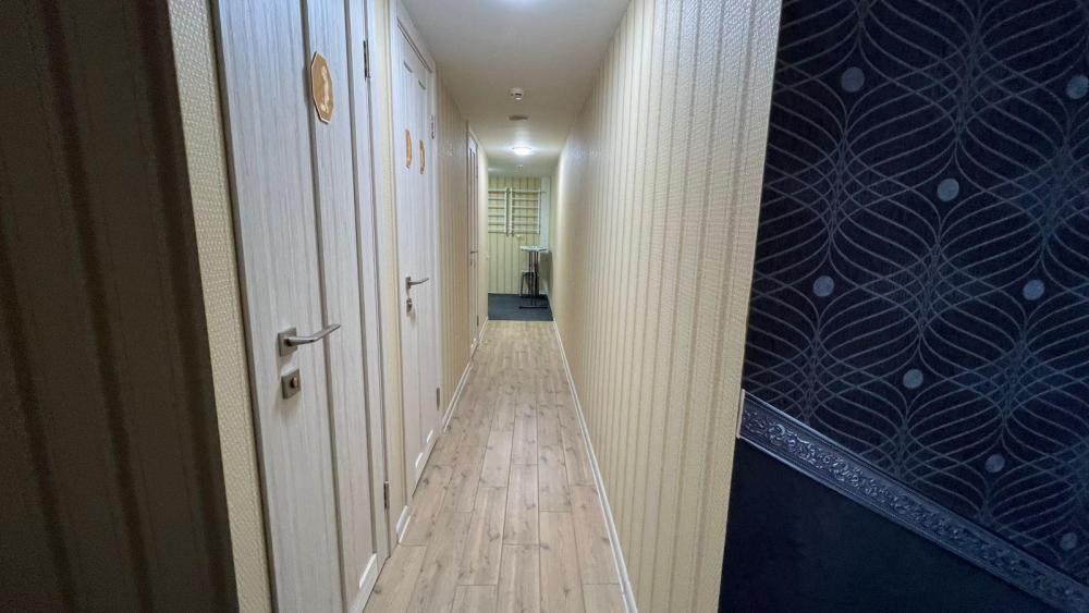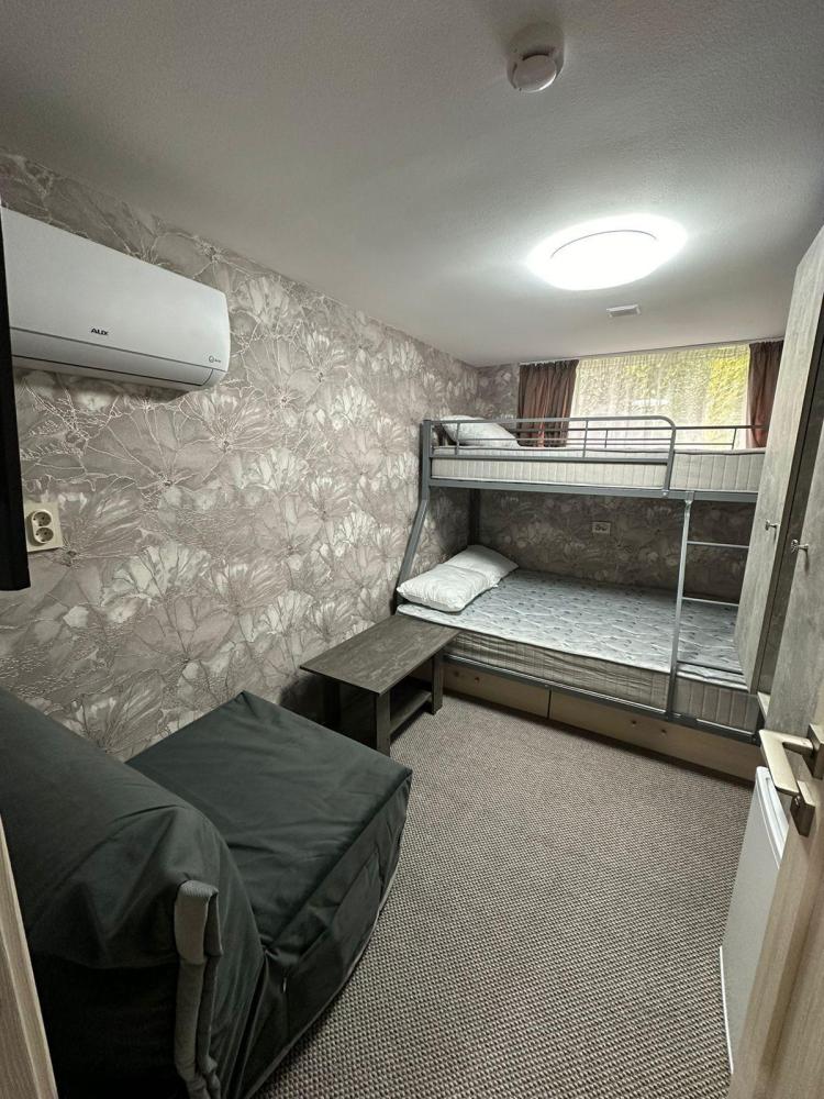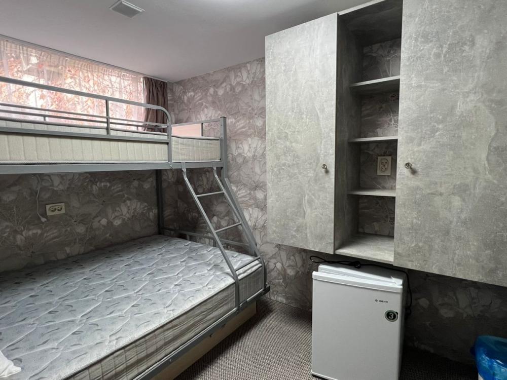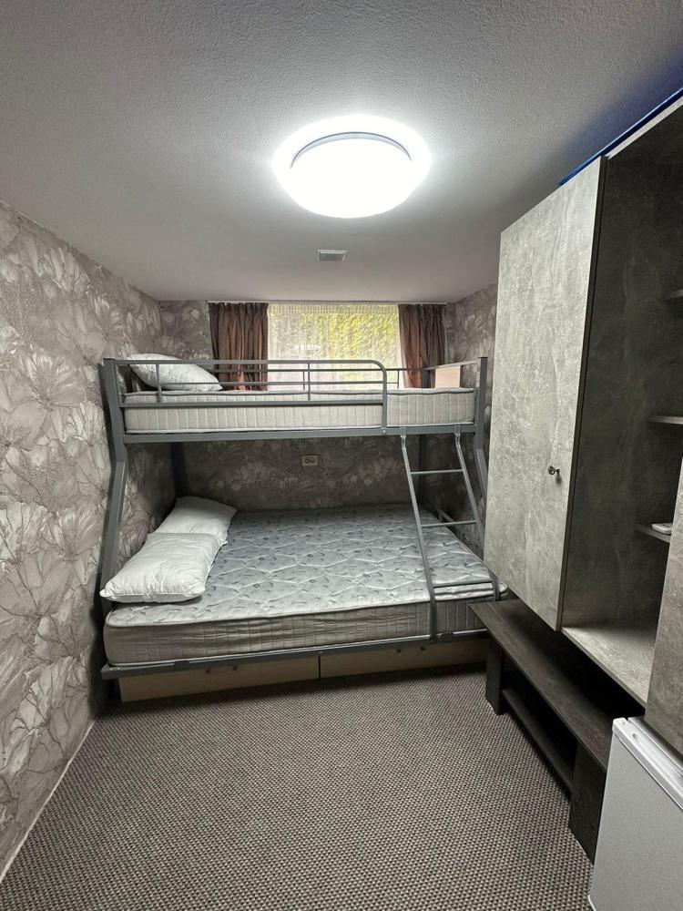 Номер предназначен для троих взрослых и ребенка. В номере имеется холодильник, телевизор, раковина. Удобства на этаже.