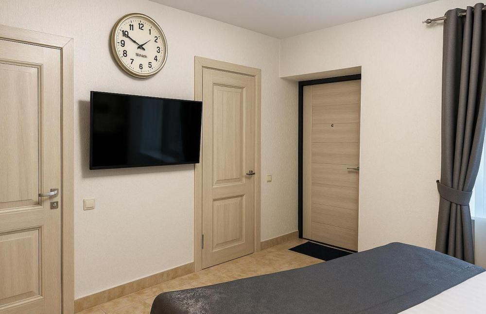 Двухкомнатный номер, состоящий из спальни и гостиной. В спальне находятся двуспальная кровать, прикроватные тумбы. В гостиной находятся мягкая мебель- угловой диван, пуфик, журнальный столик, телевизор, стол-трюмо, стул, холодильник, кондиционер, чайник. В ванной комнате установлена ванна, имеется фен, тапочки, набор полотенец, халаты и косметические принадлежности.