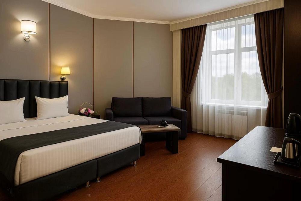 В номере установлена двуспальная кровать или 2 раздельные одноместные кровати на ваш выбор, прикроватные тумбы, диван, шкаф, телевизор, стол-трюмо, зеркало, стул, журнальный столик, холодильник, чайник, кондиционер. В ванной комнате имеется ванна, фен, тапочки, набор полотенец и косметические принадлежности.