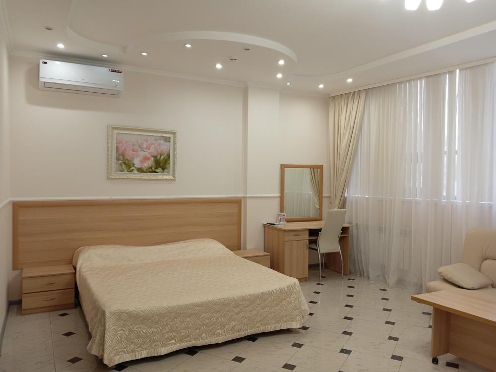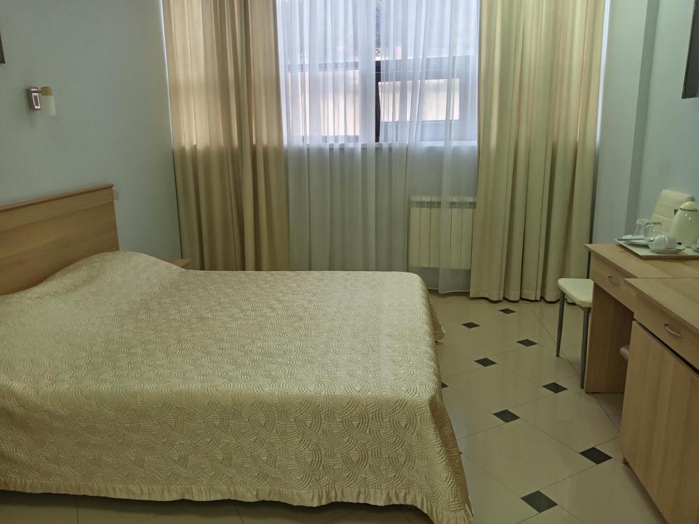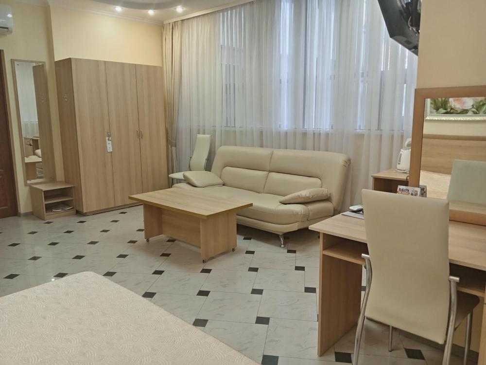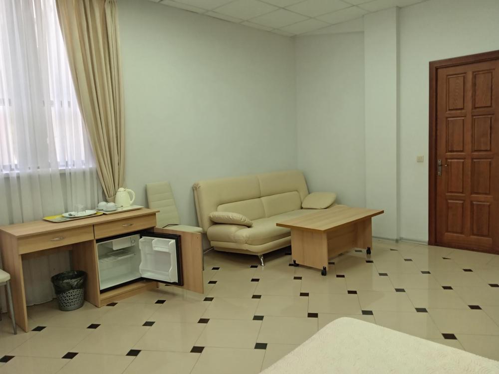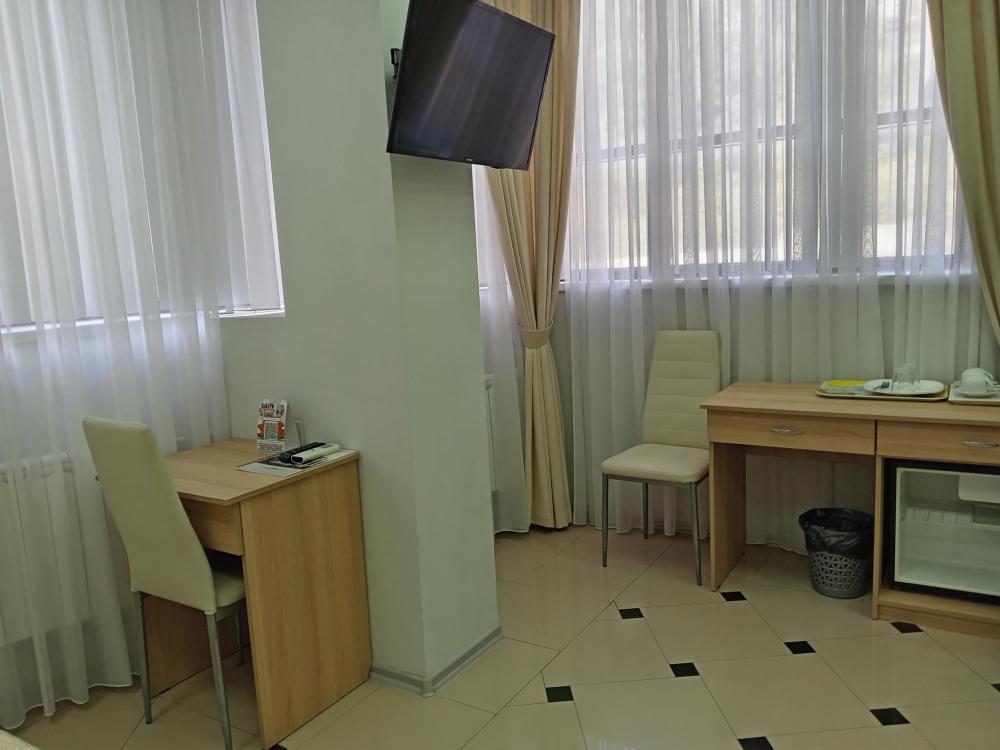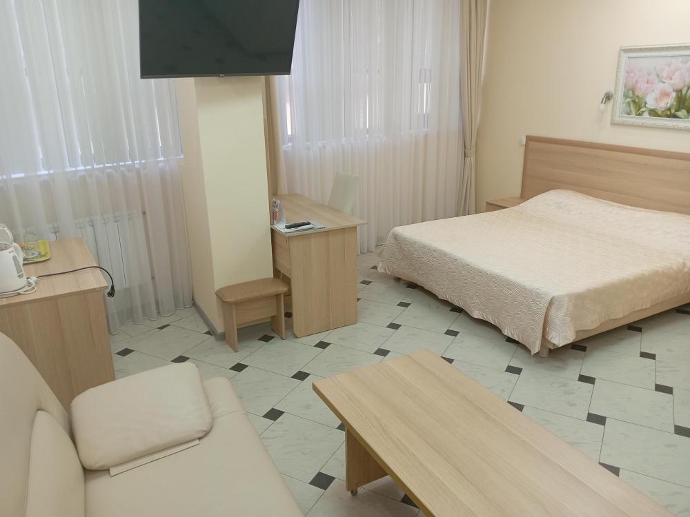 В номере есть большая двуспальная кровать, размер 180*200, также имеется диван, который может служить дополнительным местом. Количество номеров-3 номера. Номер площадью 30-40 кв.м. Подходит для размещения двух или трех гостей. Номера в гостинице оформлены в светлых тонах, оснащены новой мебелью: кровать односпальные или двуспальные, прикроватные тумбочки, туалетный столик, письменный стол, шкаф, зеркало, светильники. Все номера имеют кондиционер, чайник, холодильник и телевизор с плоским экраном, транслирующий спутниковые каналы. Ванная комната укомплектована феном и набором туалетных принадлежностей. В распоряжении гостей всех номеров собственная ванная комната. В номерах предусмотрена система противопожарной безопасности.