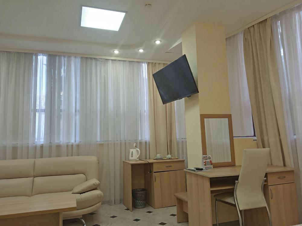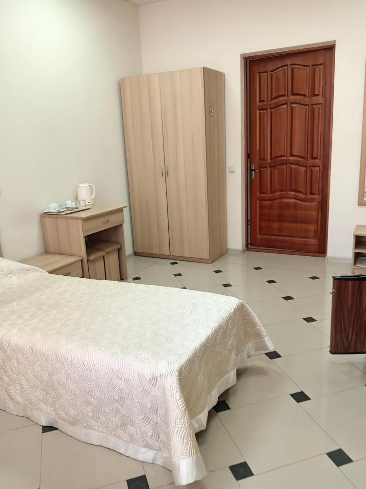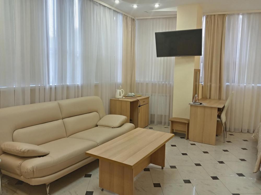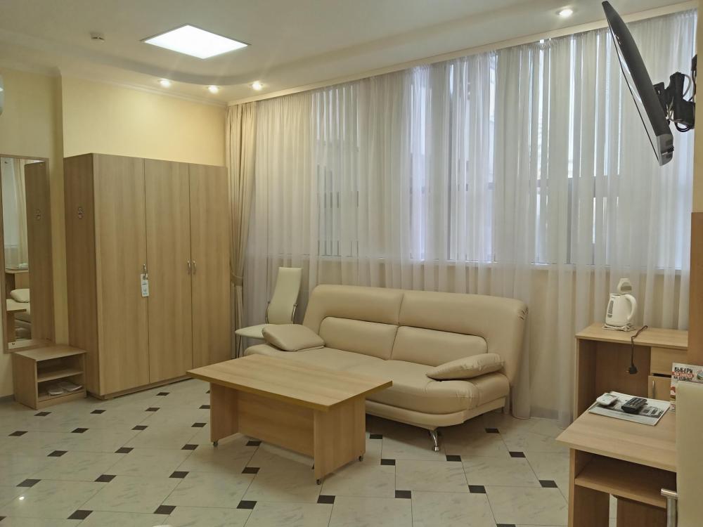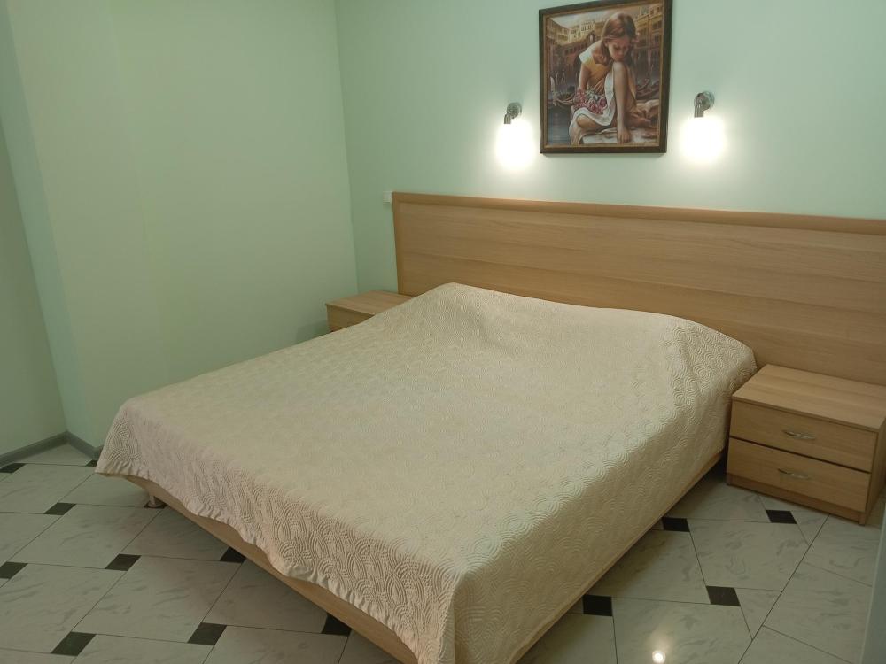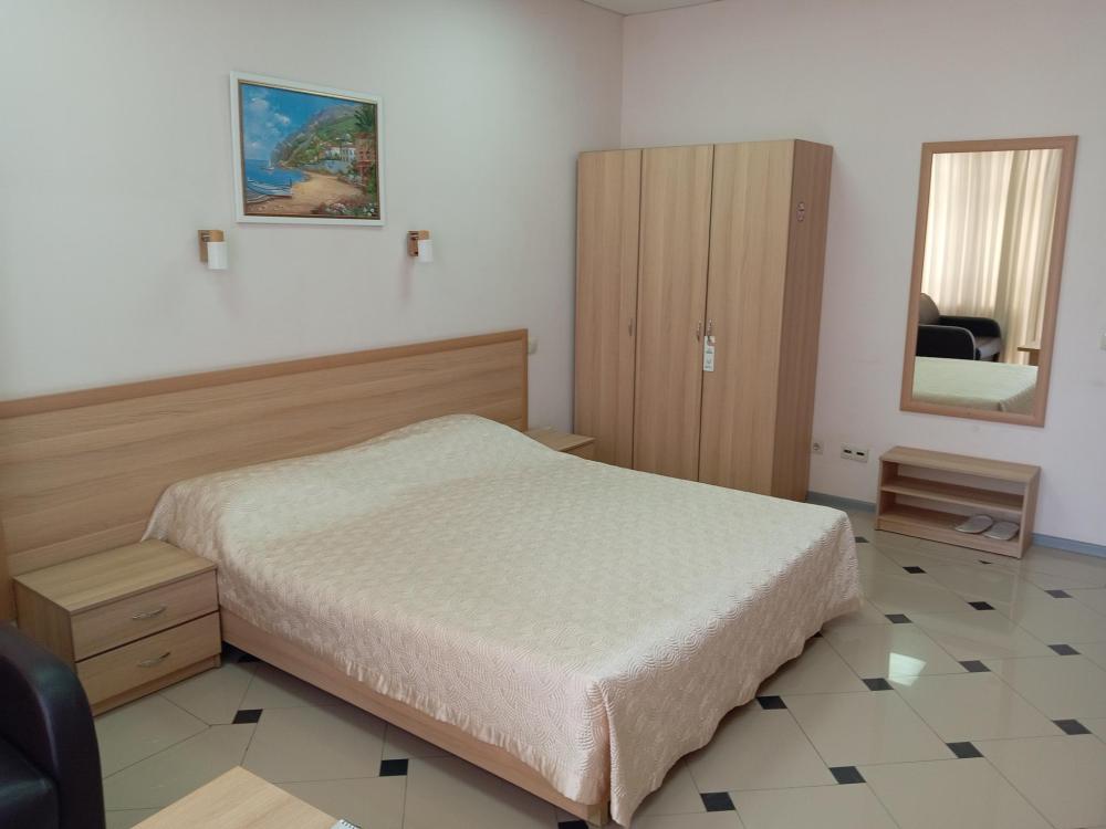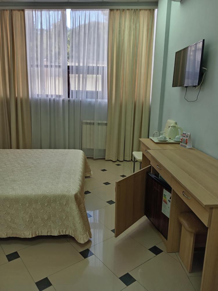 В номере есть большая двуспальная кровать, размер 180*200, также имеется диван, который может служить дополнительным местом. Количество номеров-3 номера. Номер площадью 30-40 кв.м. Подходит для размещения двух или трех гостей. Номера в гостинице оформлены в светлых тонах, оснащены новой мебелью: кровать односпальные или двуспальные, прикроватные тумбочки, туалетный столик, письменный стол, шкаф, зеркало, светильники. Все номера имеют кондиционер, чайник, холодильник и телевизор с плоским экраном, транслирующий спутниковые каналы. Ванная комната укомплектована феном и набором туалетных принадлежностей. В распоряжении гостей всех номеров собственная ванная комната. В номерах предусмотрена система противопожарной безопасности.