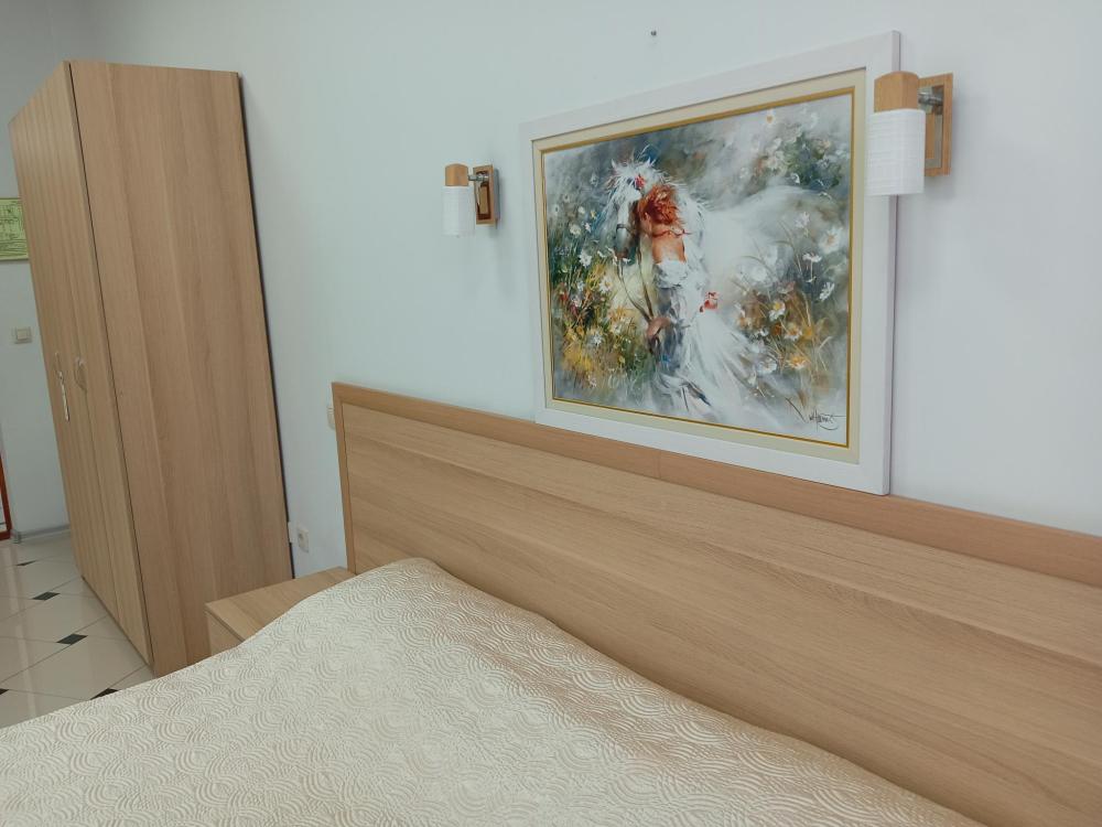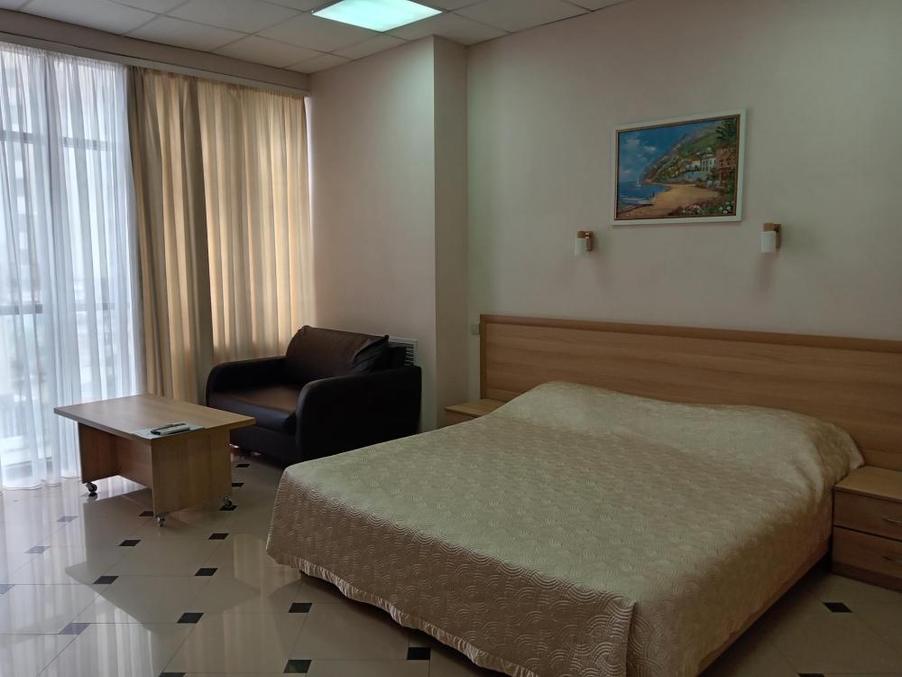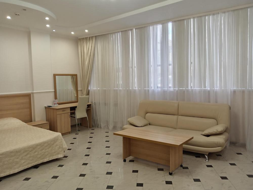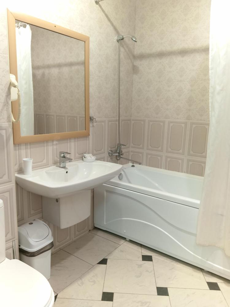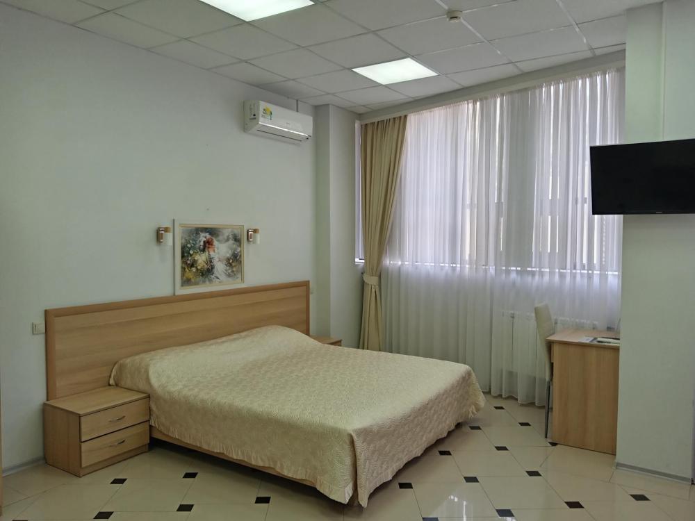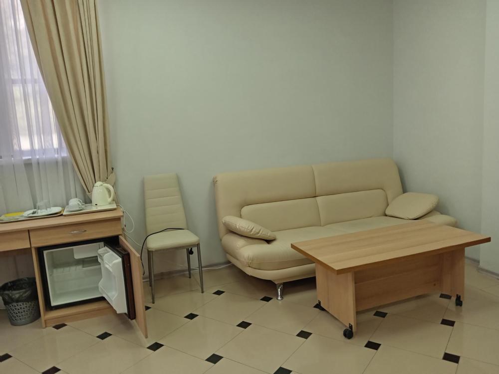 В номере есть большая двуспальная кровать, размер 180*200, также имеется диван, который может служить дополнительным местом. Количество номеров-3 номера. Номер площадью 30-40 кв.м. Подходит для размещения двух или трех гостей. Номера в гостинице оформлены в светлых тонах, оснащены новой мебелью: кровать односпальные или двуспальные, прикроватные тумбочки, туалетный столик, письменный стол, шкаф, зеркало, светильники. Все номера имеют кондиционер, чайник, холодильник и телевизор с плоским экраном, транслирующий спутниковые каналы. Ванная комната укомплектована феном и набором туалетных принадлежностей. В распоряжении гостей всех номеров собственная ванная комната. В номерах предусмотрена система противопожарной безопасности.