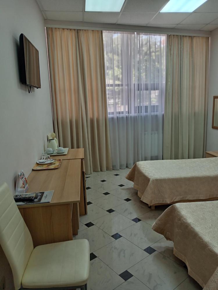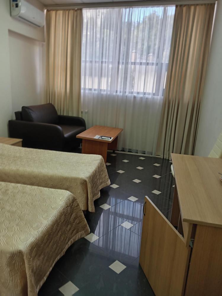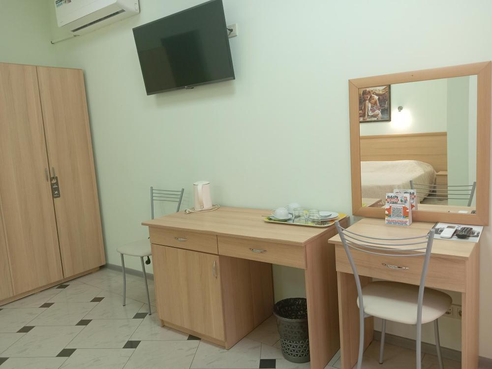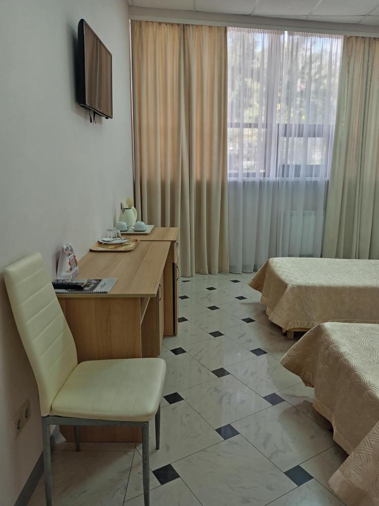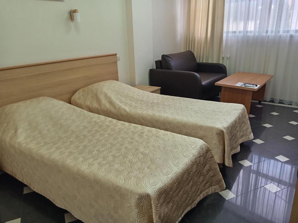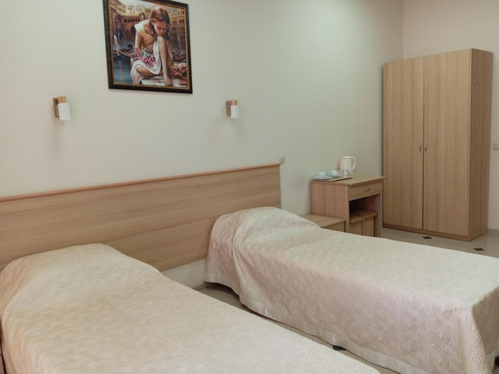 В номере есть 2 односпальные кровати, а также диван, который может служить дополнительным местом. Количество номеров-1 номер. Номер площадью 20 кв.м. Подходит для размещения двух или трех гостей. Номера в гостинице оформлены в светлых тонах, оснащены новой мебелью: 2 односпальные кровати, размер 90*200, прикроватные тумбочки, туалетный столик, письменный стол, шкаф, зеркало, светильники. Все номера имеют кондиционер, чайник, холодильник и телевизор с плоским экраном, транслирующий спутниковые каналы. Ванная комната укомплектована феном и набором туалетных принадлежностей. В распоряжении гостей всех номеров собственная ванная и санузел. В номерах предусмотрена система противопожарной безопасности.