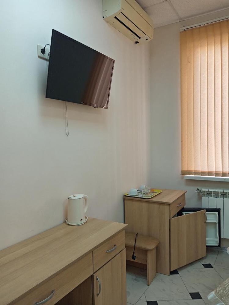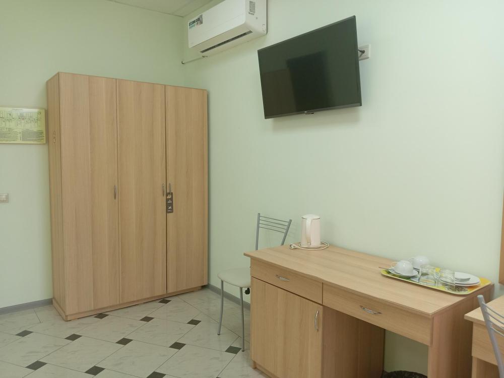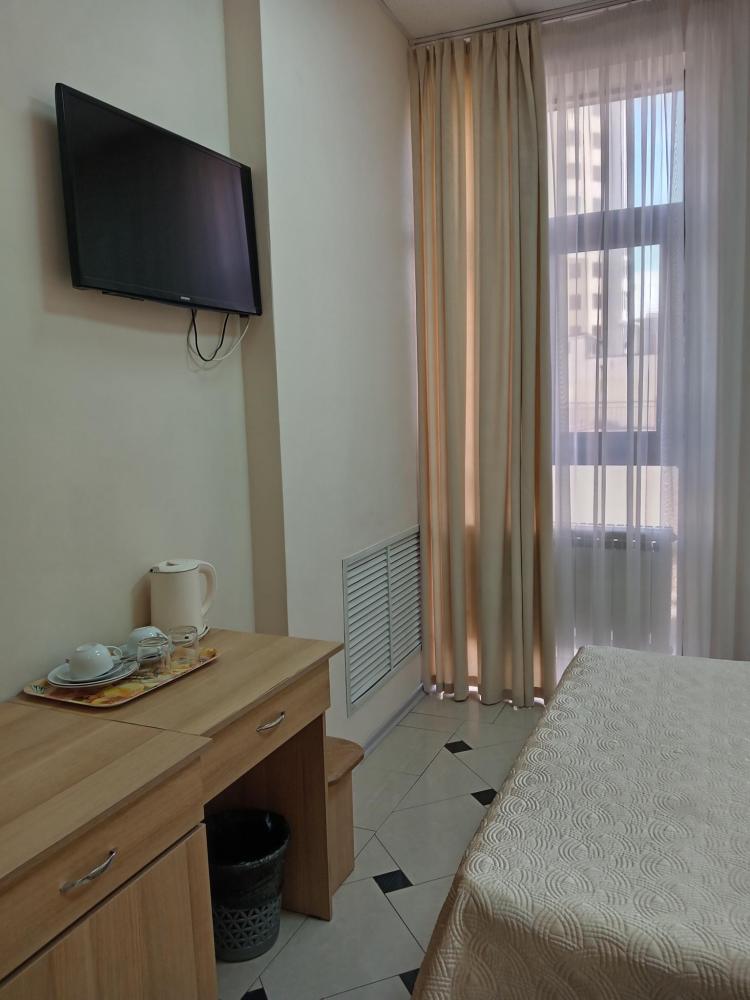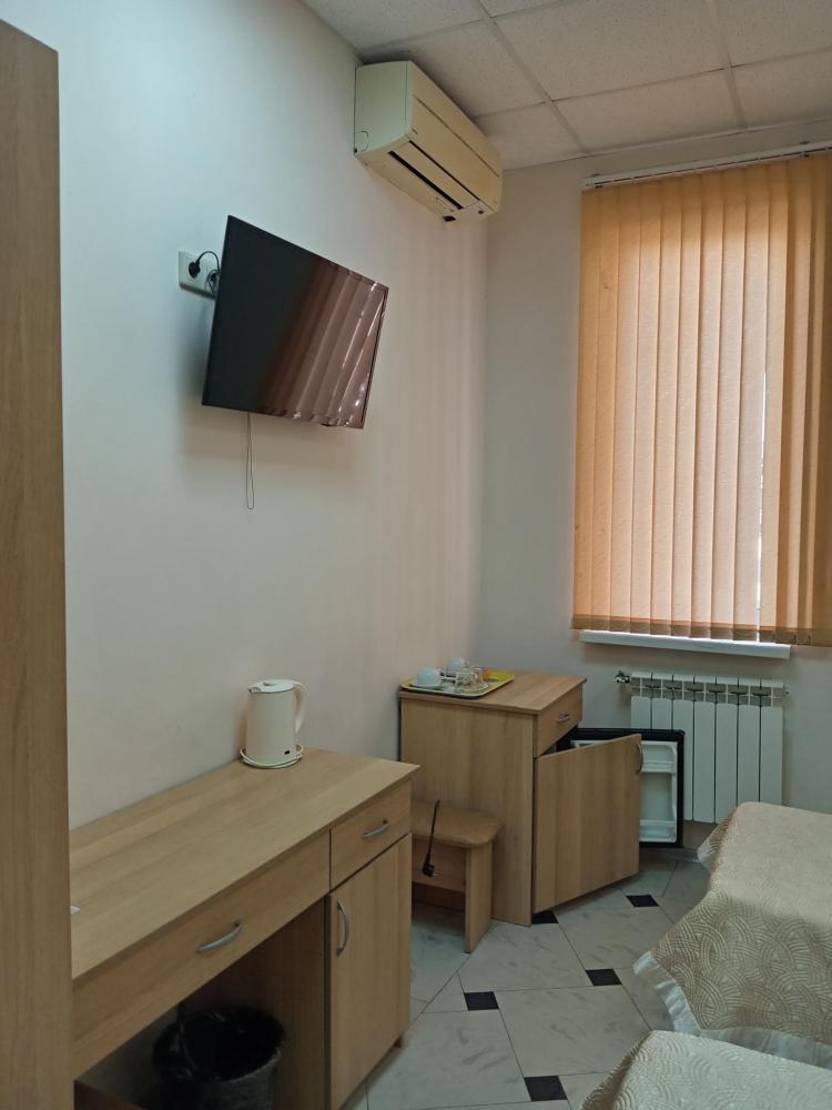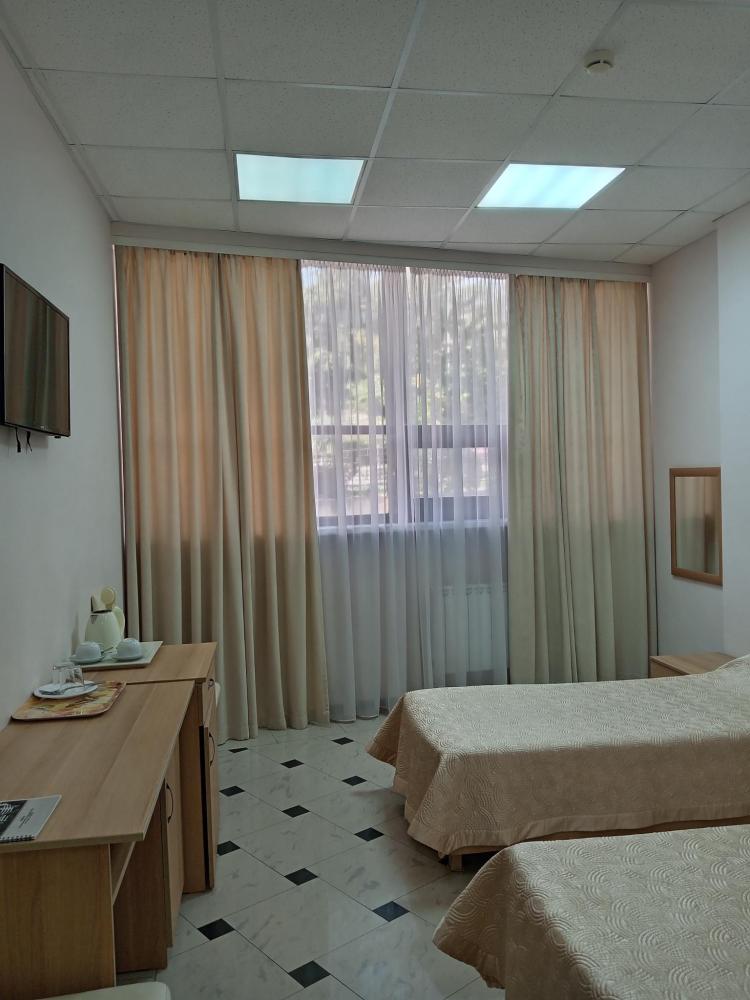 В номере есть 2 односпальные кровати, а также диван, который может служить дополнительным местом. Количество номеров-1 номер. Номер площадью 20 кв.м. Подходит для размещения двух или трех гостей. Номера в гостинице оформлены в светлых тонах, оснащены новой мебелью: 2 односпальные кровати, размер 90*200, прикроватные тумбочки, туалетный столик, письменный стол, шкаф, зеркало, светильники. Все номера имеют кондиционер, чайник, холодильник и телевизор с плоским экраном, транслирующий спутниковые каналы. Ванная комната укомплектована феном и набором туалетных принадлежностей. В распоряжении гостей всех номеров собственная ванная и санузел. В номерах предусмотрена система противопожарной безопасности.