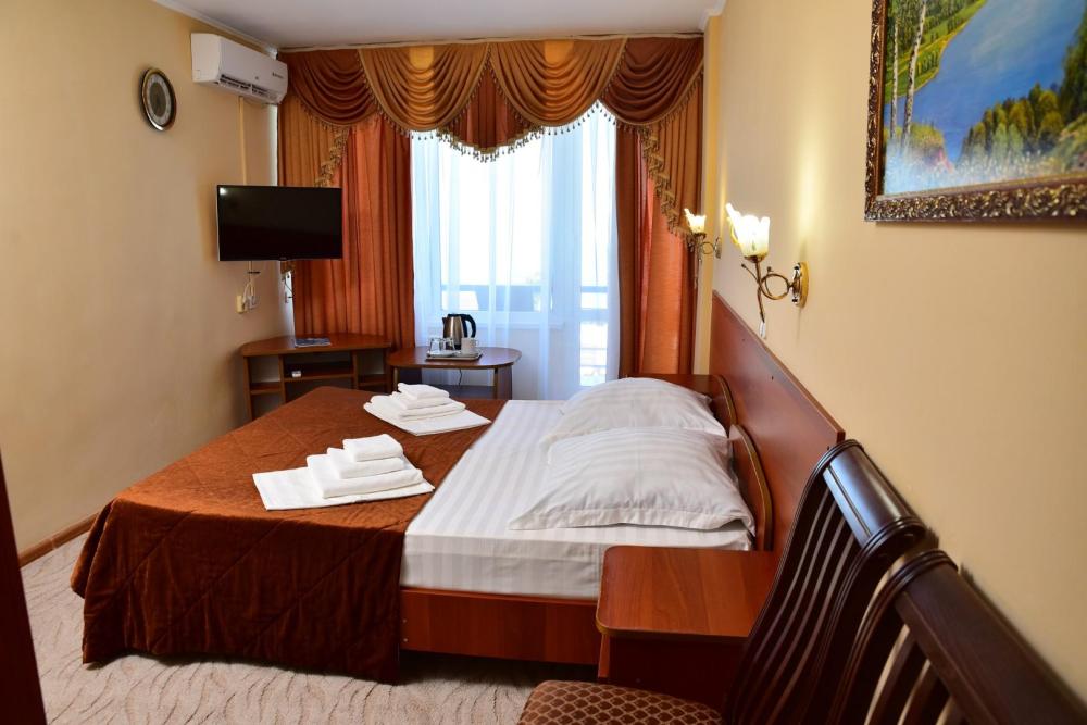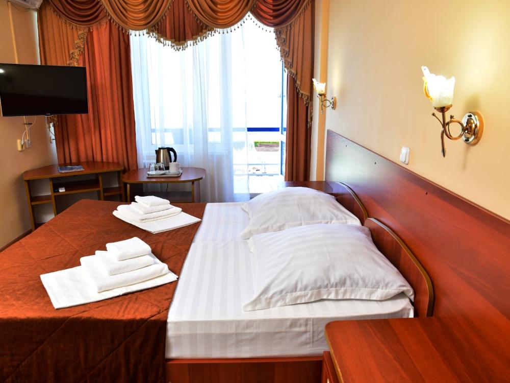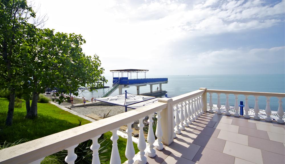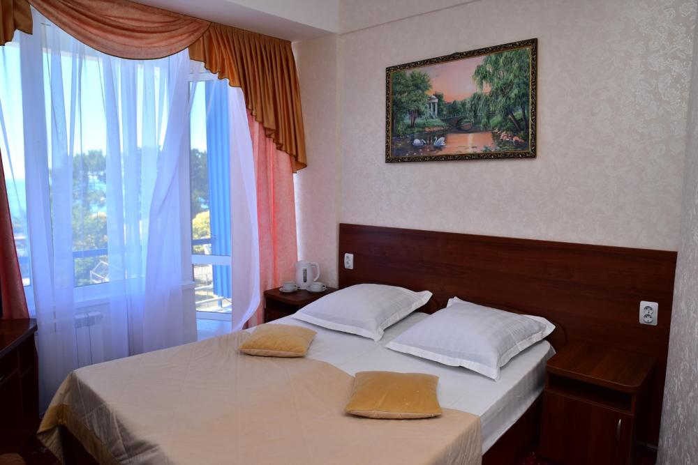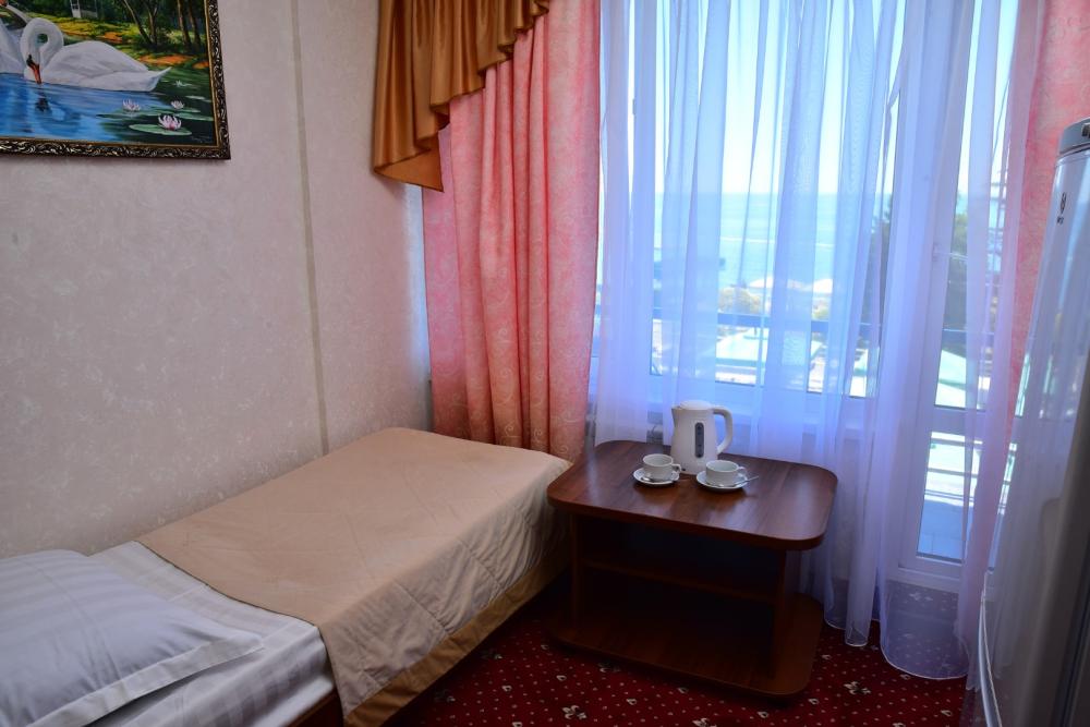 Однокомнатные двухместные номера оборудованы телевизором, кондиционером, холодильником, мебелью, санузлом (ванна/душ), чайником, балконом. Номер с видом на море.