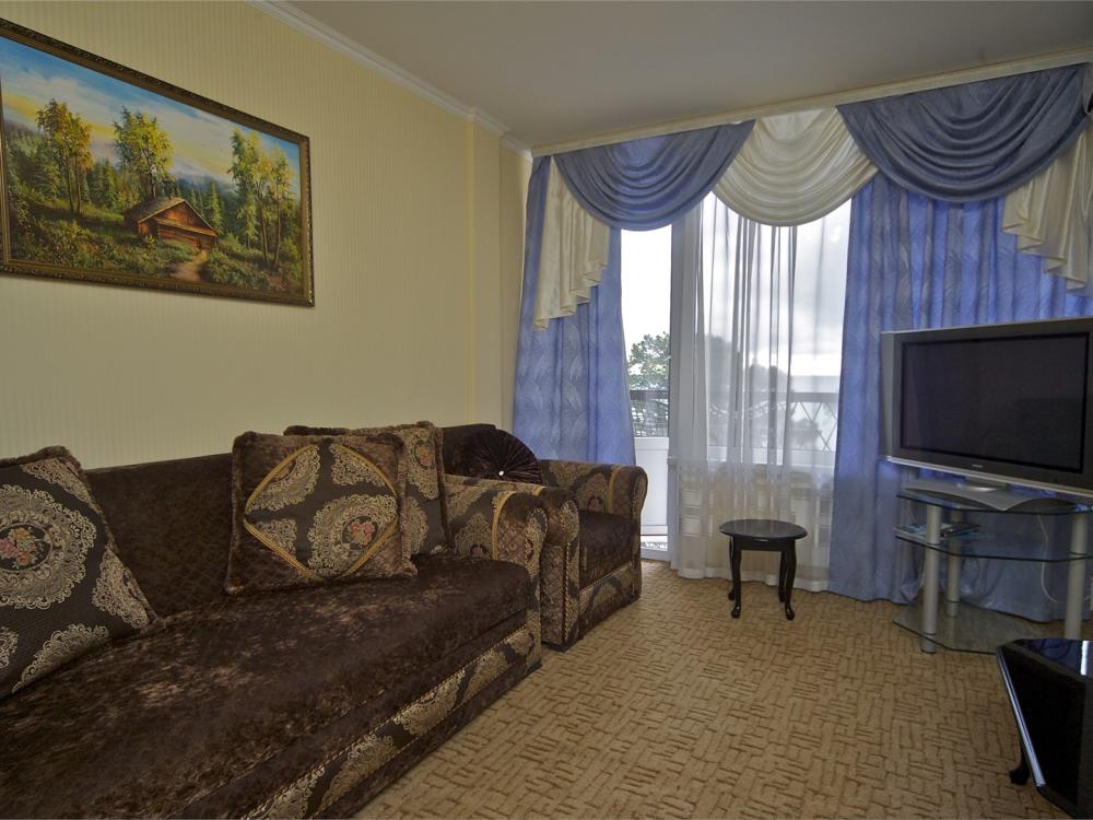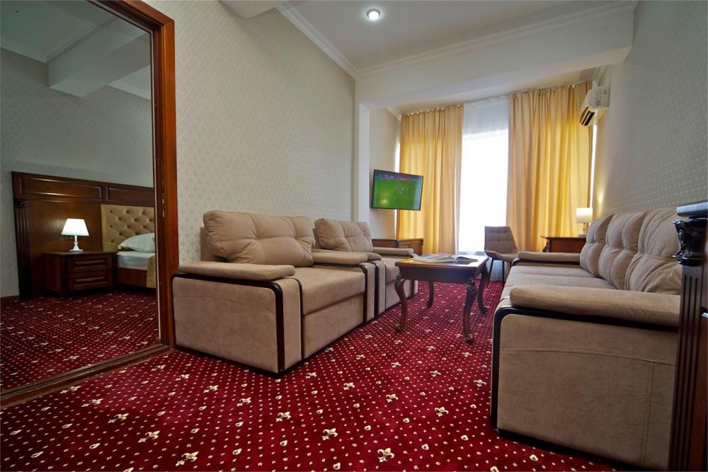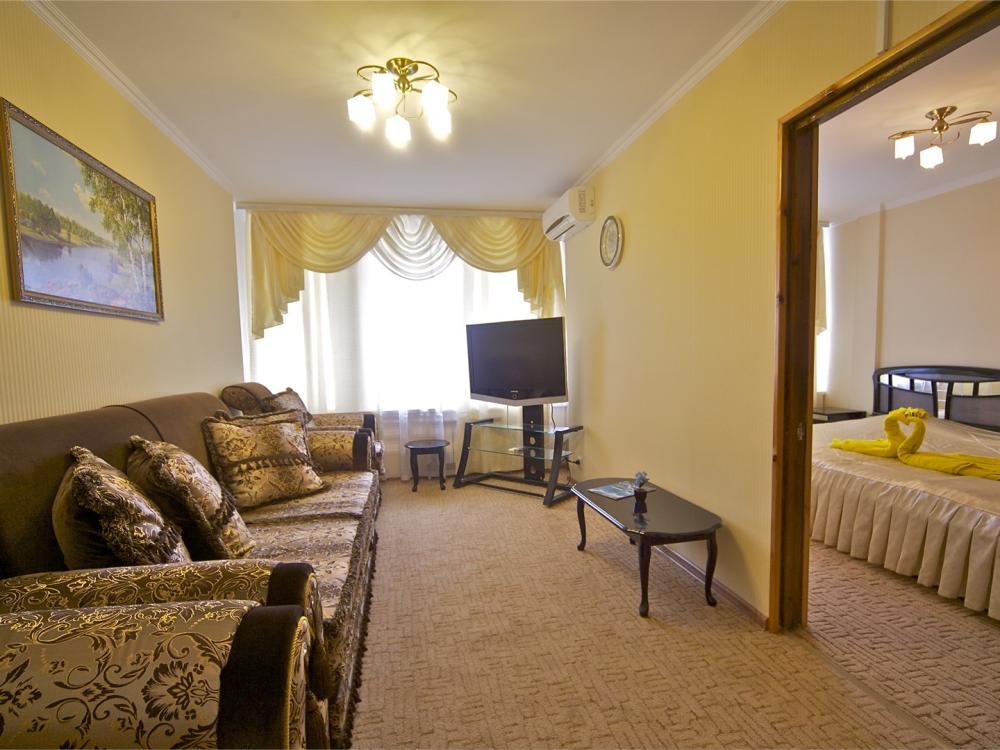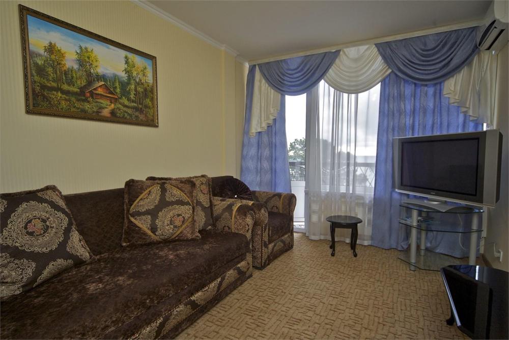 Двухкомнатные двухместные номера оборудованы телевизором, кондиционером, холодильником, мебелью, диваном, креслами, санузлом (ванна/душ), чайником, феном. В номере предусмотрено дополнительное место (диван). Номер с видом на море.