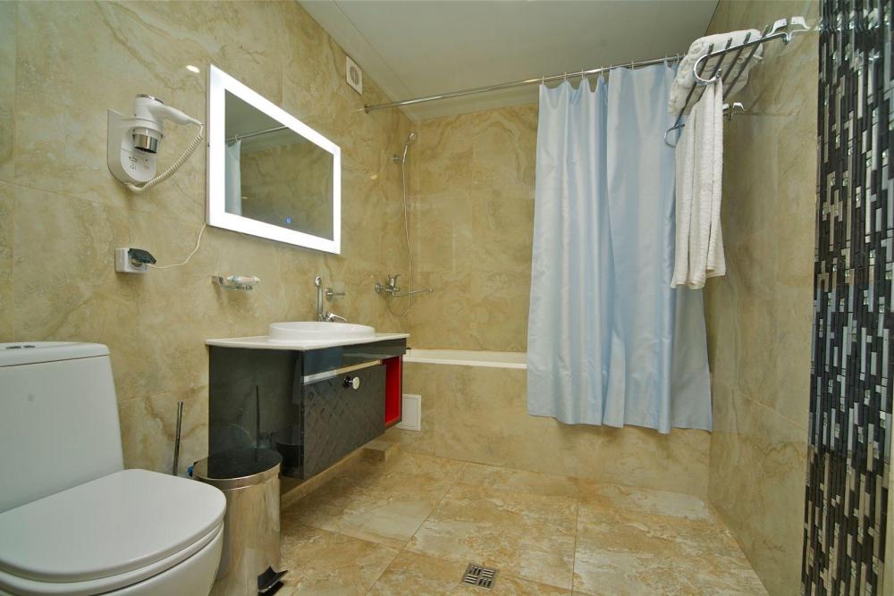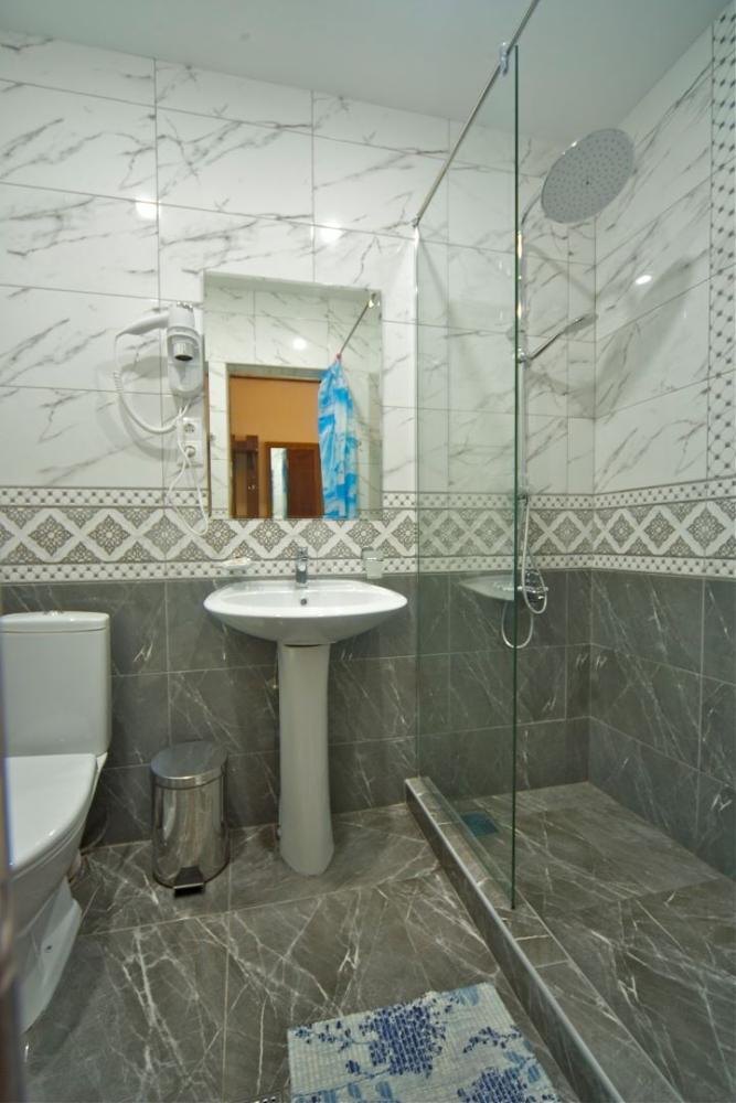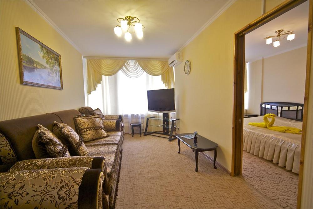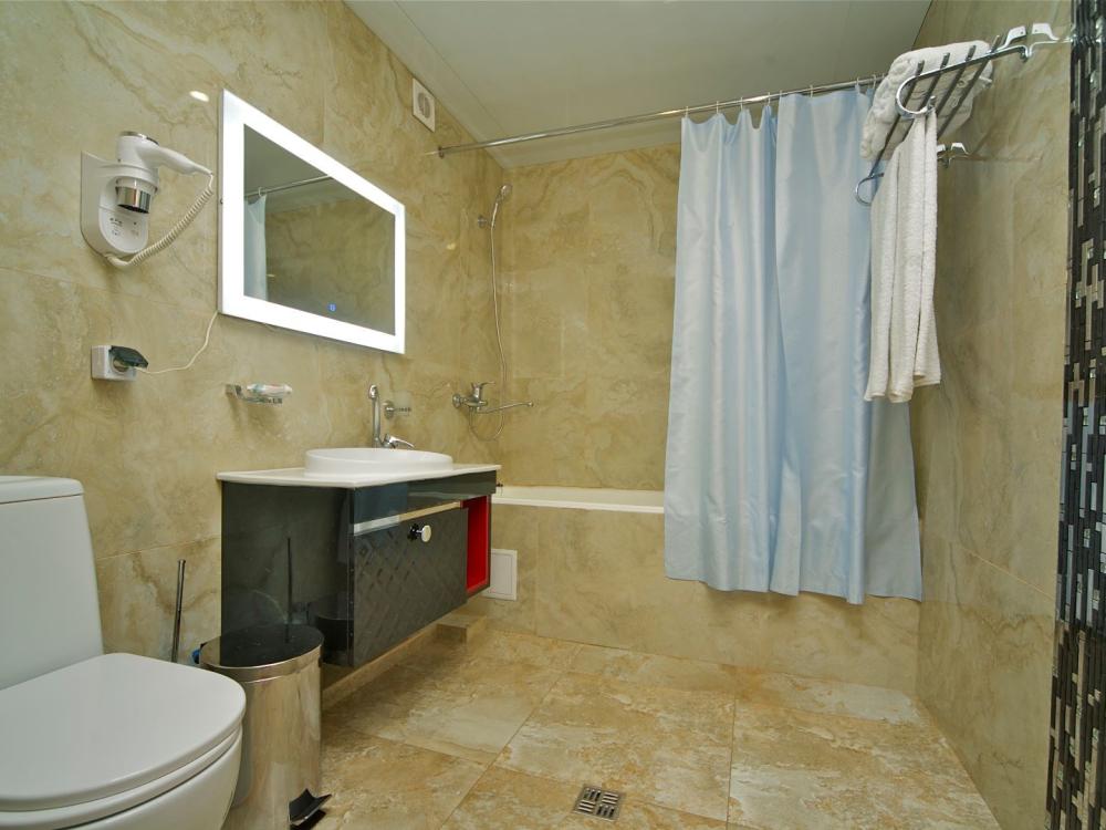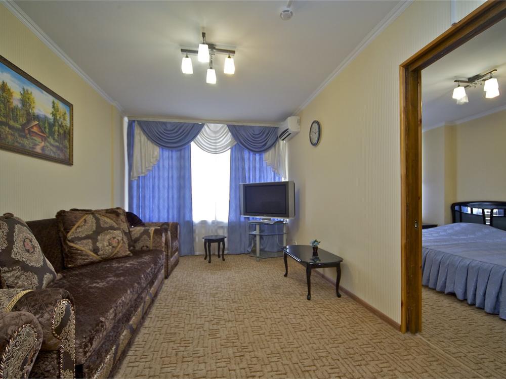 Двухкомнатные двухместные номера оборудованы телевизором, кондиционером, холодильником, мебелью, диваном, креслами, санузлом (ванна/душ), чайником, феном. В номере предусмотрено дополнительное место (диван). Номер с видом на море.
