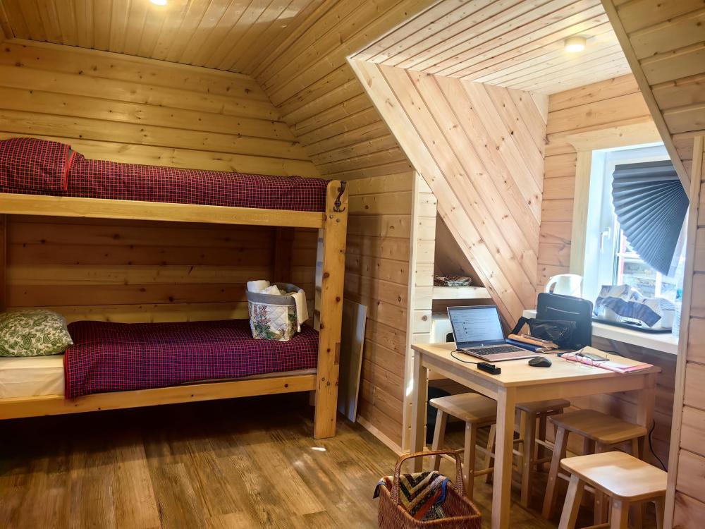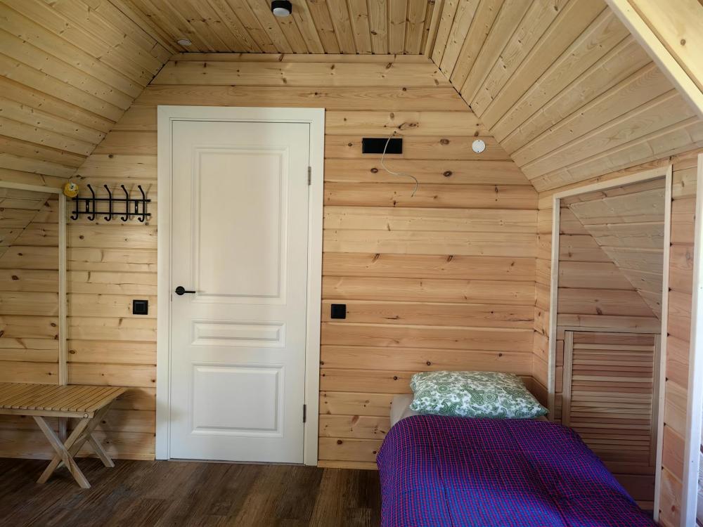 Уютная комната с двумя раздельными кроватями и дополнительным местом, предназначен для проживания двух человек, на дополнительном месте возможно разместить еще одного человека. В комнате есть стол, табуреты, необходимая посуда, обогреватель, печь. В комнате нет собственного душа и туалета.
