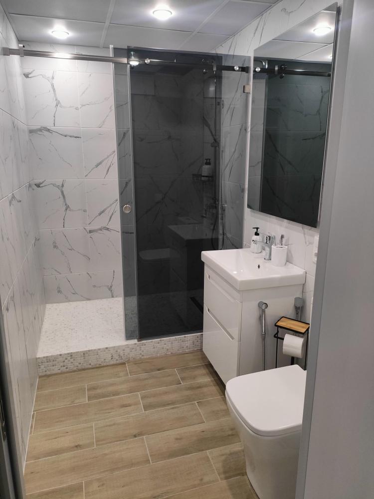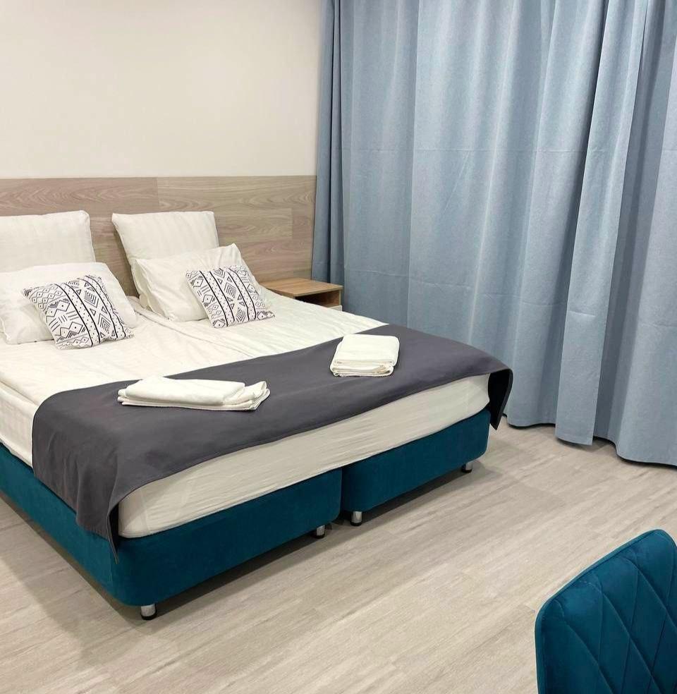 Номер стандарт Номер оборудован всем необходимым для комфортного проживания: двуспальная кровать, диван, холодильник, телевизор, микроволновая печь, обеденный стол, душевая и туалет.