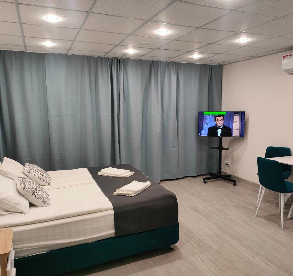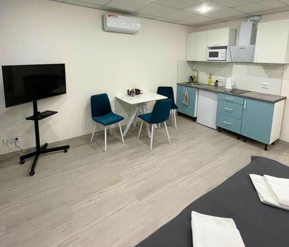 Номер студия Номер оборудован всем необходимым для комфортного проживания: двуспальная кровать, телевизор, микроволновая печь, обеденный стол, душевая и туалет.