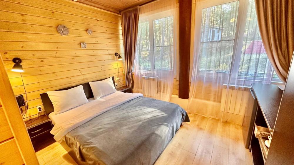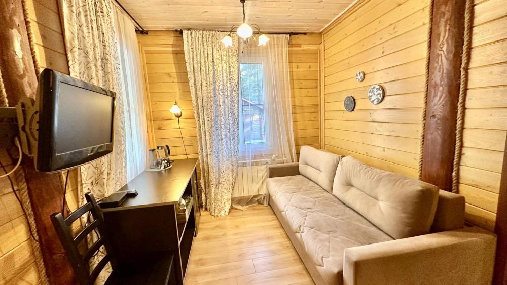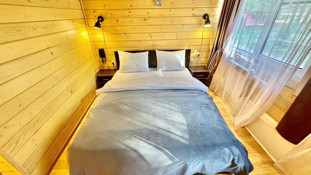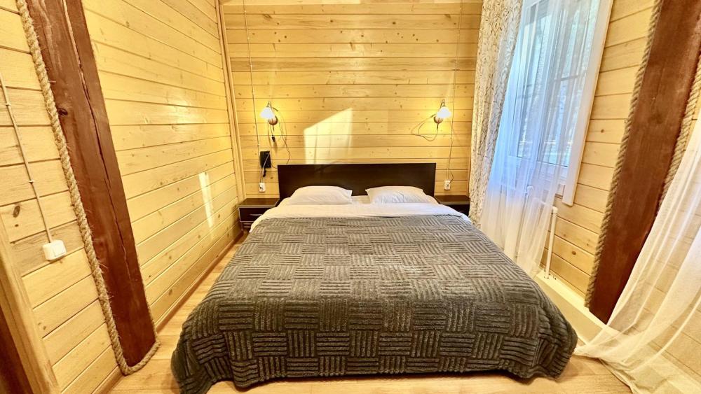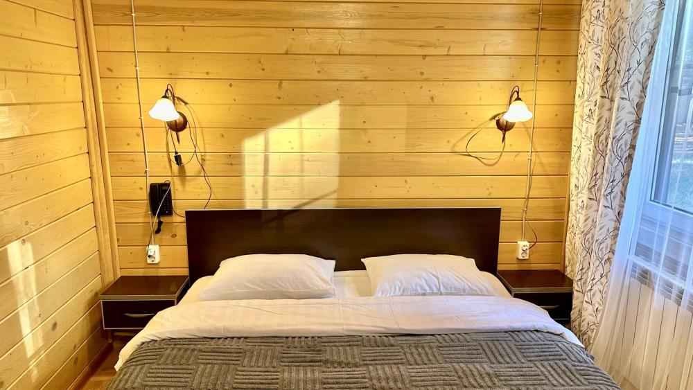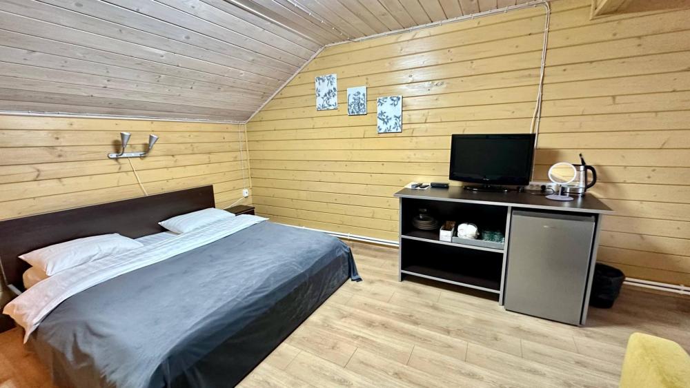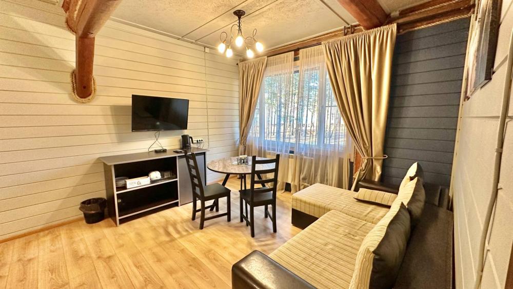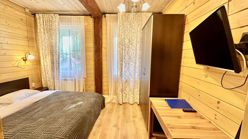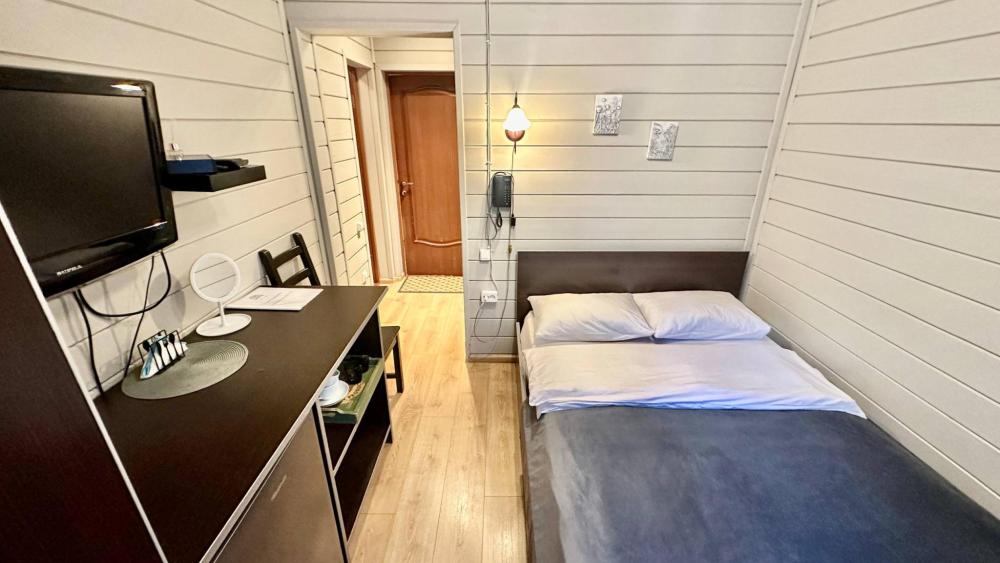 Компактный однокомнатный номер на 1-м этаже отеля с возможностью размещения одного или двух гостей. Это наш самый маленький номер, 11 м2. Номер имеет всё необходимое для комфортного проживания. Оснащение номера: 2-х спальная кровать 140*200; Телевизор; Холодильник; Электрический чайник и посуда; Фен; Собственный санузел в номере, душ с холодной и горячей водой. Вид из окон на лес. Мы предоставляем постельное бельё и полотенца. Обращаем внимание, что размещение с животными в этом номере - ЗАПРЕЩЕНО!