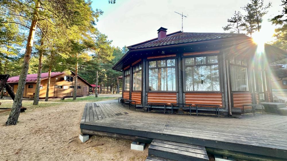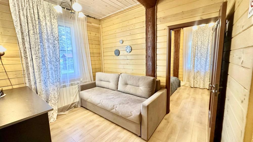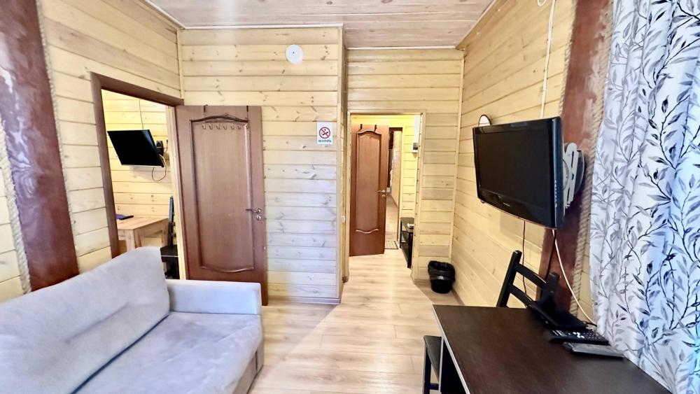 Заезд с 14:00 Выезд до 12:00 Одноэтажный, рубленый коттедж на 6 гостей состоит их трех комнат. (с возможностью размещения 2х доп. гостей, оплачиваются дополнительно) Здесь есть все необходимые условия для комфортного отдыха. Оснащение коттеджа: Общая зона, где находятся два обеденных стола, диван и стулья. Кухня оснащена холодильником, микроволновой печью, чайником, посудой на 8 персон, ТВ. Санузел и душ внутри коттеджа. Две спальни (одна их них проходная) с двуспальными и односпальными 2х ярусными кроватями. Коттедж рассчитан до 8 спальных мест. При этом есть возможность дополнительно пригласить гостей дневного пребывания. Мы предоставляем постельное бельё и полотенца.