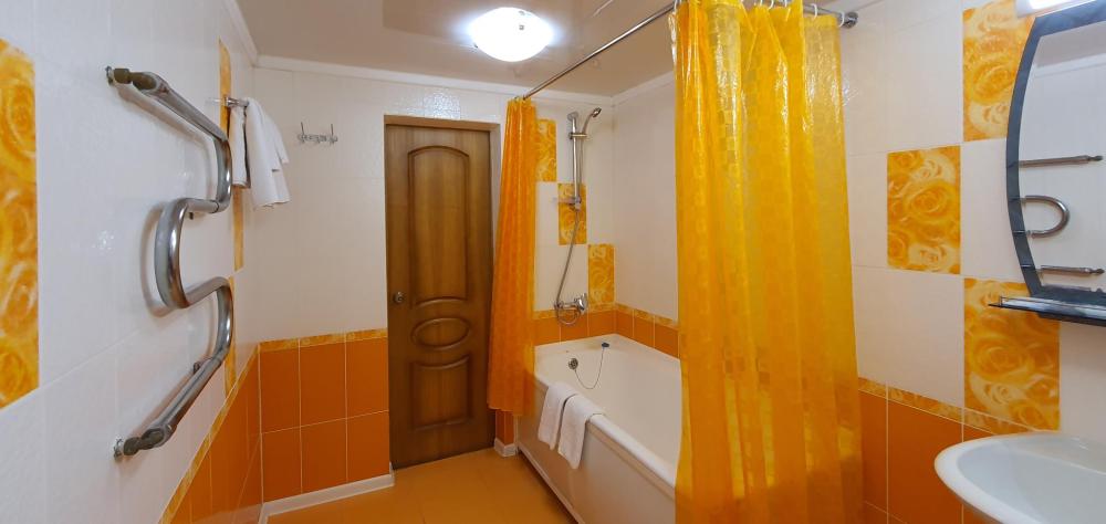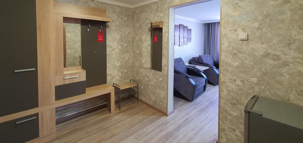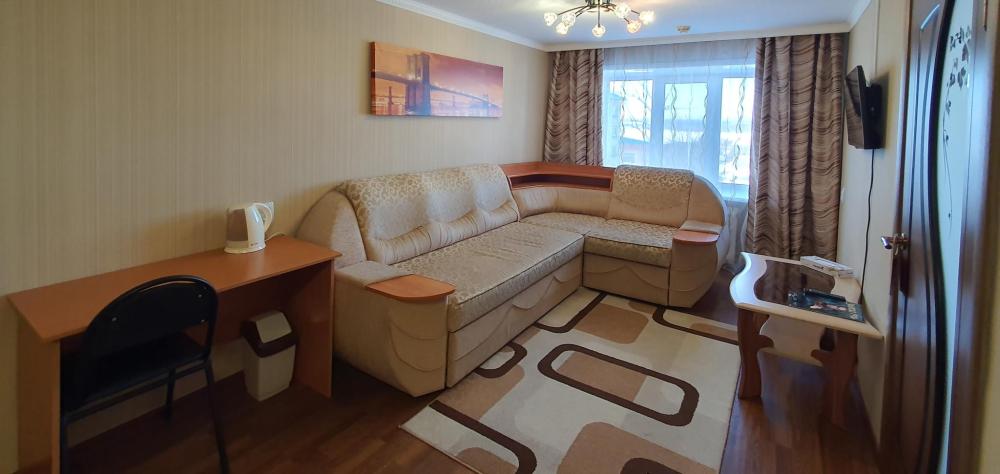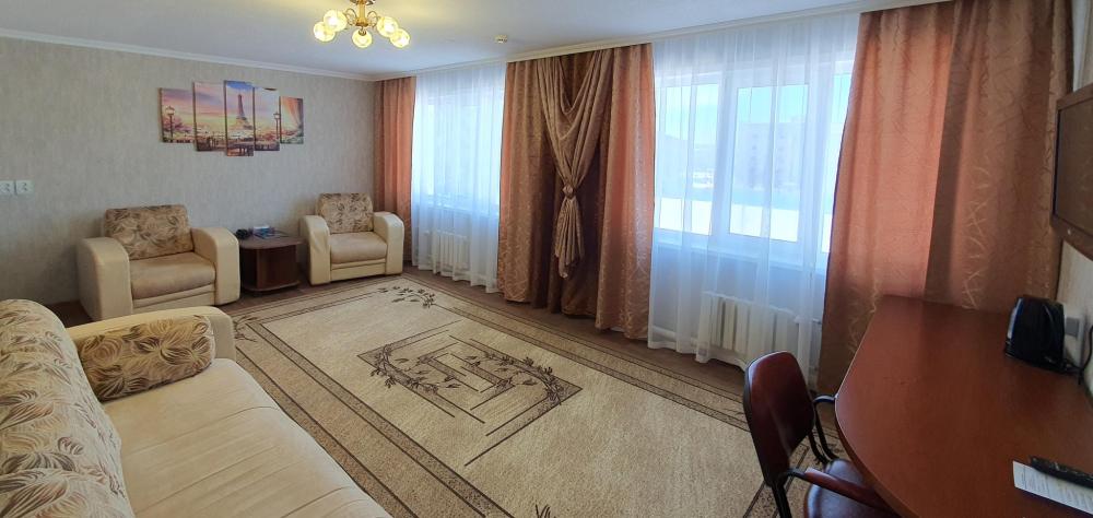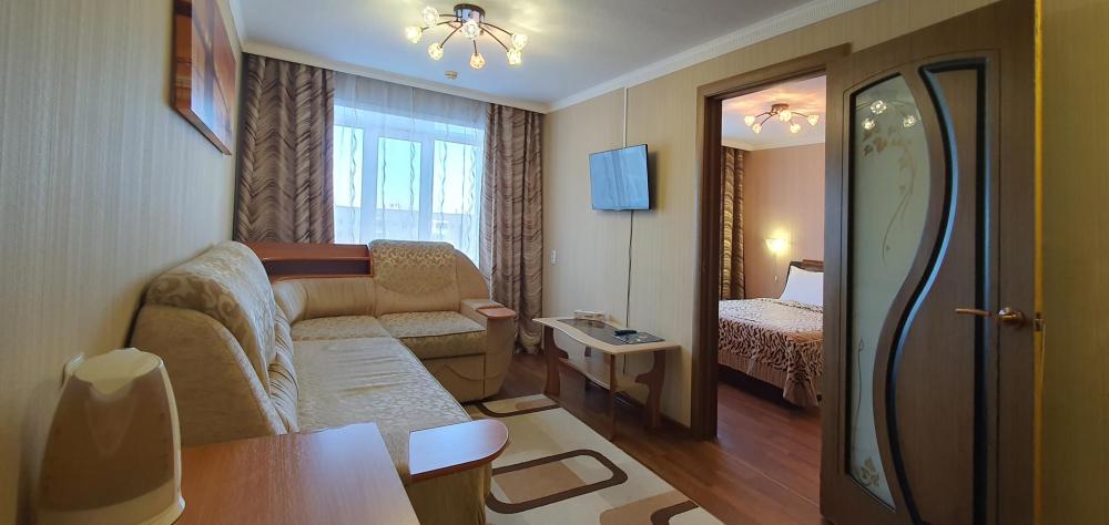Двухкомнатный двухместный номер с капитальным ремонтом. В спальне: две односпальные кровати или одна двуспальная, шкаф. В гостиной: диван и два кресла, журнальный стол, набор посуды, письменный стол, два стула, санузел в номере – ванна, телевизор, кабельное телевидение, чайник, холодильник.