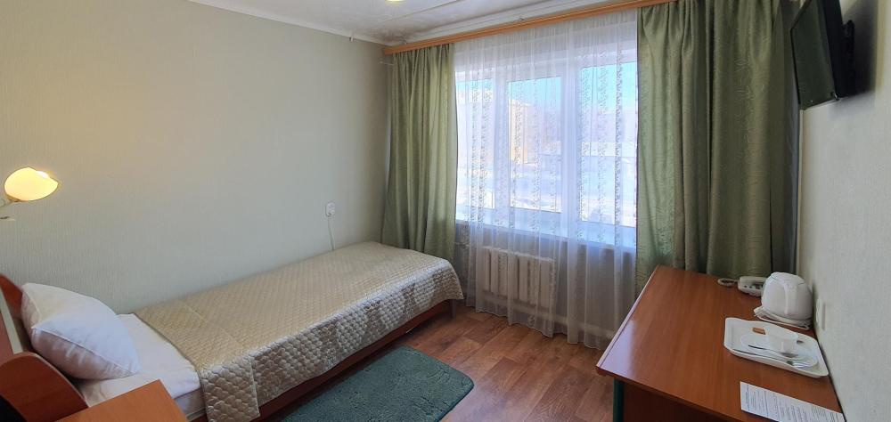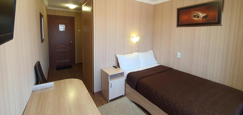 Однокомнатный одноместный номер. В номере: полутороспальная кровать, письменный стол, стул, шкаф, санузел в номере – ванна, кабельное телевидение, телефон, чайник, холодильник.
