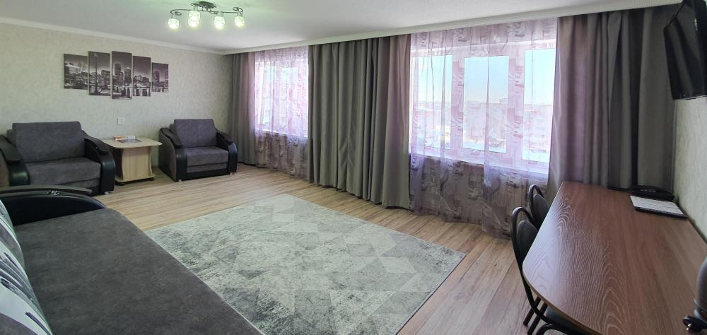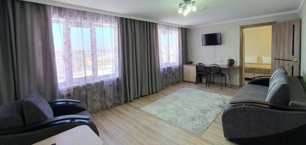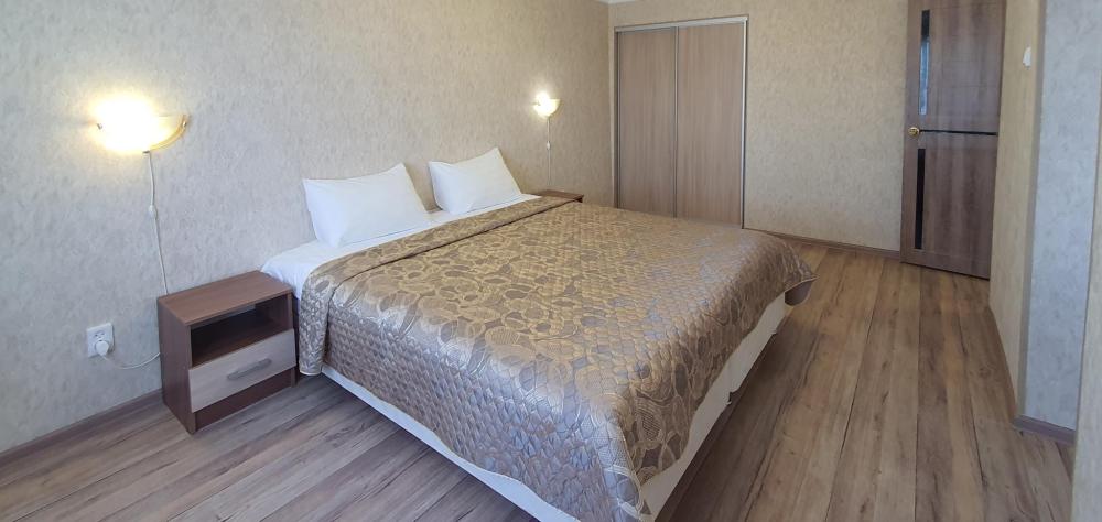 Двухкомнатный номер с капитальным ремонтом. В спальне двуспальная кровать. В гостиной диван, 2 кресла, журнальный стол, рабочий стол, стул, набор посуды, чайник, ванна, ЖК-телевизор, кабельное телевидение, телефон, холодильник.