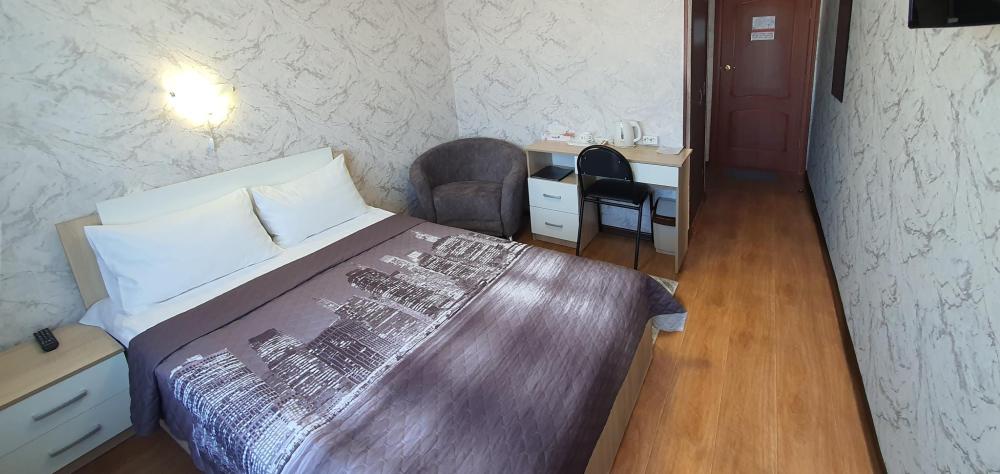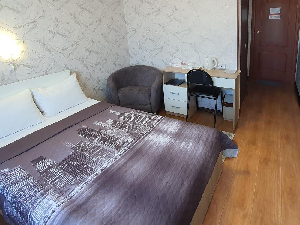 Однокомнатный номер. В номере двуспальная кровать, письменный стол, стул, кресло, шкаф, санузел в номере – ванна, кабельное телевидение, чайник, холодильник, телефон.
