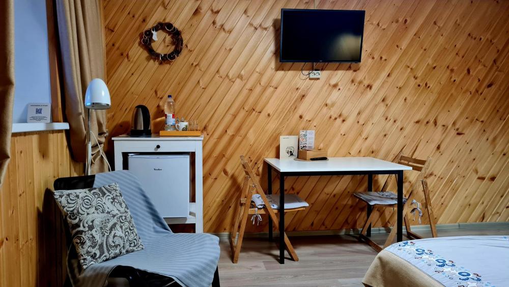 Апартаменты-студио с отдельным входом на 2м этаже с видом на лес. По расположению как однокомнатная квартира-студия. В апартаментах есть кухня со всем необходимым, обеденная зона, камин (электро), санузел (шампунь, гель для душа, тапочки, фен). Спальные места 2 односпальные кровати и двуспальный диван. Детская кроватка предоставляется по требованию. На территории к вашим услугам зоны для пикника, беседка, русская баня (за доп.плату), прогулочная эко-тропа, берег озера Валдайского в шаговой доступности, батут, спорт.площадка, аренда велосипедов, аренда лодки (весла, электромотор). Гости с домашними питомцами (возможно СТРОГО по согласованию и за доп.плату) проживают по следующим правилам: питомец не спит на белье и диване, не разговаривает в номере, не остается в номере в ваше отсутствие! Взымается плата за финальную уборку.