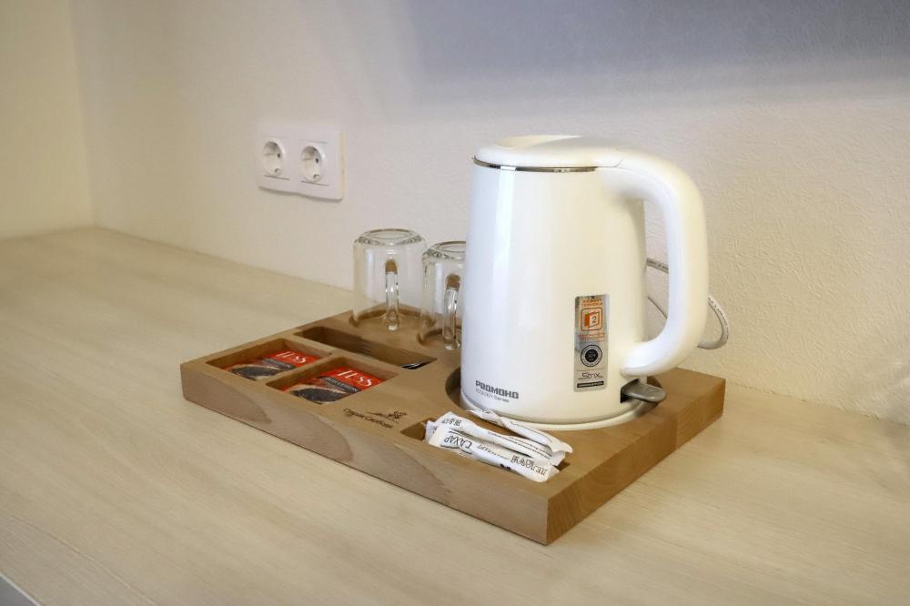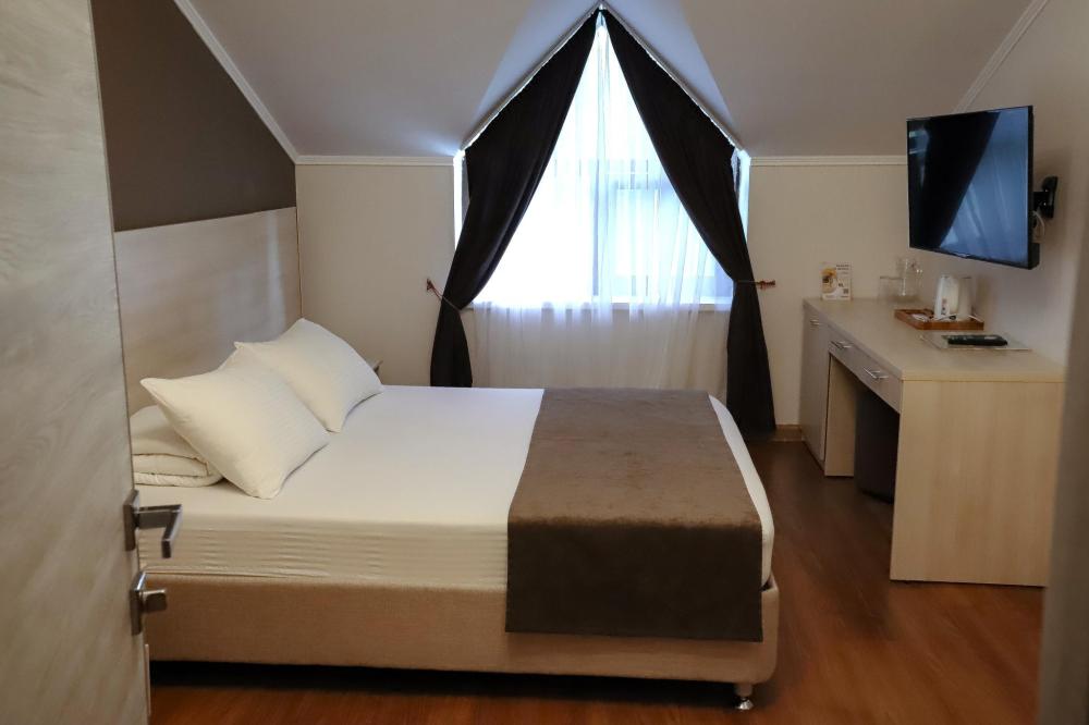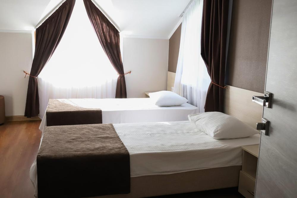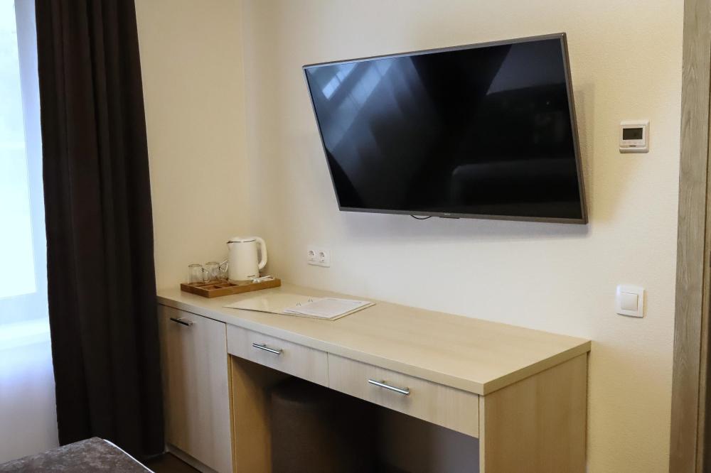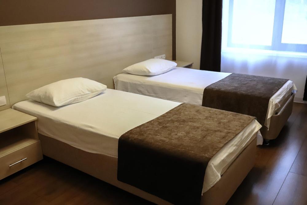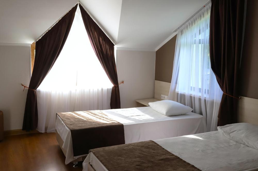 В каждом номере имеется телевизор, холодильник, телефон, фен, две кровати, тумбы, столик, стулья, санузел (душевая кабинка); утюг можно взять у администратора.