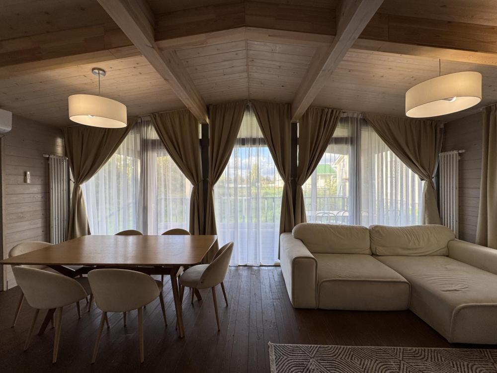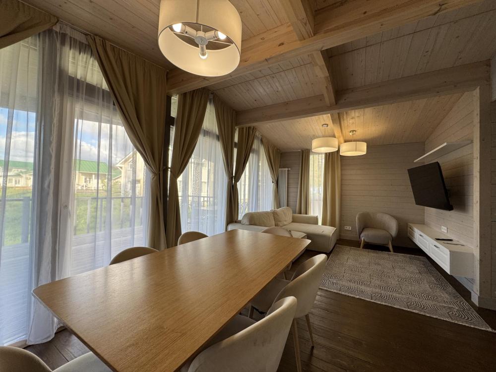 Новый восьмиместный комфортабельный коттедж с панорамным остеклением. Сдан в эксплуатацию 1 января 2024 года В коттедже большая кухня-гостиная, четыре отдельных спальни, два туалета и большая зона отдыха. Внутри коттедж оборудован всем необходимым для кратковременного и длительного проживания. Рядом с коттеджем есть гриль-домик, рассчитанный на гостей данного номера. Пользование грилем предоставляется без оплаты.