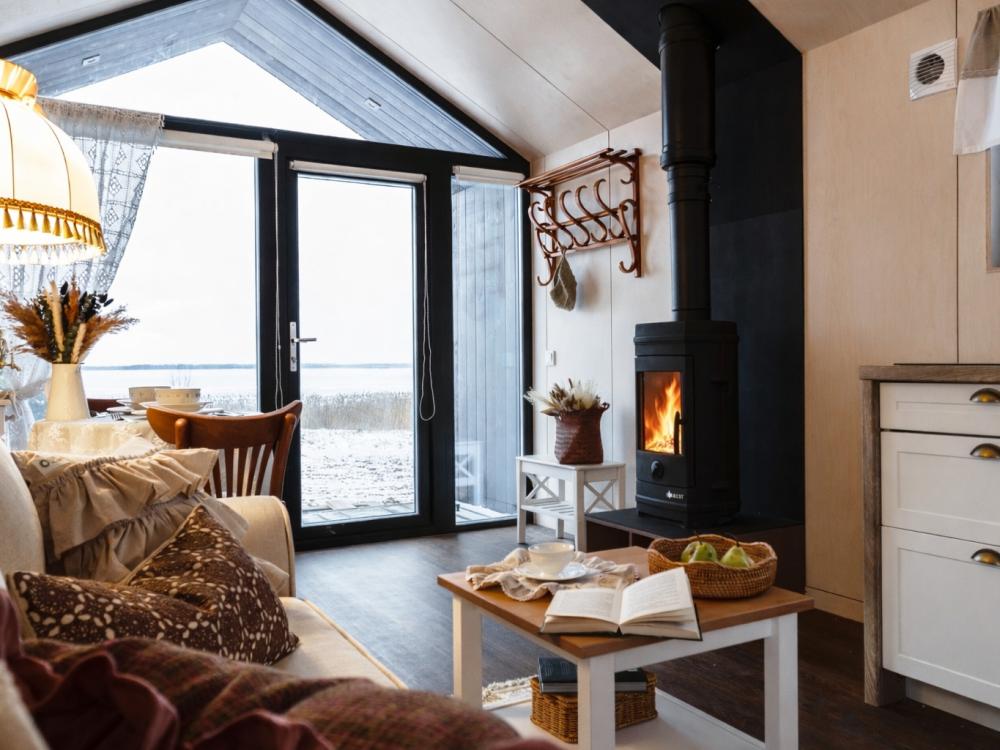Двухэтажный дом из сруба с обновленным интерьером и настоящей дровяной печью. У дома свой участок с террасой, мангалом и видом на озеро. Вместимость: 6 человек. Кровати: одна двухспальная и две односпальные (2 отдельные спальни на втором этаже); два спальных места на первом этаже в гостиной. Удобства: кухня, обеденная зона, холодильник, микроволновая печь, электроплита, чайник, печь, дрова, посуда, кофе, чай, полотенца, жидкое мыло, фен. В доме два санузла на первом и втором этажах. Дом отапливается печью, на которой можно готовить еду. Есть дровница. Полная реновация дома произведена в 2025 году.