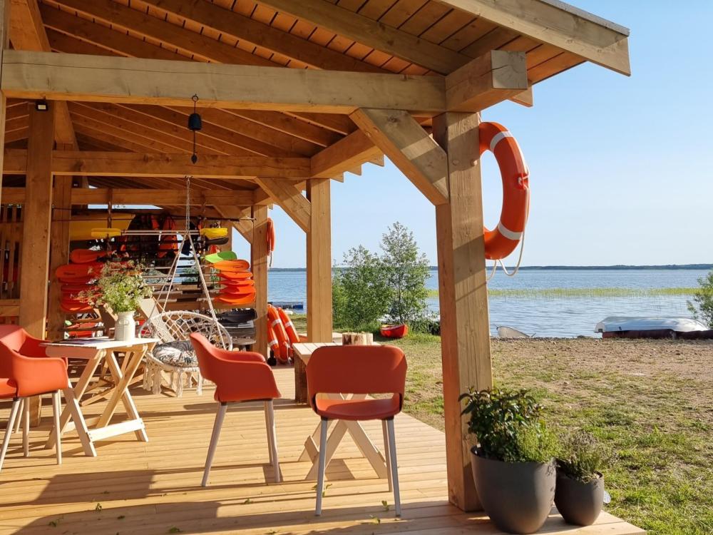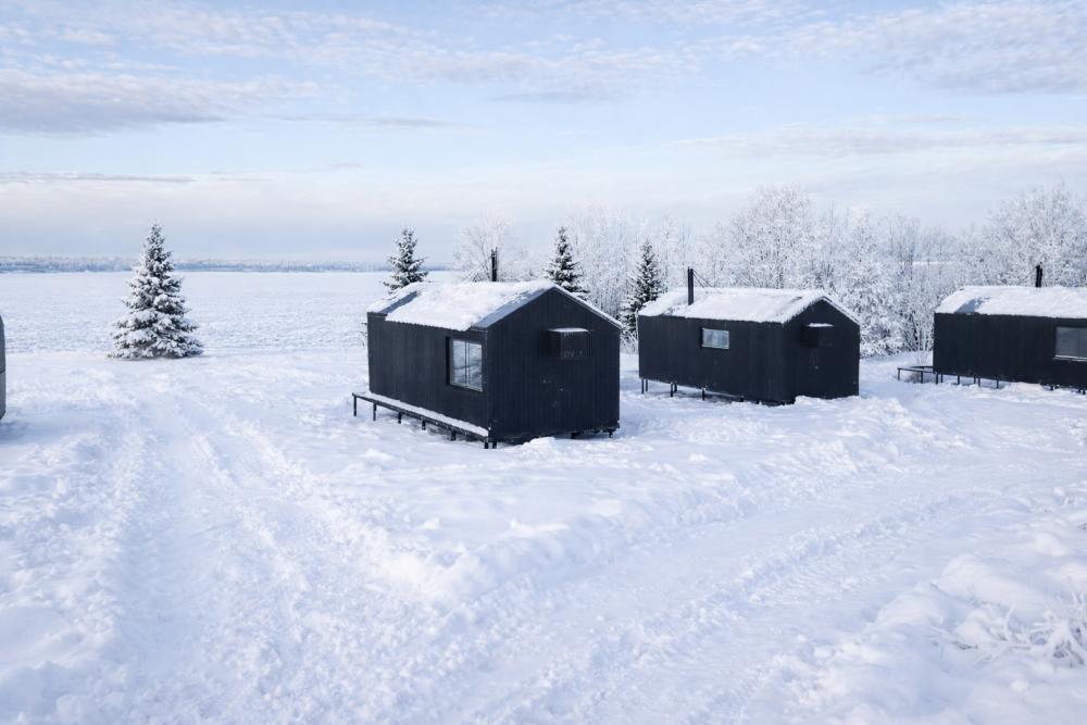 Палатки изготовлены из эко-материалов и имеют дизайнерский интерьер. Внутри палатка оснащена мебелью из дуба ручной работы, на полу расстелен джутовый ковер, постель заправлена бельем изо льна. Глэмпинг располагается на индивидуальном помосте с террасой и своим спуском к берегу озера. — Просторная веранда с комфортными шезлонгами, столиком и видом на озеро — Большая двухспальная кровать с подогревом и мягким льняным постельным бельем — Удобный диван, который может использоваться для дополнительного размещения, и журнальный столик — Комод и вешалка для вещей — Обогреватель с функцией вентилирования — Набор посуды и чайник — Холодильник — Чай и кофе — За каждым глэмпингом закреплен свой отдельный душевой блок.