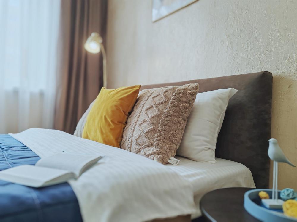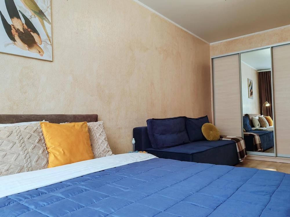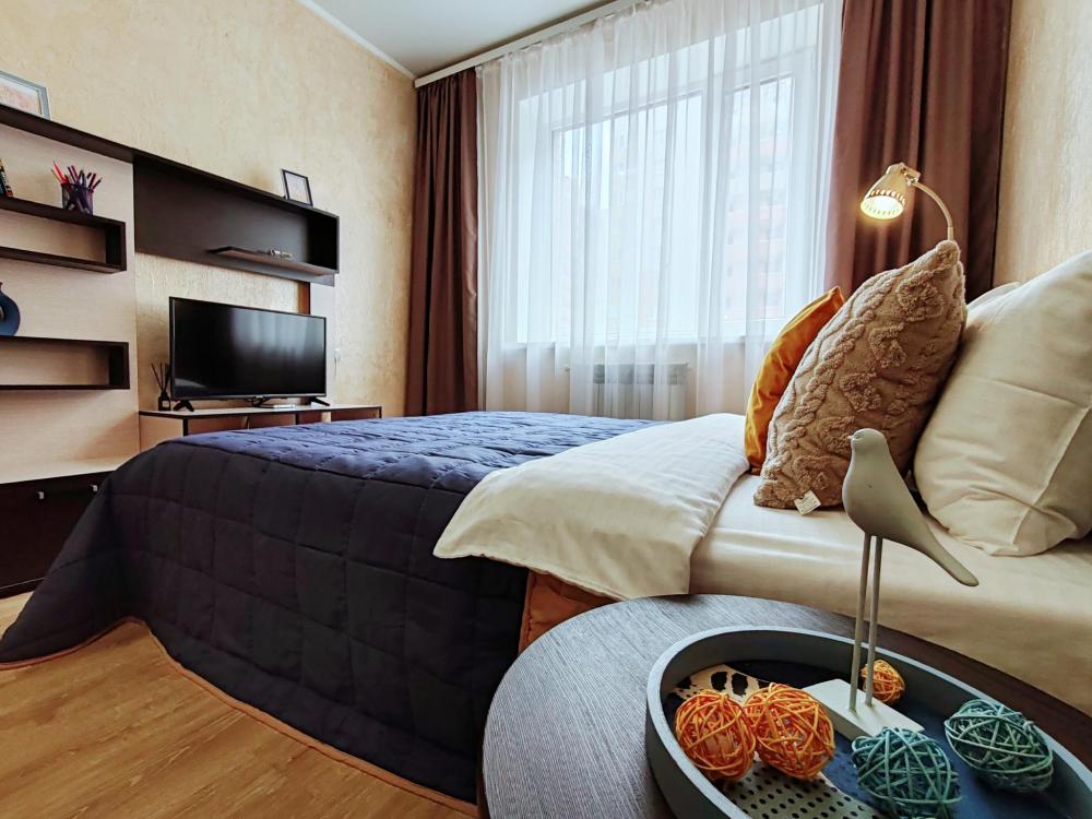 В апартаментах возможно размещение 4 человек. Спальные места: двуспальная кровать 140*200 с ортопедическим матрасом, раскладной диван 150*200. Кухня оборудована необходимой посудой и техникой: варочная поверхность, микроволновая печь, электрический чайник, холодильник. К услугам гостей также телевизор, wi-fi, стиральная машина, утюг, гладильная доска, фен, постельное белье, полотенца, гигиенические принадлежности.