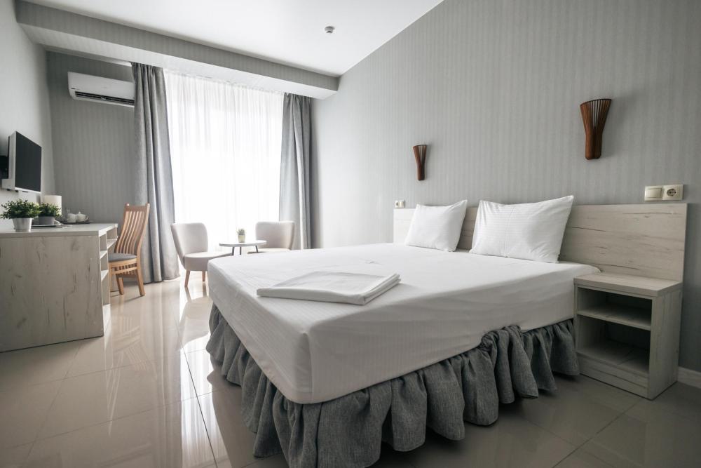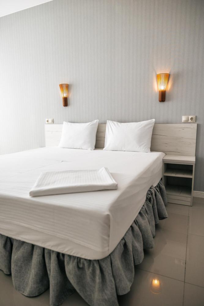 Одна большая кровать (180х200). Площадь номера 18-20 кв м. Большие панорамные окна, портьеры блекаут. Большой телевизор Smart TV, холодильник, кондиционер, Wi-Fi, рабочий стол, кофейный столик. Чайные и косметические принадлежности. Санузел оснащен душевой кабиной.