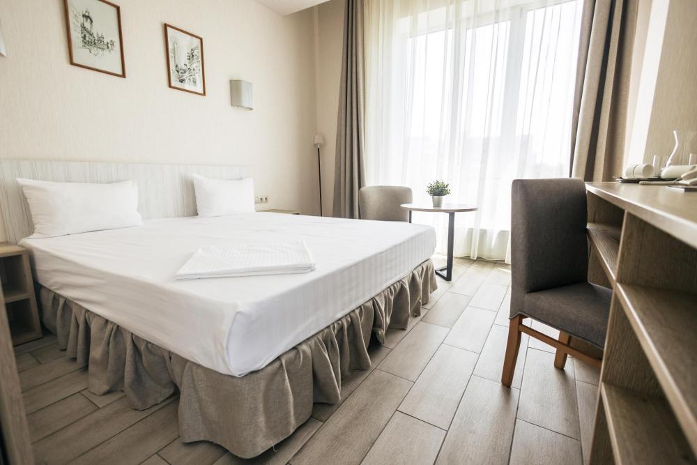 Двухместный номер, стандарт, площадь колеблется от 18 до 25 кв. м. В каждом номере по запросу гостей кровать размером 180х200, либо 2 кровати 90х200. А также дополнительное спальное место. Рядом с кроватью находится тумбочка. Особое внимание уделено расположению розеток и освещения . В шкафу могут разместить вещи несколько гостей. За письменным столом удобно поработать, а в кресле у окна расслабиться с чашечкой чая и посмотреть телевизор. Санузлы в двухместный номерах оснащены душевой кабиной или ванной. К услугам гостей свежее белье, полотенца, косметические принадлежности и одноразовые тапочки.