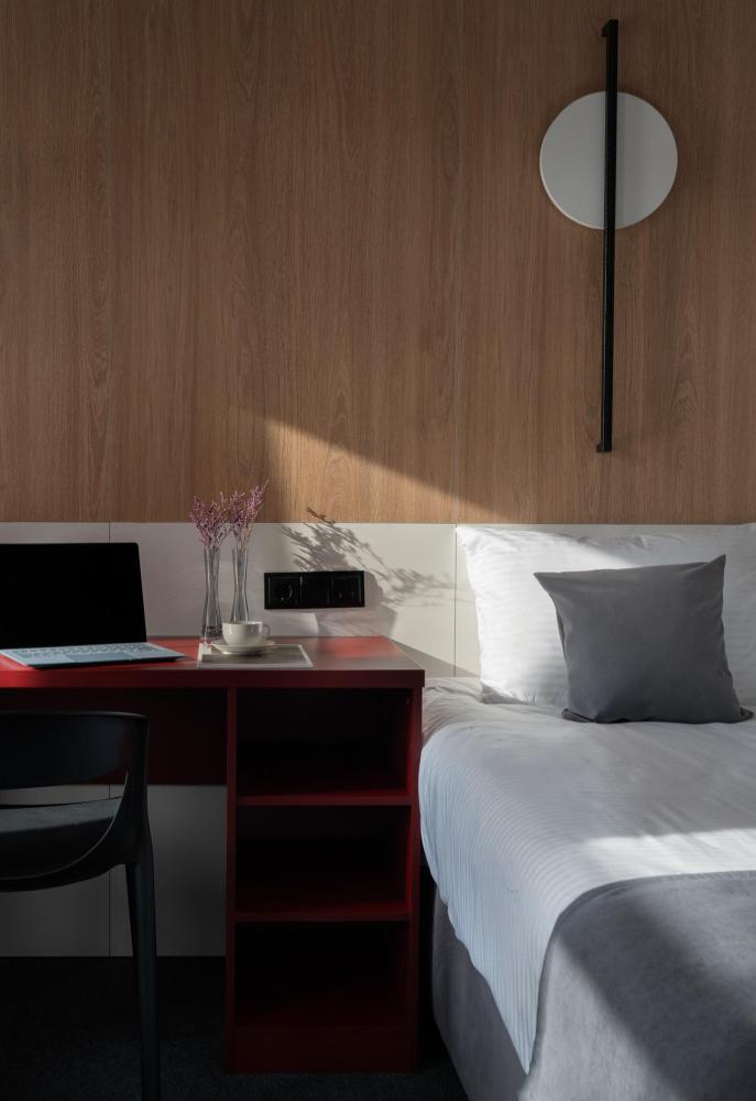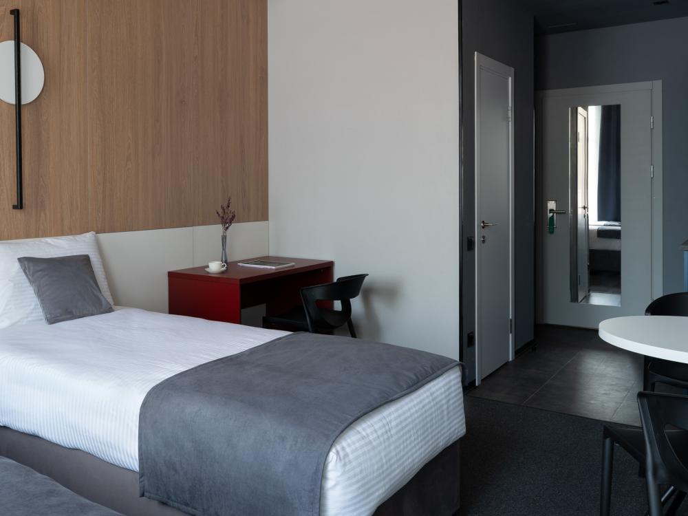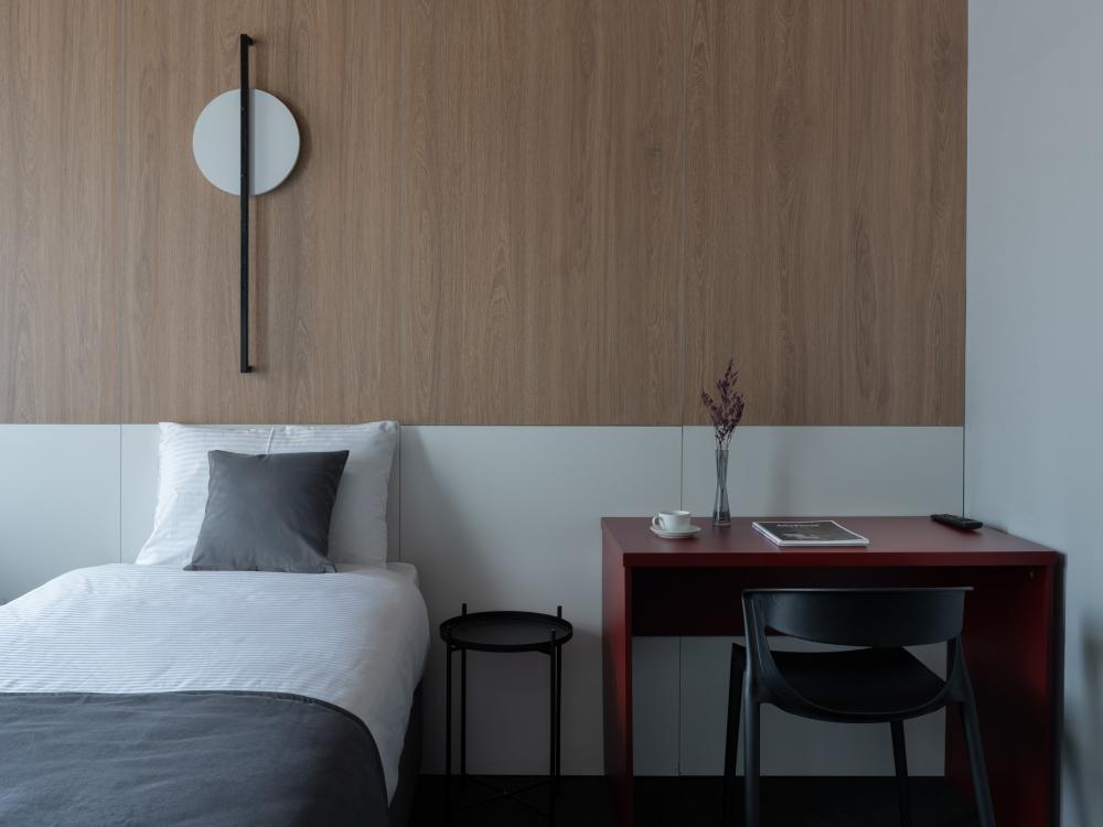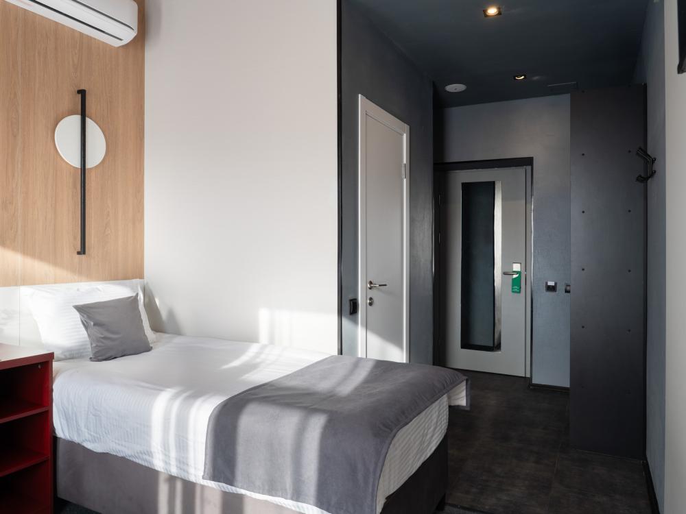 Номер площадью 10 м2. с 1 односпальной кроватью 80*200 см. Вместимость номера - 1 гость. В номере: кондиционер, телевизор, высокие потолки, шкаф, вешалки, зеркало, письменный стол, стул, тапочки, светонепроницаемые шторы. В ванной комнате: душ, туалет, раковина, полотенца, туалетно-косметические принадлежности, фен.