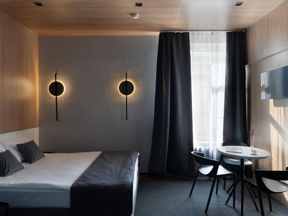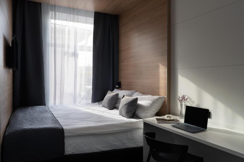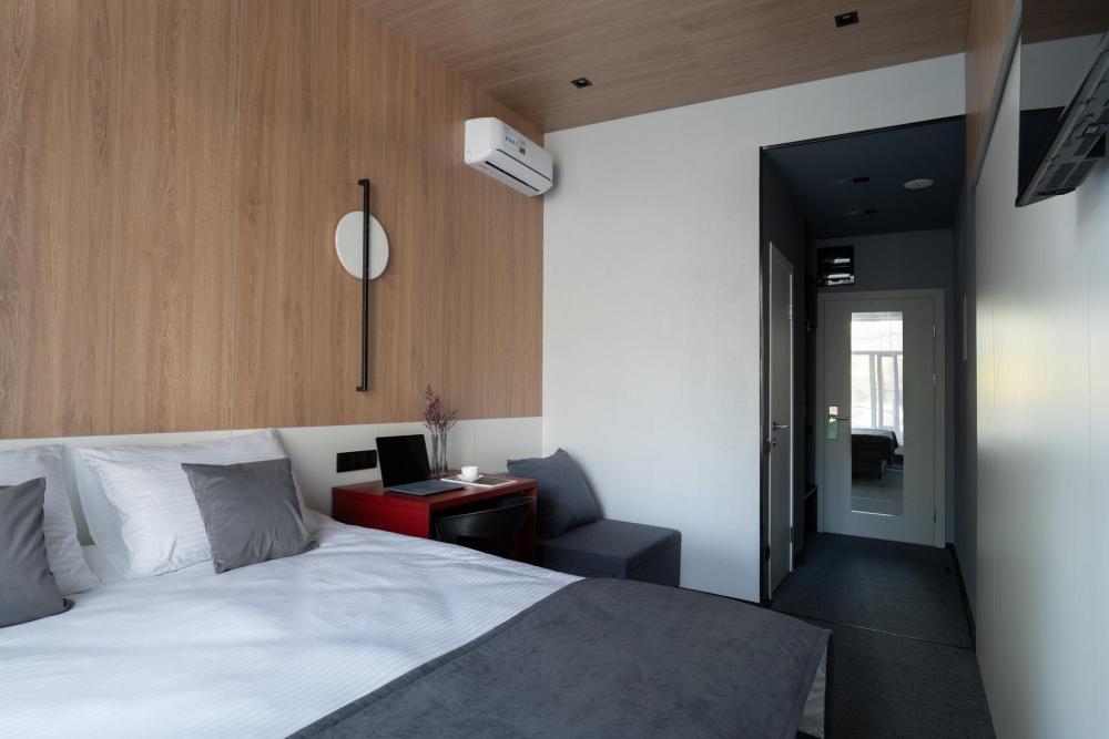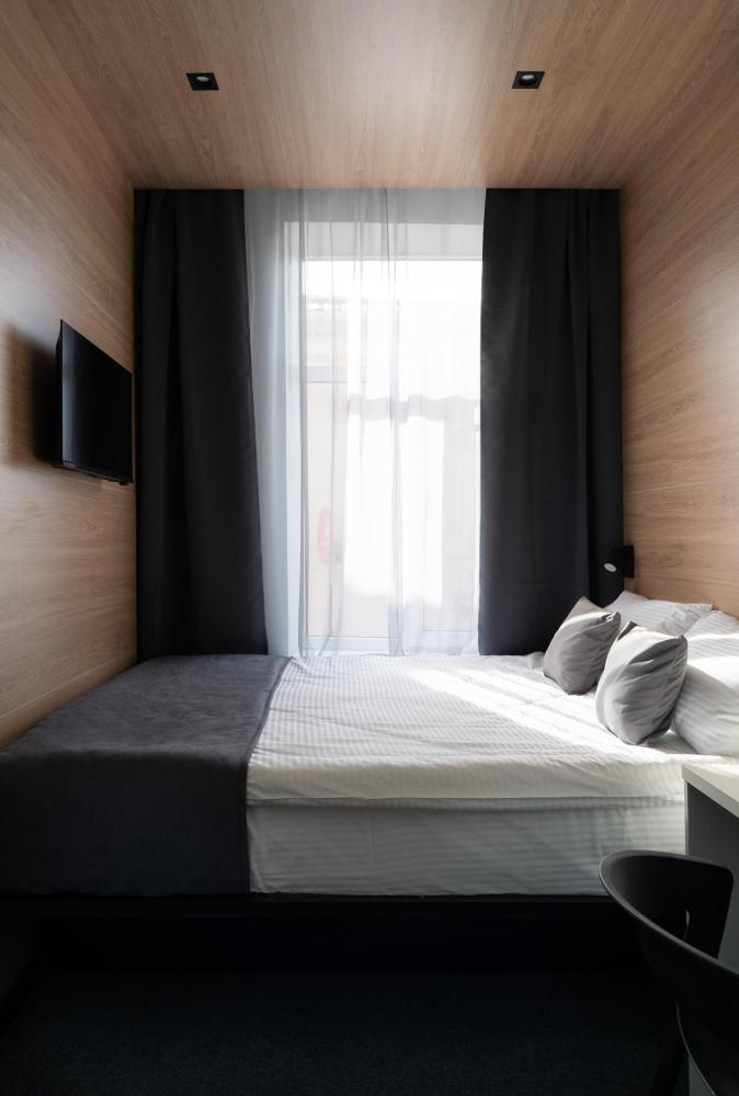 Номер площадью 12 м2. с 1 двуспальной кроватью 150*200 см. Вместимость номера - 2 гостя. В номере: кондиционер, телевизор, высокие потолки, шкаф, вешалки, зеркало, письменный стол, стул, тапочки, светонепроницаемые шторы. В ванной комнате: душ, туалет, раковина, полотенца, туалетно-косметические принадлежности, фен.