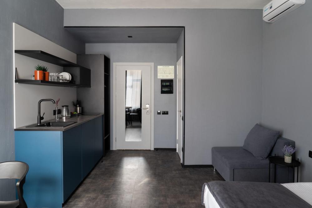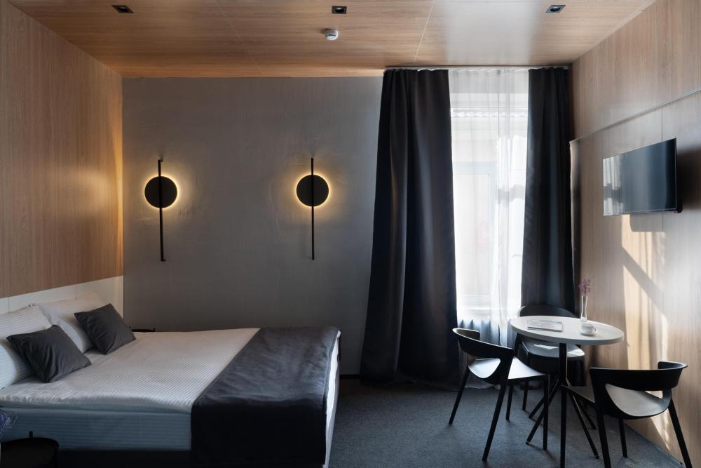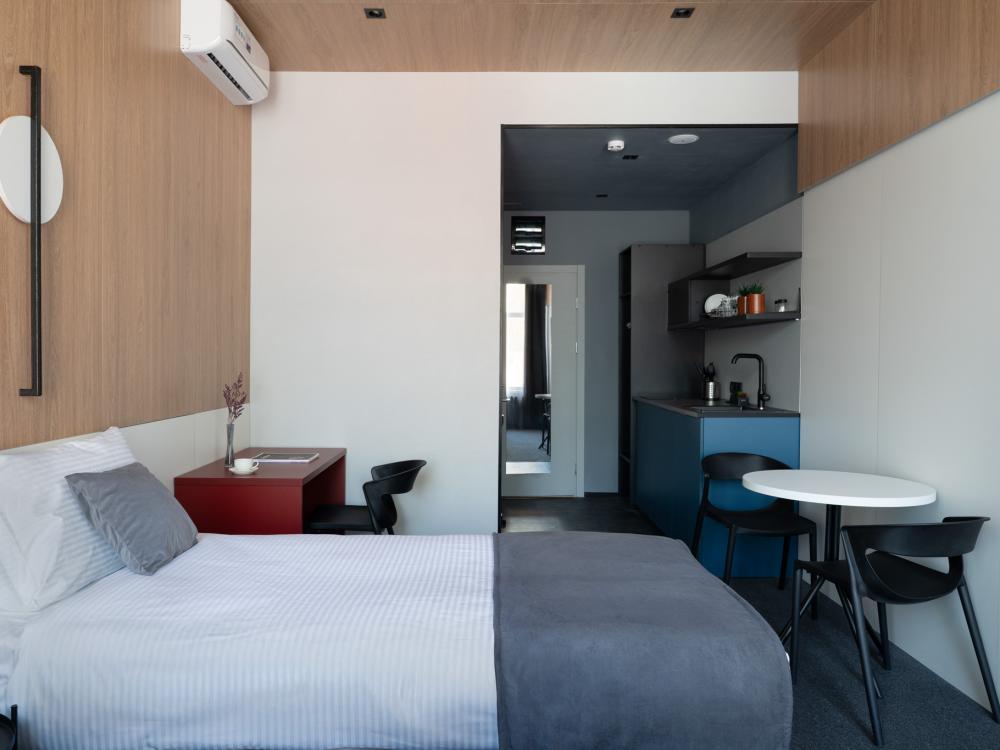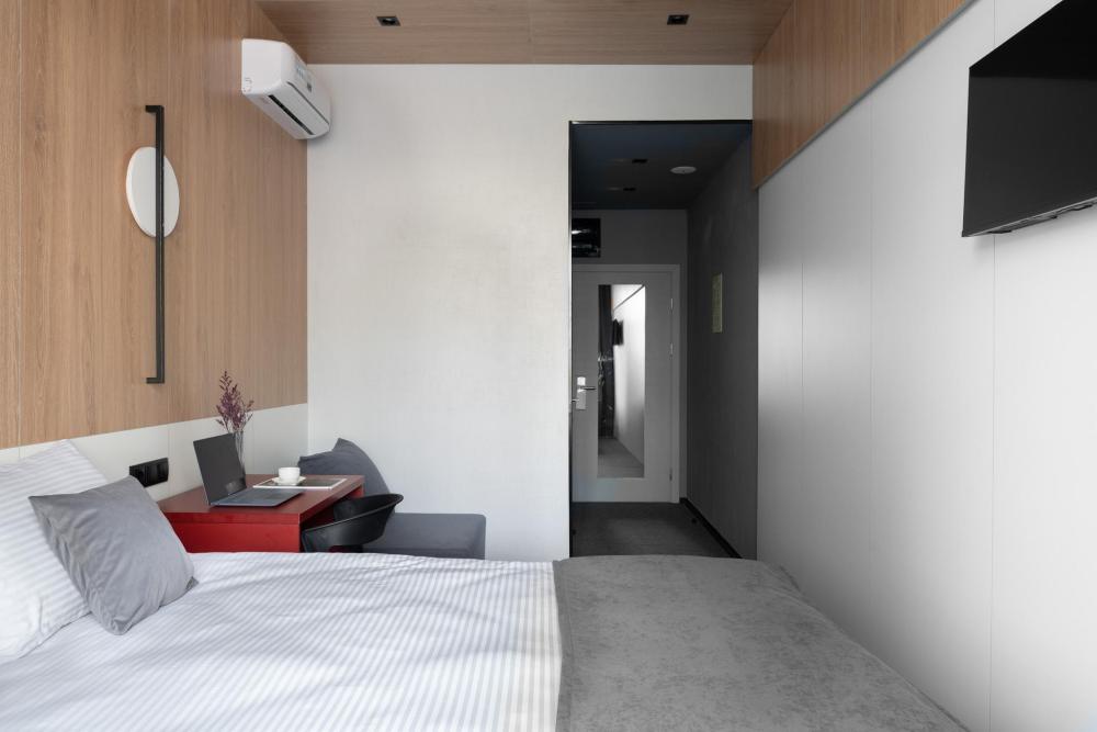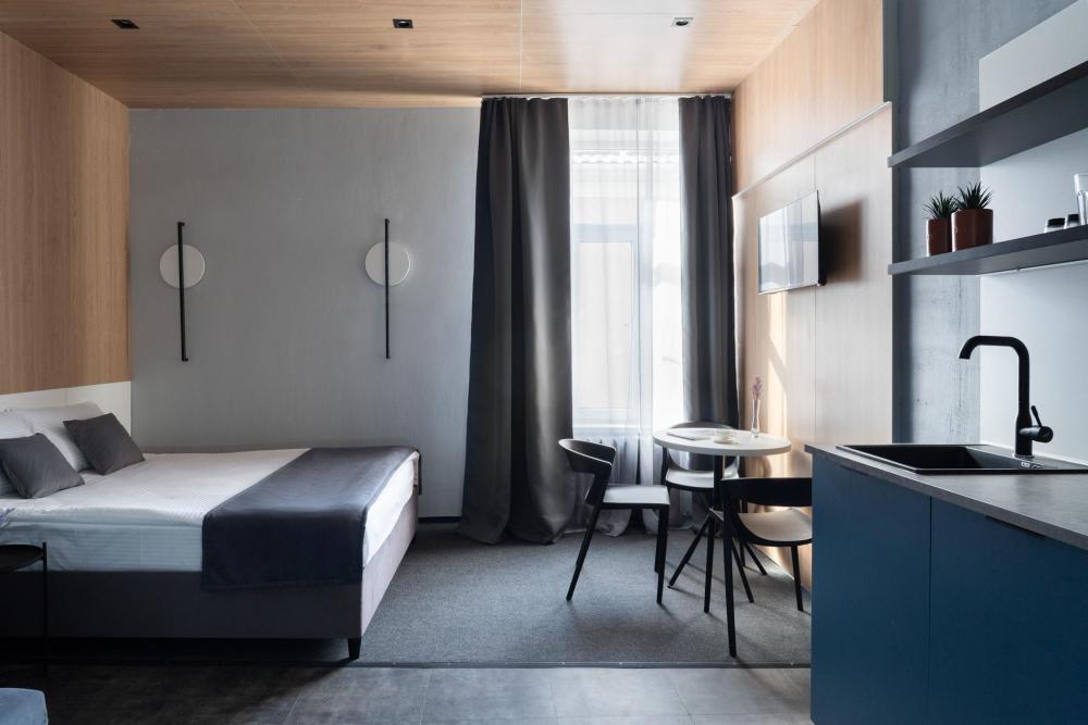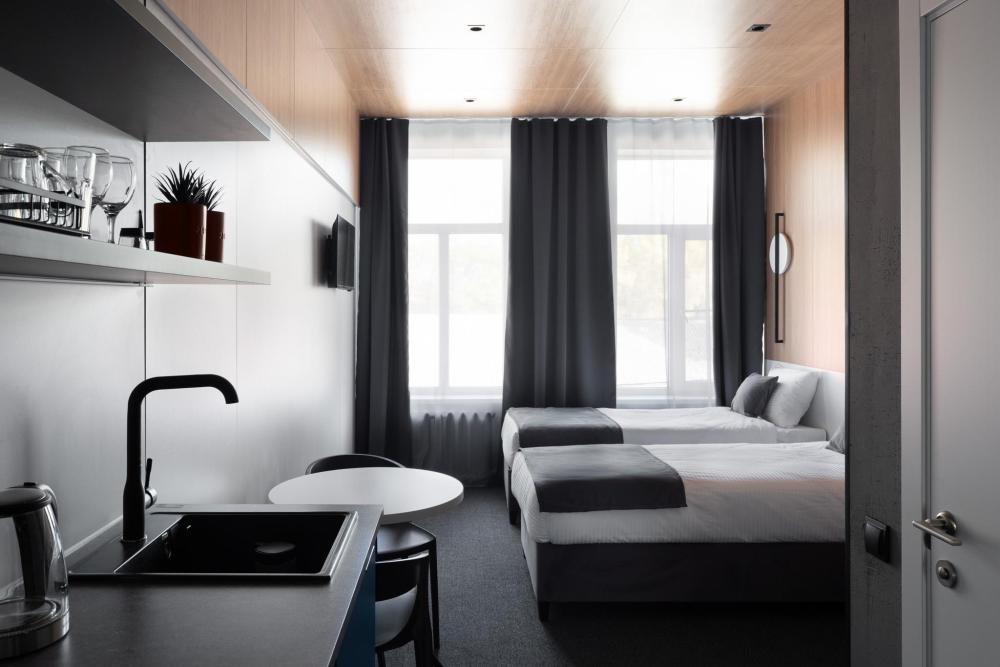 Номер площадью 14-18 м2. с 1 двуспальной кроватью 160*200 см. или 2 односпальными кроватями 90*200 см. Вместимость номера - 2 гостя. В номере: мини-кухня (микроволновая печь, плита, холодильник, посуда, столовые приборы, чайник, тостер), обеденный стол, кондиционер, телевизор, высокие потолки, шкаф, вешалки, зеркало, письменный стол, кофейный столик, стул, тапочки, светонепроницаемые шторы. В ванной комнате: душ, туалет, раковина, полотенца, туалетно-косметические принадлежности, фен.