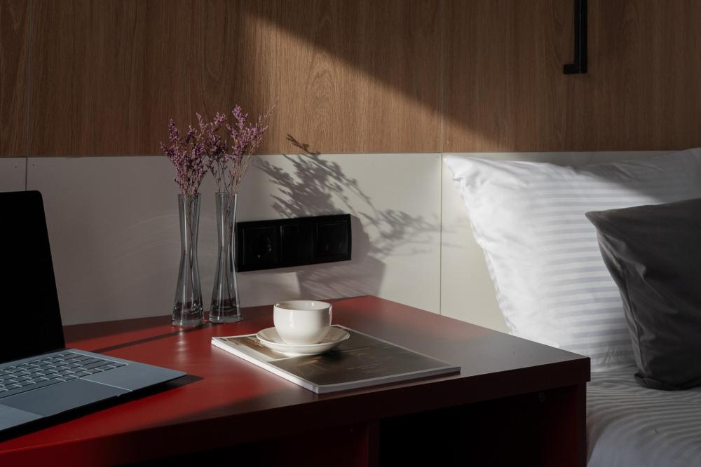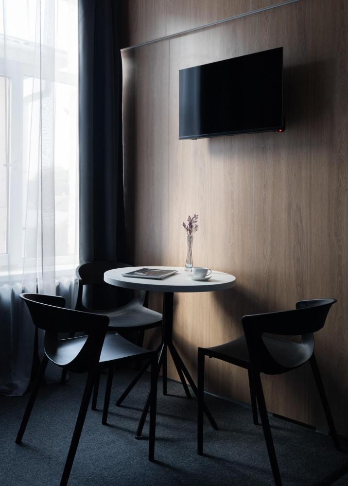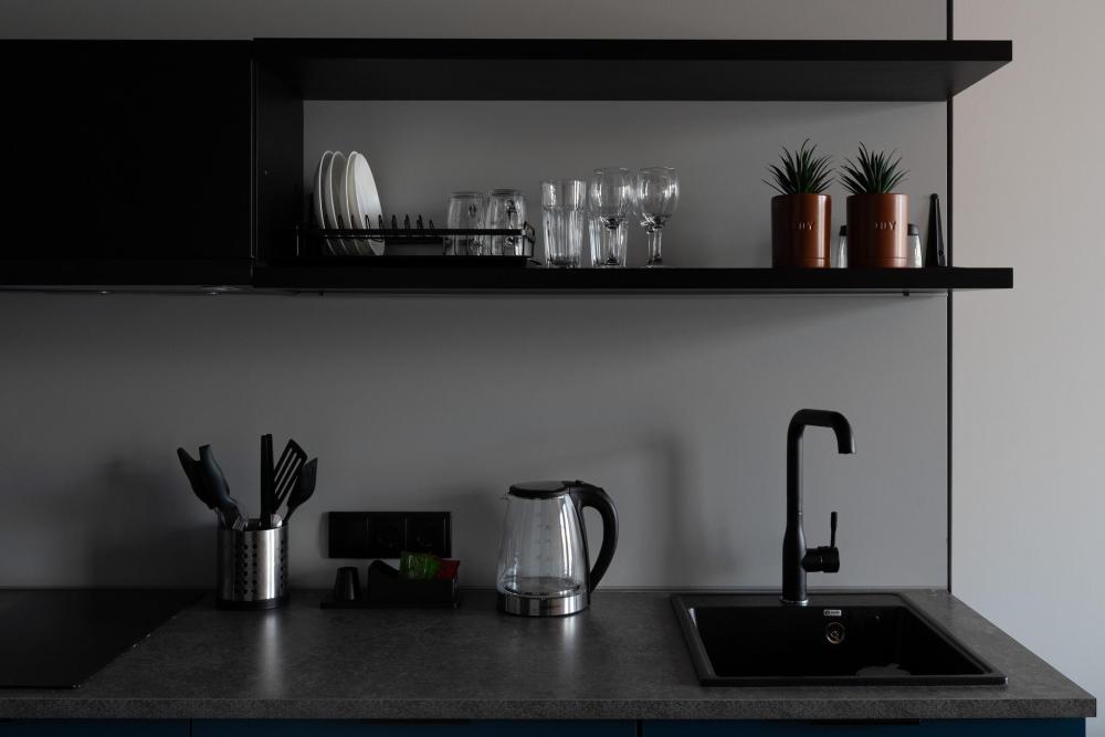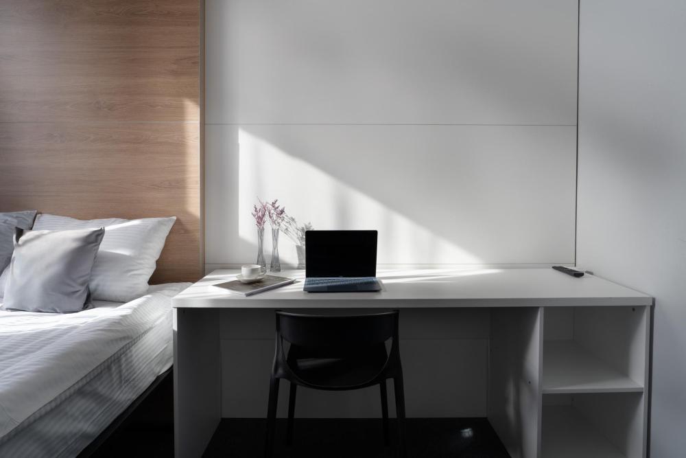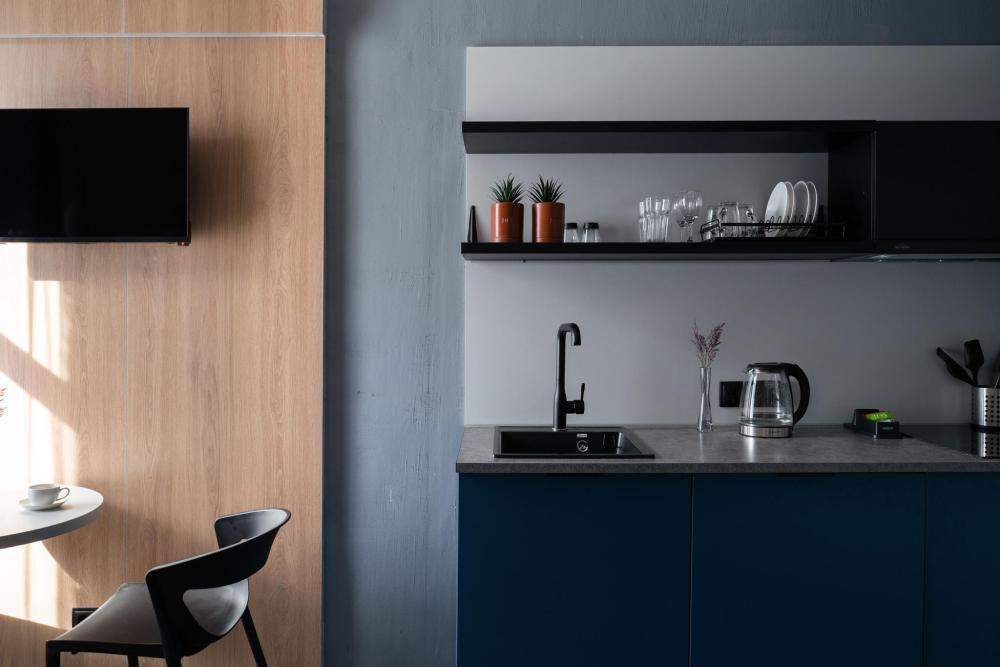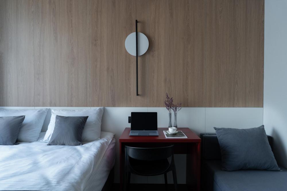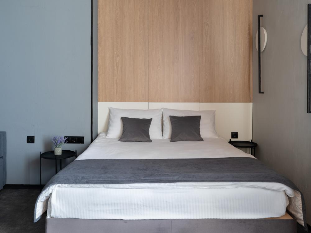 Номер площадью 14-18 м2. с 1 двуспальной кроватью 160*200 см. или 2 односпальными кроватями 90*200 см. Вместимость номера - 2 гостя. В номере: мини-кухня (микроволновая печь, плита, холодильник, посуда, столовые приборы, чайник, тостер), обеденный стол, кондиционер, телевизор, высокие потолки, шкаф, вешалки, зеркало, письменный стол, кофейный столик, стул, тапочки, светонепроницаемые шторы. В ванной комнате: душ, туалет, раковина, полотенца, туалетно-косметические принадлежности, фен.