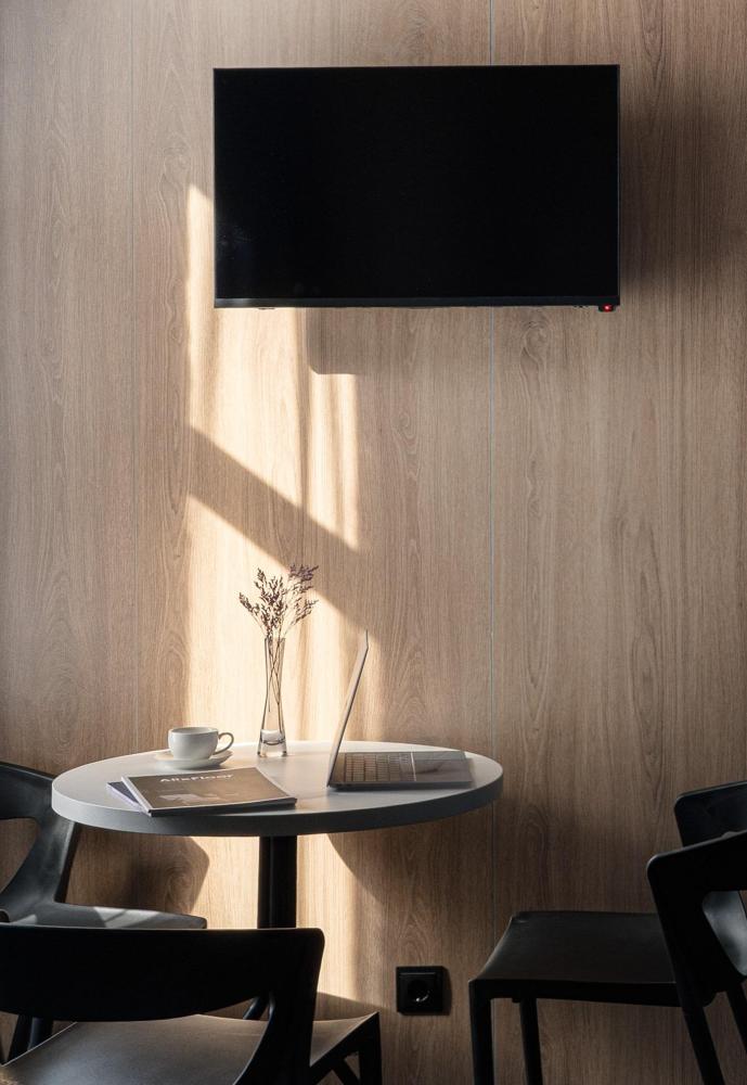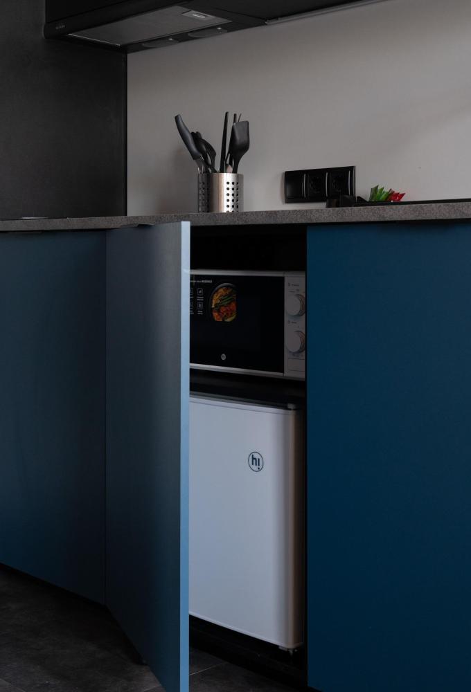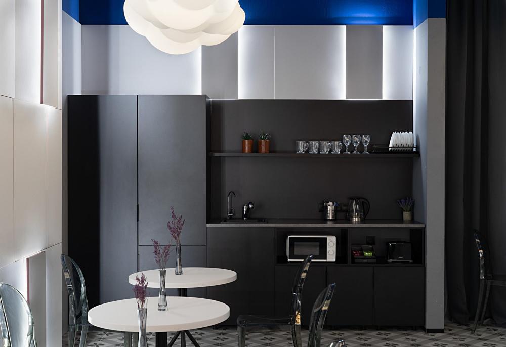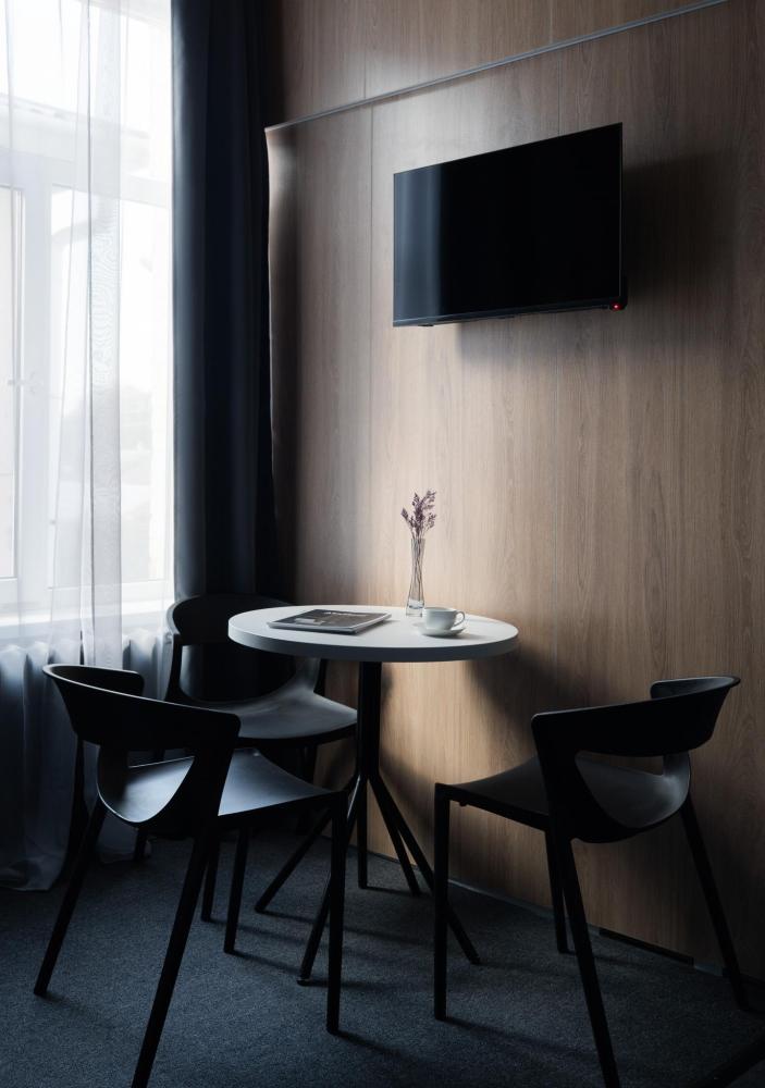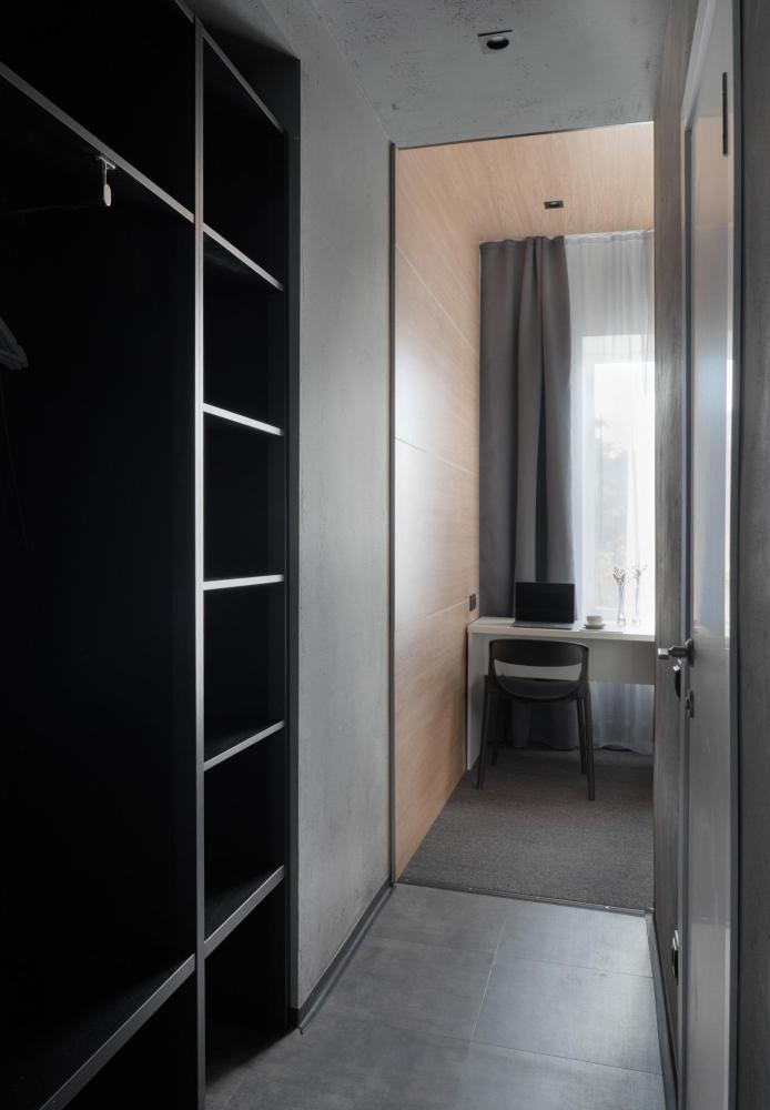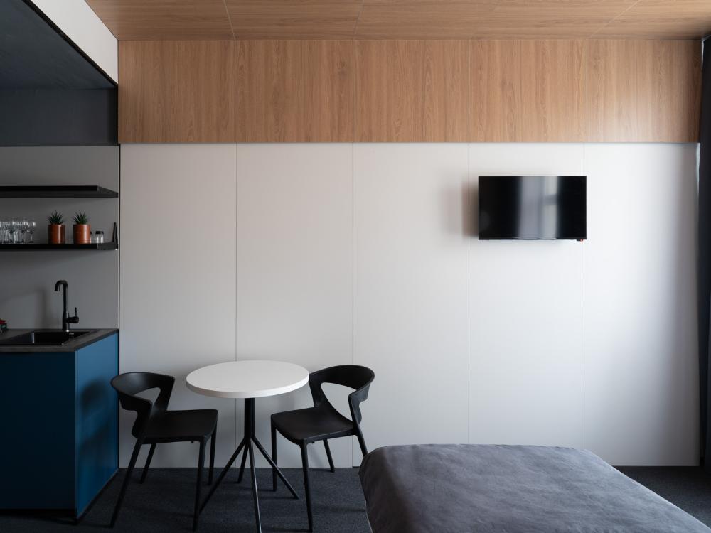 Номер площадью 21 м2. с 1 двуспальной кроватью 160*200 см. и раскладным креслом. Вместимость номера - 3 гостя. В номере: мини-кухня (микроволновая печь, плита, холодильник, посуда, столовые приборы, чайник, тостер), обеденный стол, кондиционер, телевизор, высокие потолки, шкаф, вешалки, зеркало, письменный стол, кофейный столик, стул, тапочки, светонепроницаемые шторы. В ванной комнате: душ, туалет, раковина, полотенца, туалетно-косметические принадлежности, фен.