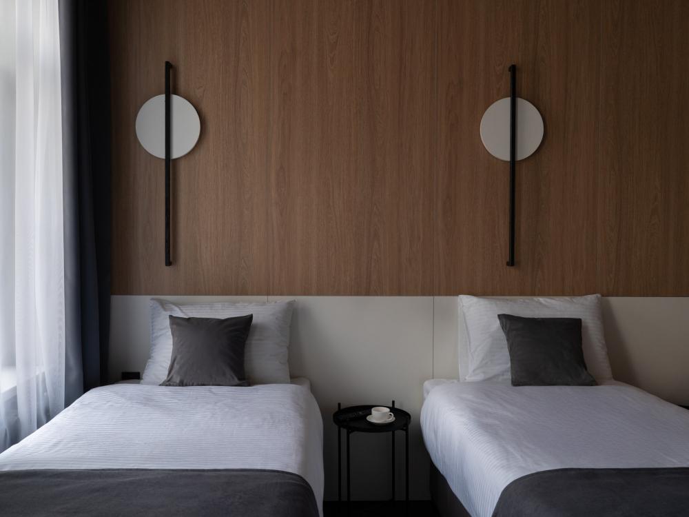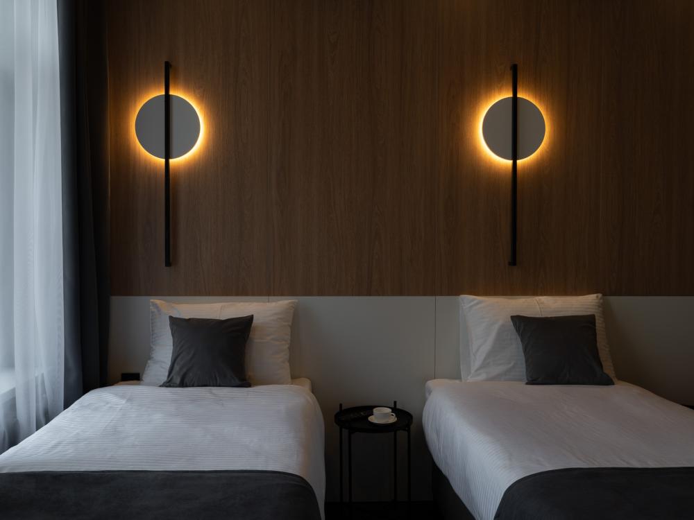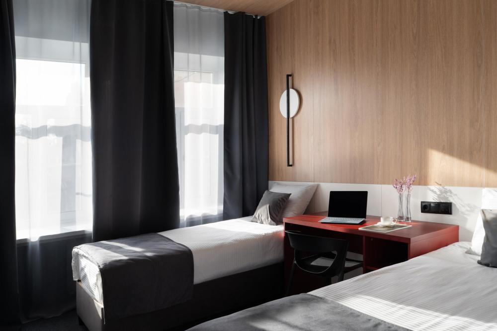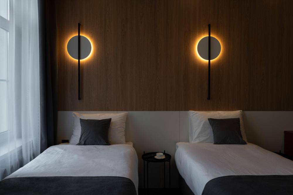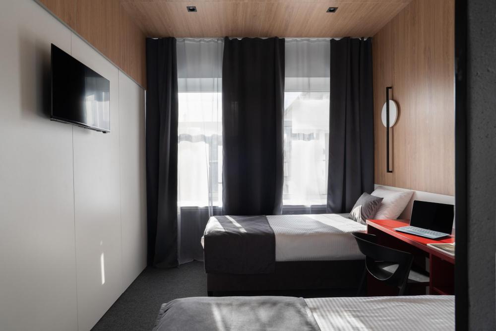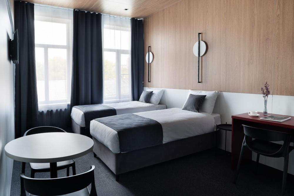 Номер площадью 14 м2. с 2 односпальными кроватями 90*200 см. Вместимость номера - 2 гостя. В номере: кондиционер, телевизор, высокие потолки, шкаф, вешалки, зеркало, письменный стол, стул, тапочки, светонепроницаемые шторы. В ванной комнате: душ, туалет, раковина, полотенца, туалетно-косметические принадлежности, фен.