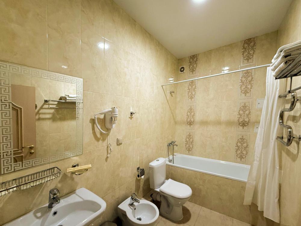 Данная категория 2-х комнатного VIP номера, с общей площадью 60,9 кв.м., оборудована двумя отдельными спальными комнатами на 1+3 гостей, гостиным уголком, чайником, холодильником. LCD телевизор ЖК LED, 40 Wi-Fi Фен Туалетные принадлежности ванна биде Халат и тапочки
