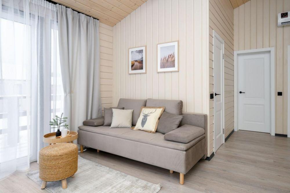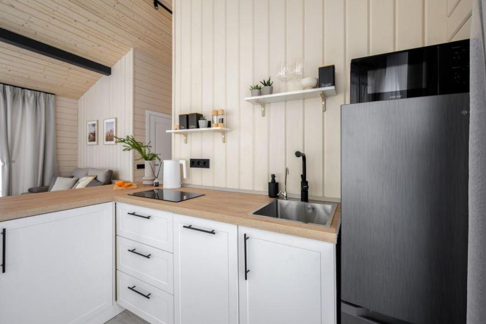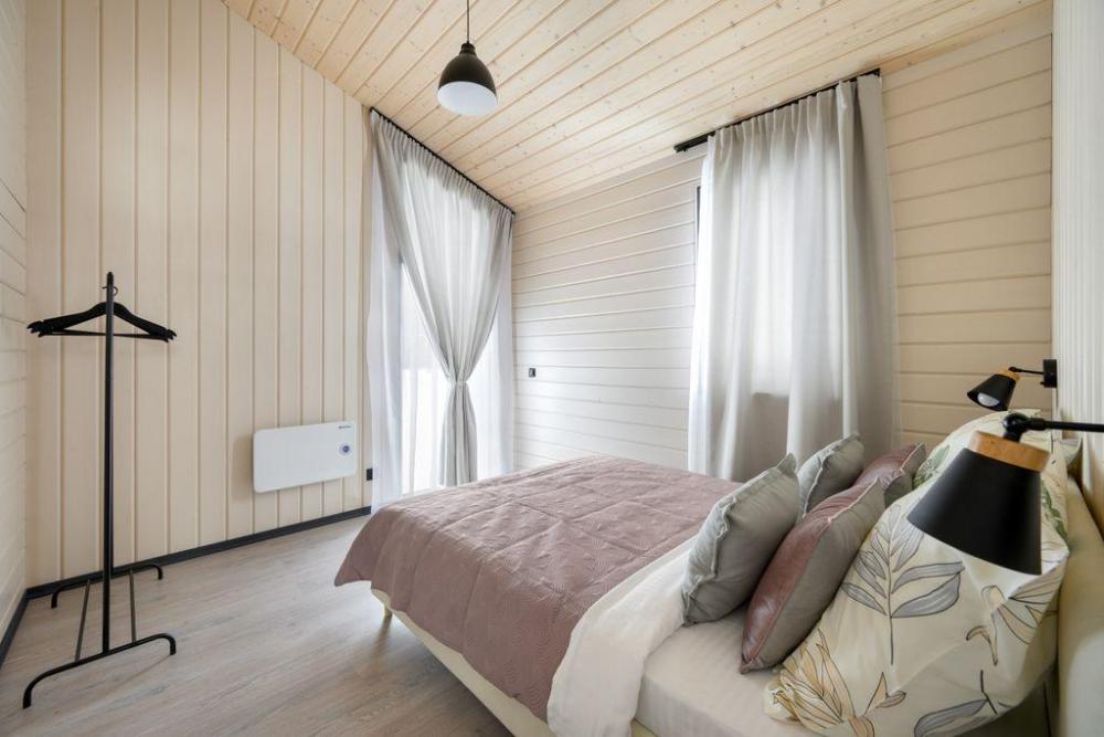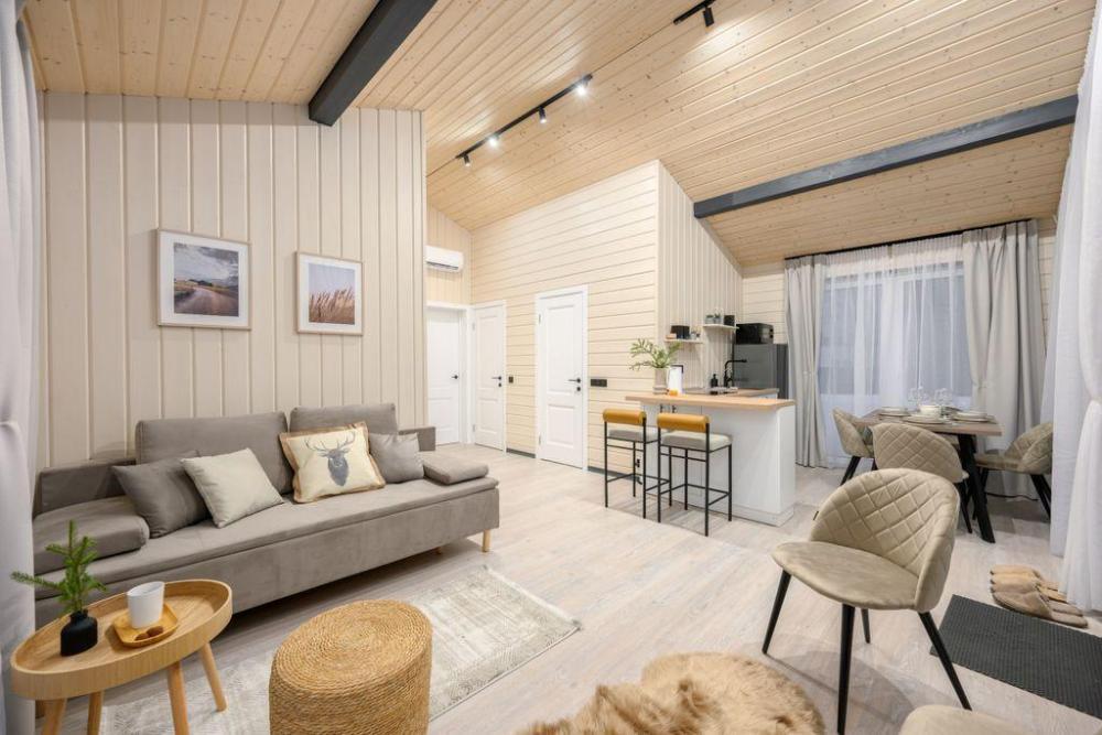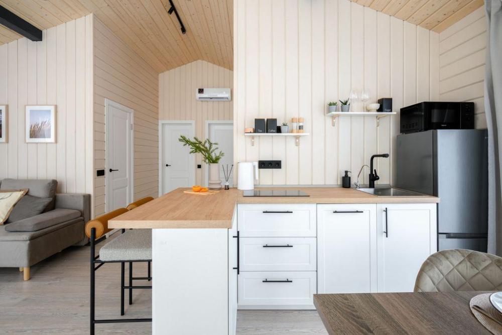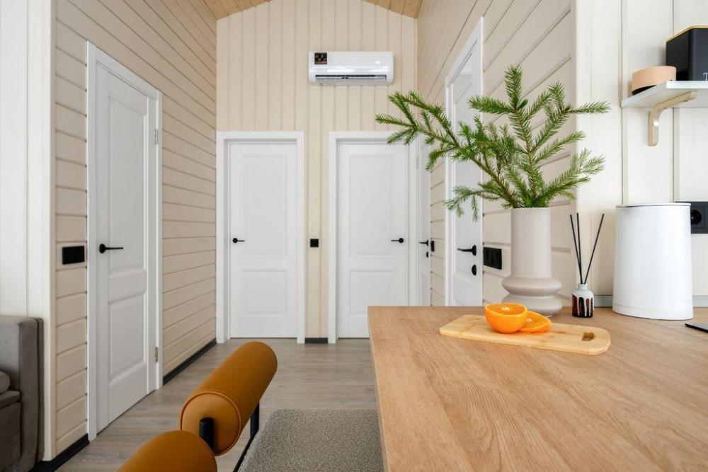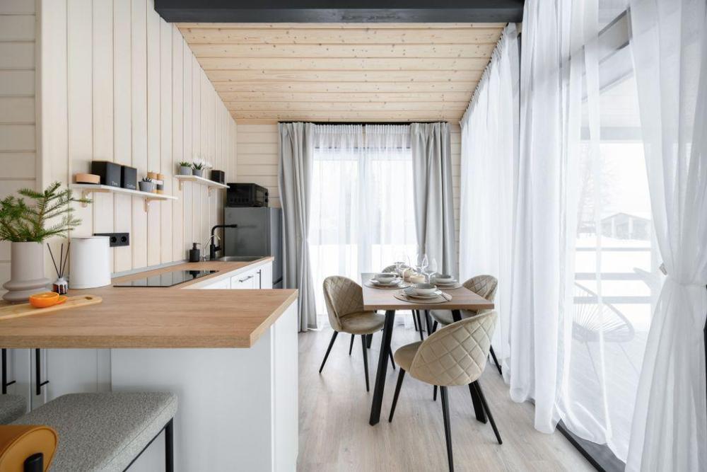Пространство для жизни и отдыха (80 м² с верандой)Спальные зоны: Спальня 1 - двуспальная кровать (160×200 см); Спальня 2 - двуспальная кровать (140×200 см); Гостиная - раскладной диван (вмещает 2 человек). Общие зоны: Отдельная кухонно-столовая зона - место для уютных ужинов; Просторная веранда с двумя садовыми креслами; Рабочий стол - для комфортной удалённой работы. Во всех комнатах - панорамное остекление: наслаждайтесь видами на лес из любого уголка дома. Комфорт, продуманный до мелочей. Кухня (всё включено): Вместительный холодильник; Индукционная плита; Посудомоечная машина; Свч, чайник; Вся необходимая посуда и бокалы; Базовые продукты: чай, кофе, сахар, соль, масло.