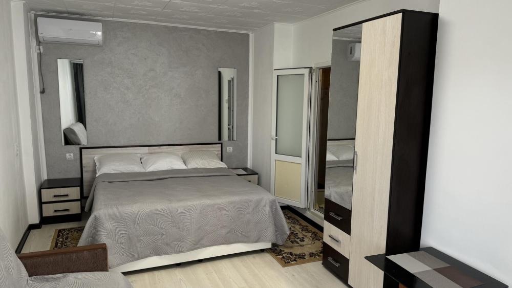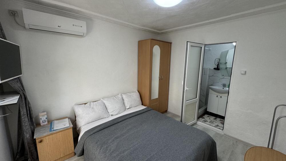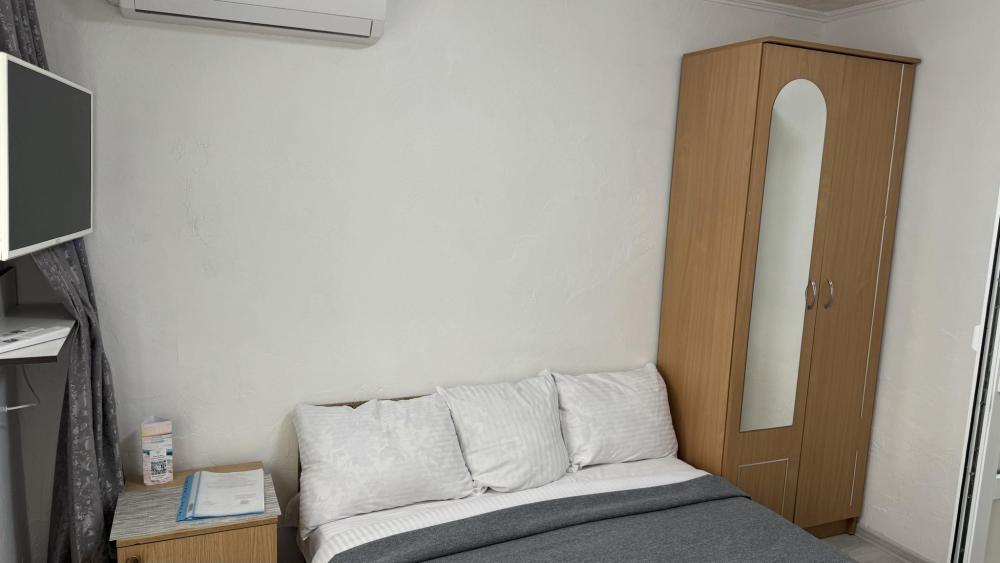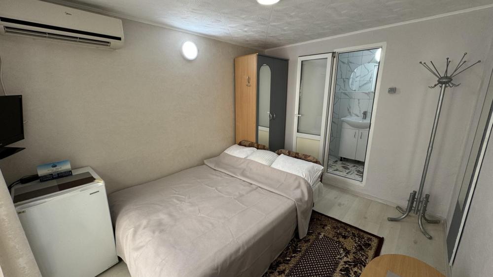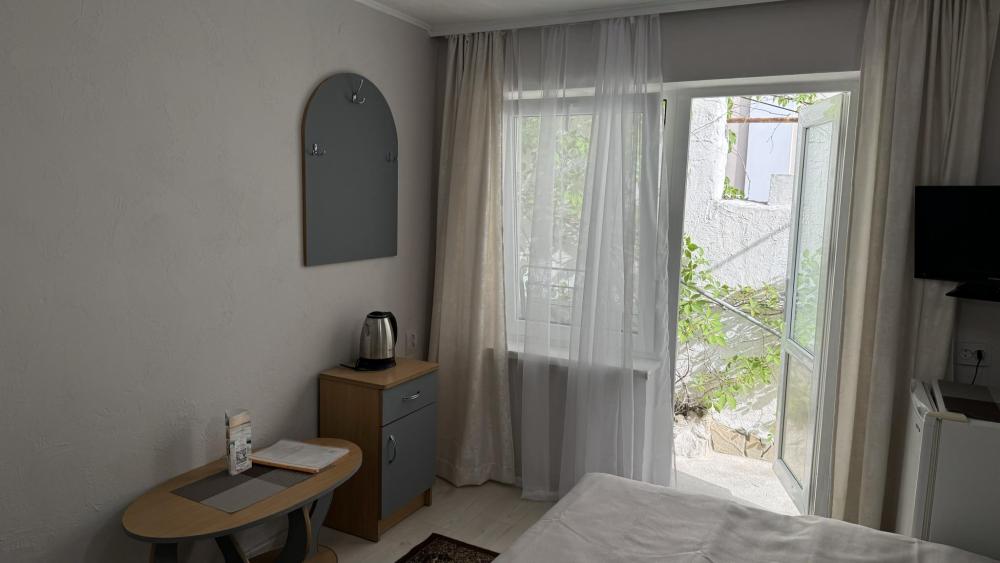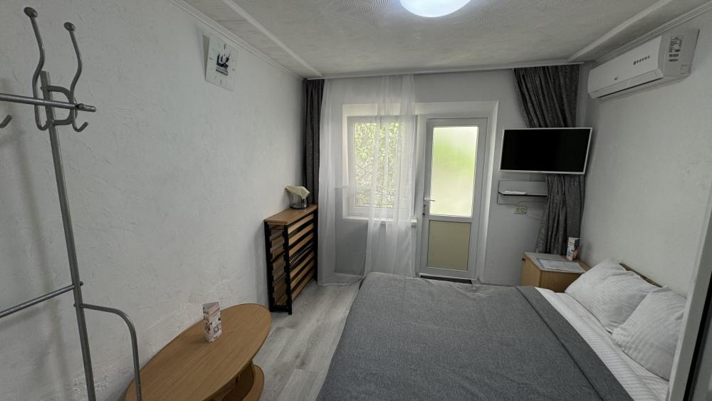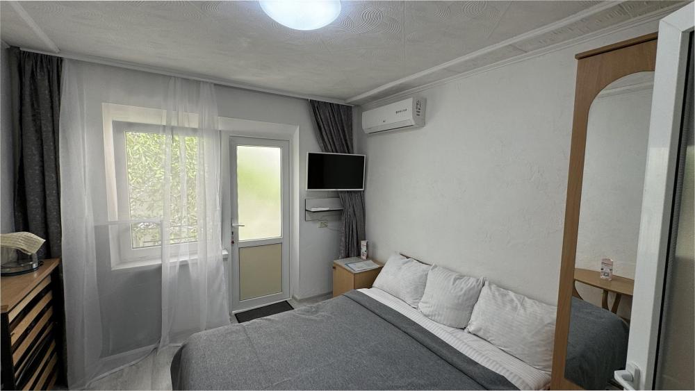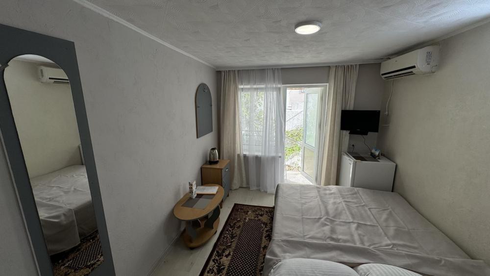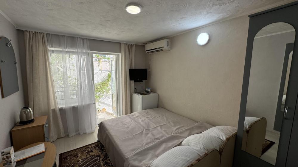 Услуги и удобства: 1 двуспальная, телевизор, холодильник, кондиционер, столик, электрический чайник, белье, полотенца, шкаф, тумба, дополнительные одеяла, душ и туалет в номере. Мебель на улице, общая кухня(на два номера), обеденная зона на улице, помещение полностью находится на втором этаже.